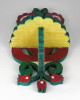 [1L209/UZ-N] Régi, szép állapotú fa fűrészmunka, trikoloros, tulipános és szívekkel díszített falipolc. Akasztási lehetőséggel rendelkezik. Egyik tulipános dísze pótolt. Újrafestett a felülete. Magasság: 27.5 cm Szélesség: 15 cm Súly: 0.225 kg