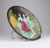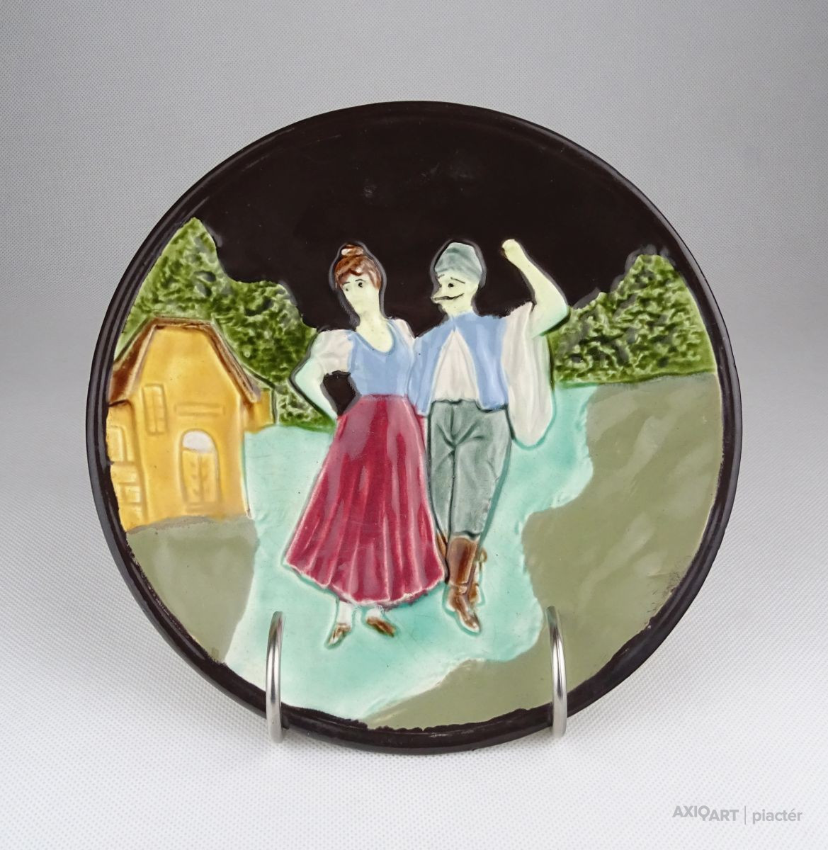 Antik, ritka, falra akasztási lehetőséggel rendelkező falitányér. A tányéron Tabán jellegű utcán táncot járó menyecske és legény plasztikus díszítése található.