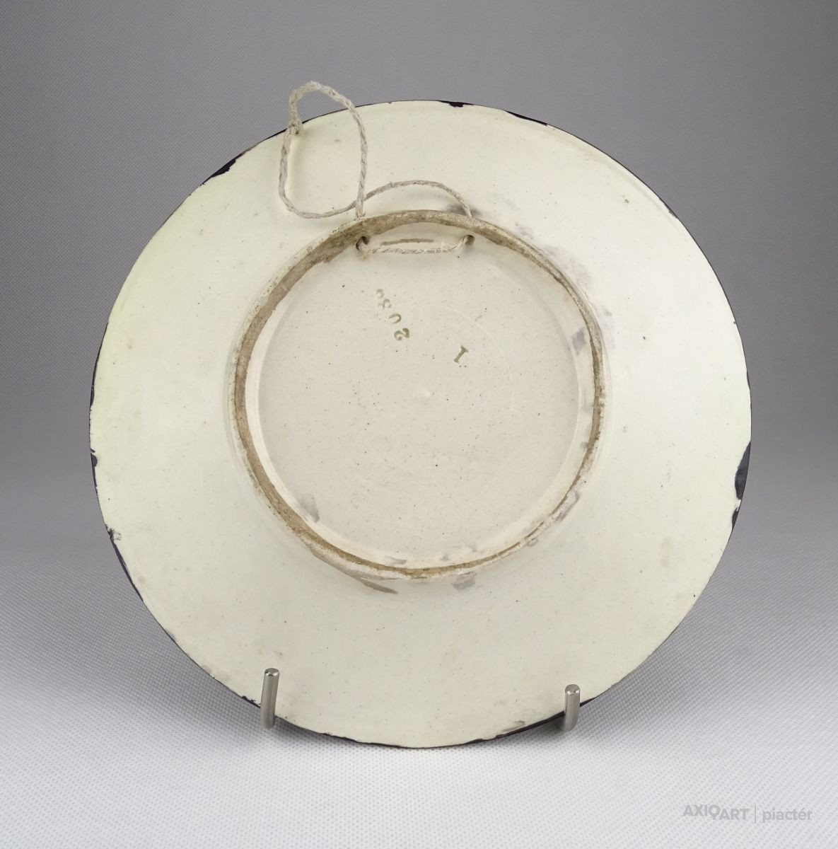 [0T965/UZ-N] Antik, ritka, falra akasztási lehetőséggel rendelkező falitányér. A tányéron Tabán jellegű utcán táncot járó menyecske és legény plasztikus díszítése található. Alján mélynyomással formaszám: 2036 1 Szélesség: 19 cm Súly: 0.255 kg