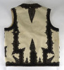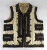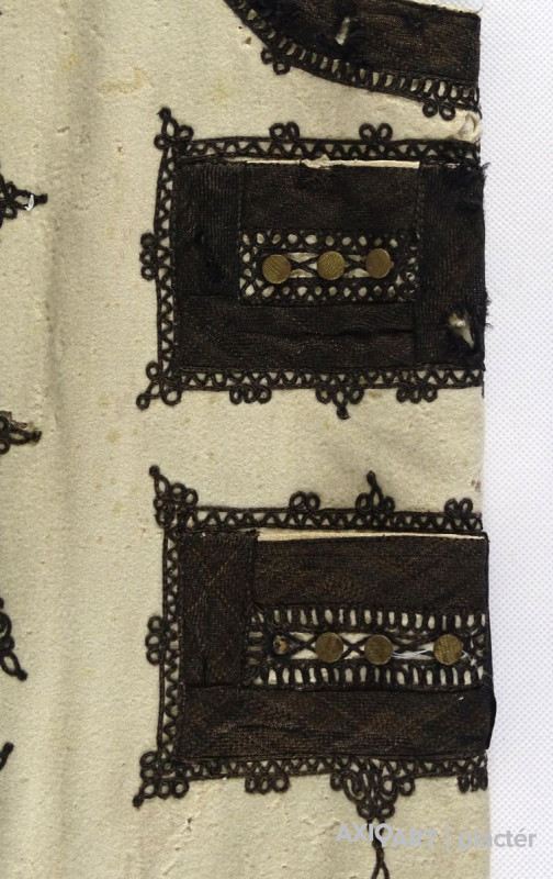 [1K217/UZ-N] Régi, hagyományos népi mellény. Vajszínű halina mellény, rajta fekete részletgazdag hímzett díszítés. Oldalanként 2-2 zsebbel rendelkezik, rajtuk réz gombokkal. Súly: 0.55 kg