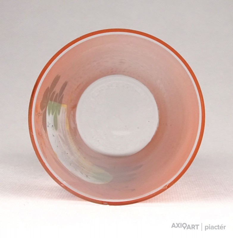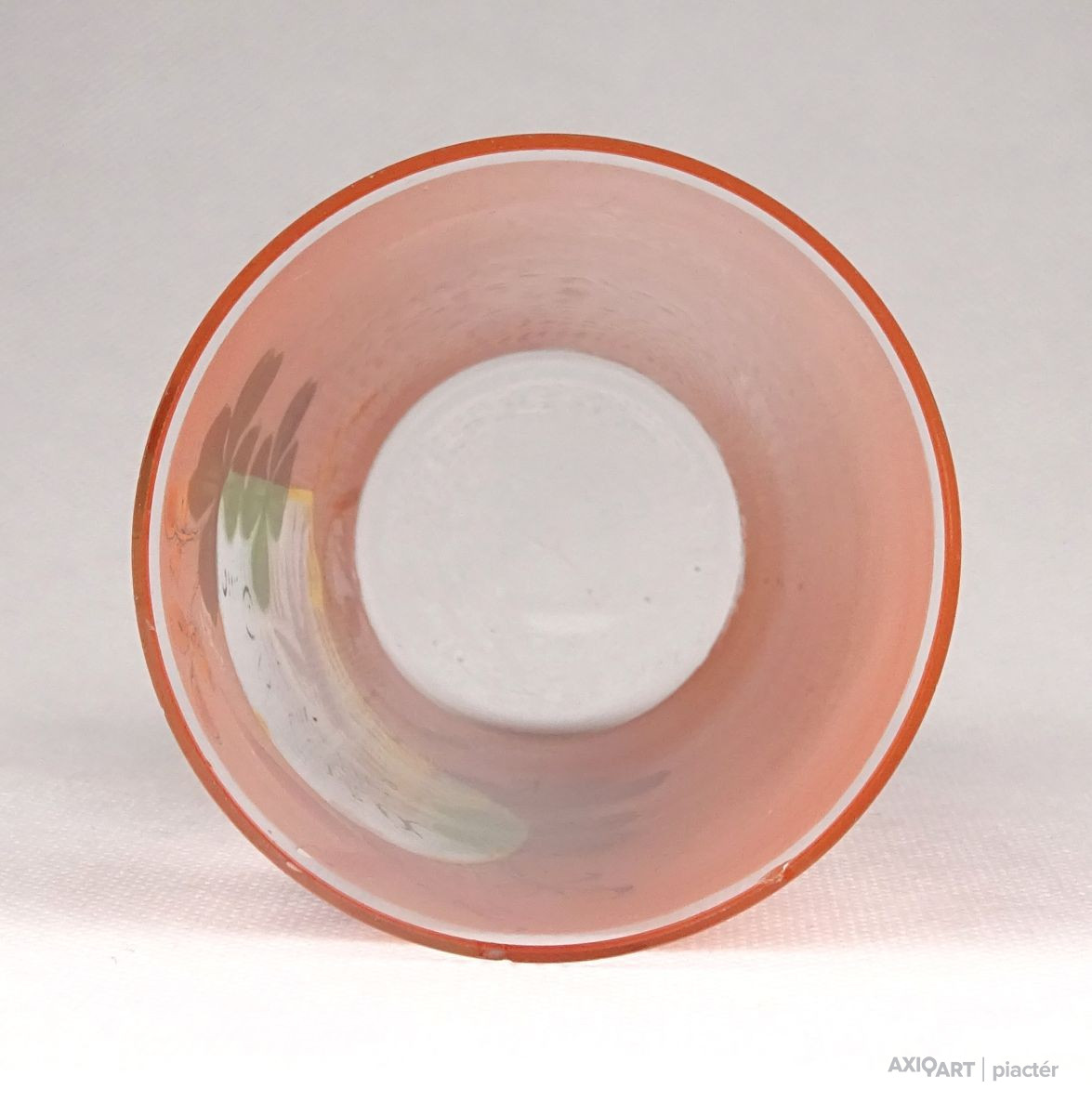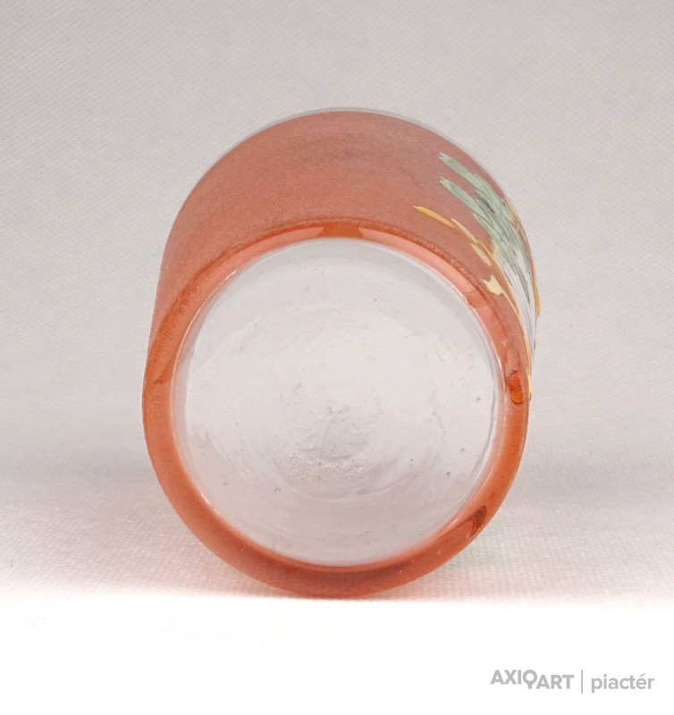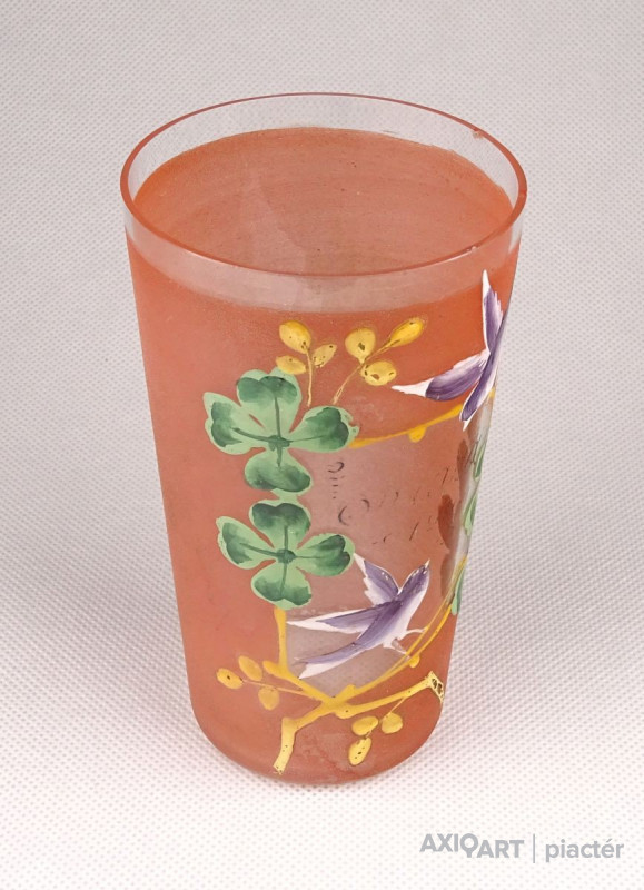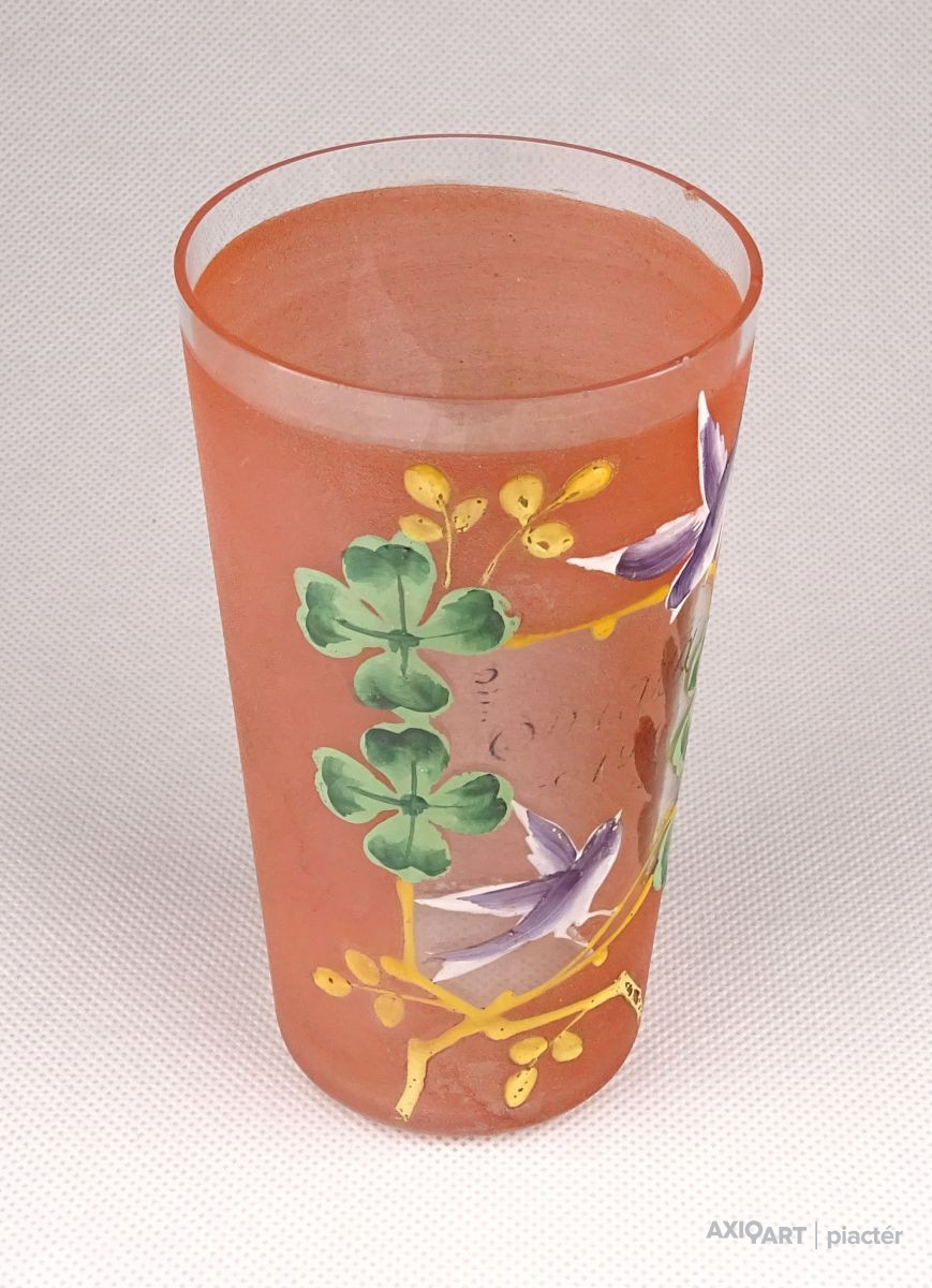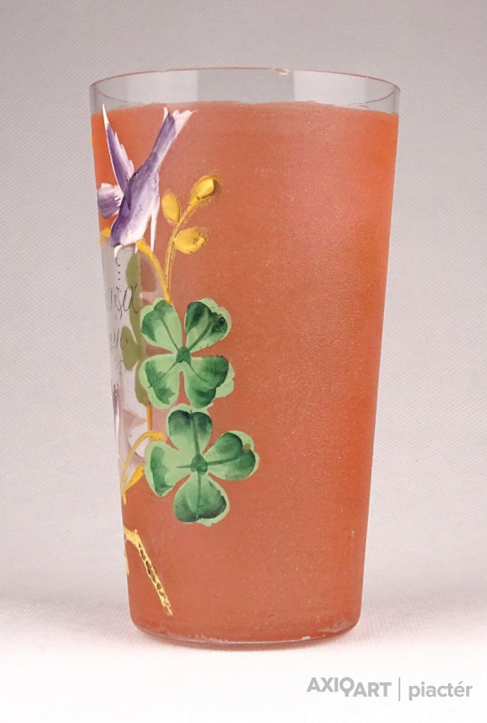[0Z913/UZ-K] Gyönyörű, gazdagon díszített kézi festett virágos üveg pohár. Oldalán festett lóhere és madár díszítés, kopottas női név és dátum: KLÁRA 1916 A pohár peremén két pici lepattanás található. Magasság: 11.3 cm Szélesség: 6.4 cm Súly: 0.09 kg