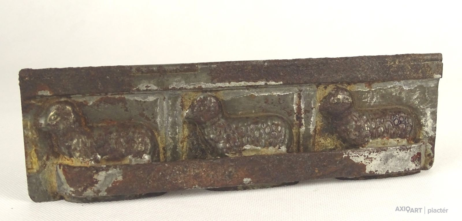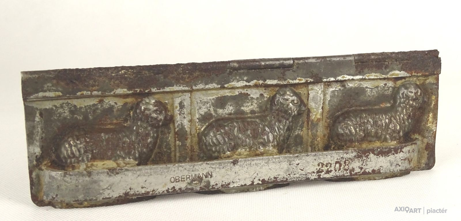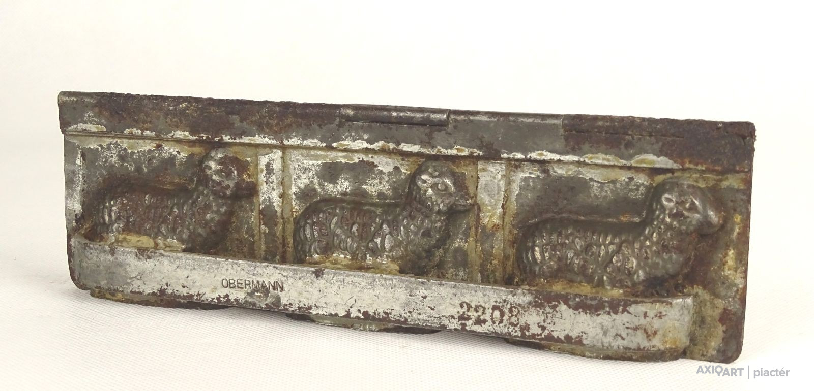 [1G083/X040] Antik bárány alakú csoki öntő forma, cukrászati eszköz. 3 egész bárányka. Gyűjteménybe való darab! Oldalán felirat: OBERMANN 2208 Magasság: 6.5 cm Szélesség: 3 cm Hosszúság: 21.5 cm Súly: 0.386 kg