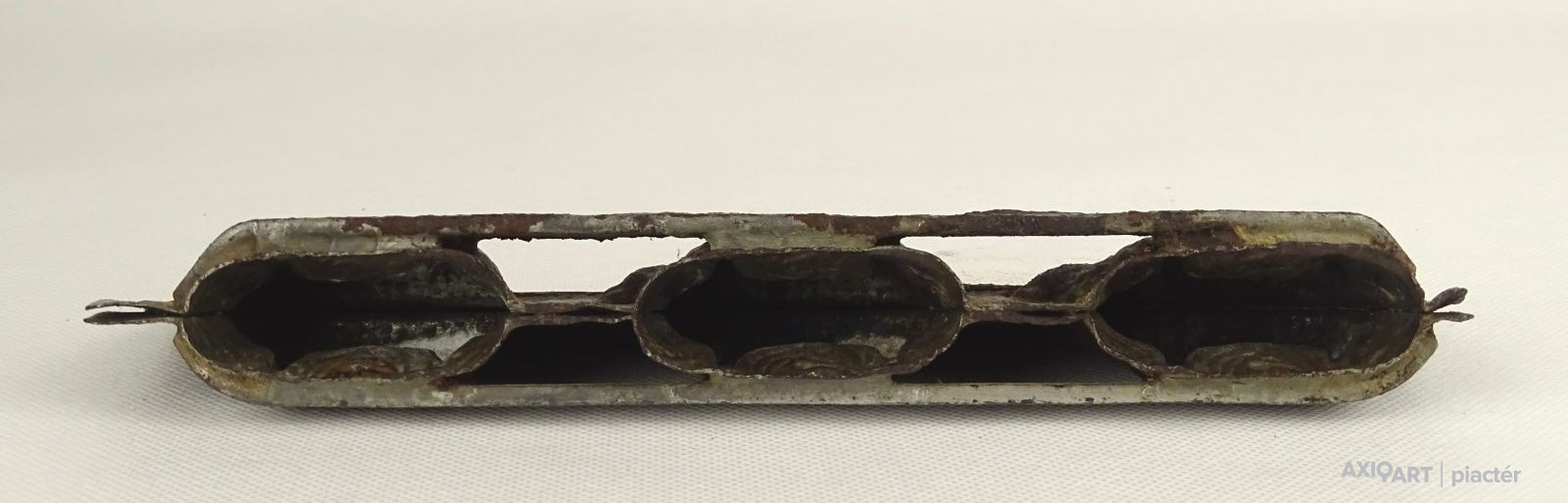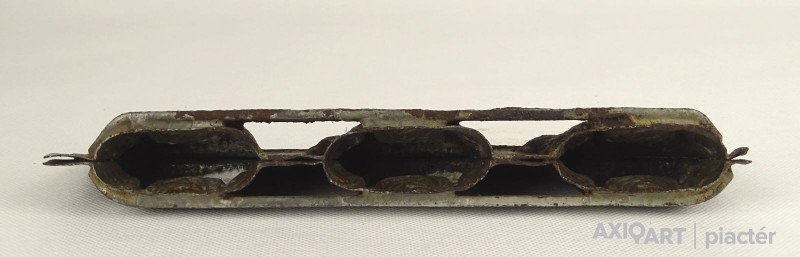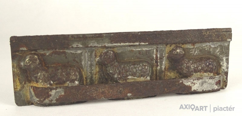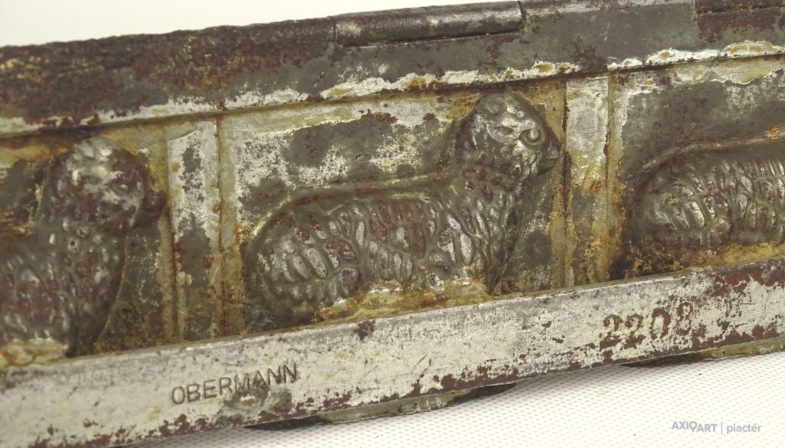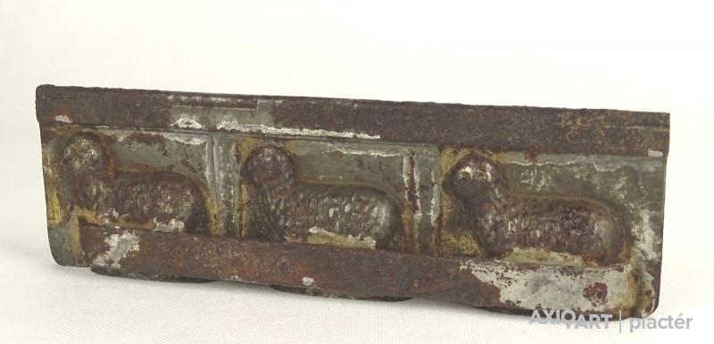 [1G083/X040] Antik bárány alakú csoki öntő forma, cukrászati eszköz. 3 egész bárányka. Gyűjteménybe való darab! Oldalán felirat: OBERMANN 2208 Magasság: 6.5 cm Szélesség: 3 cm Hosszúság: 21.5 cm Súly: 0.386 kg
