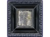 Szép állapotú, antik, ökörszemes keretben található töviskoszorús ezüstözött bronz Jézus plakett.