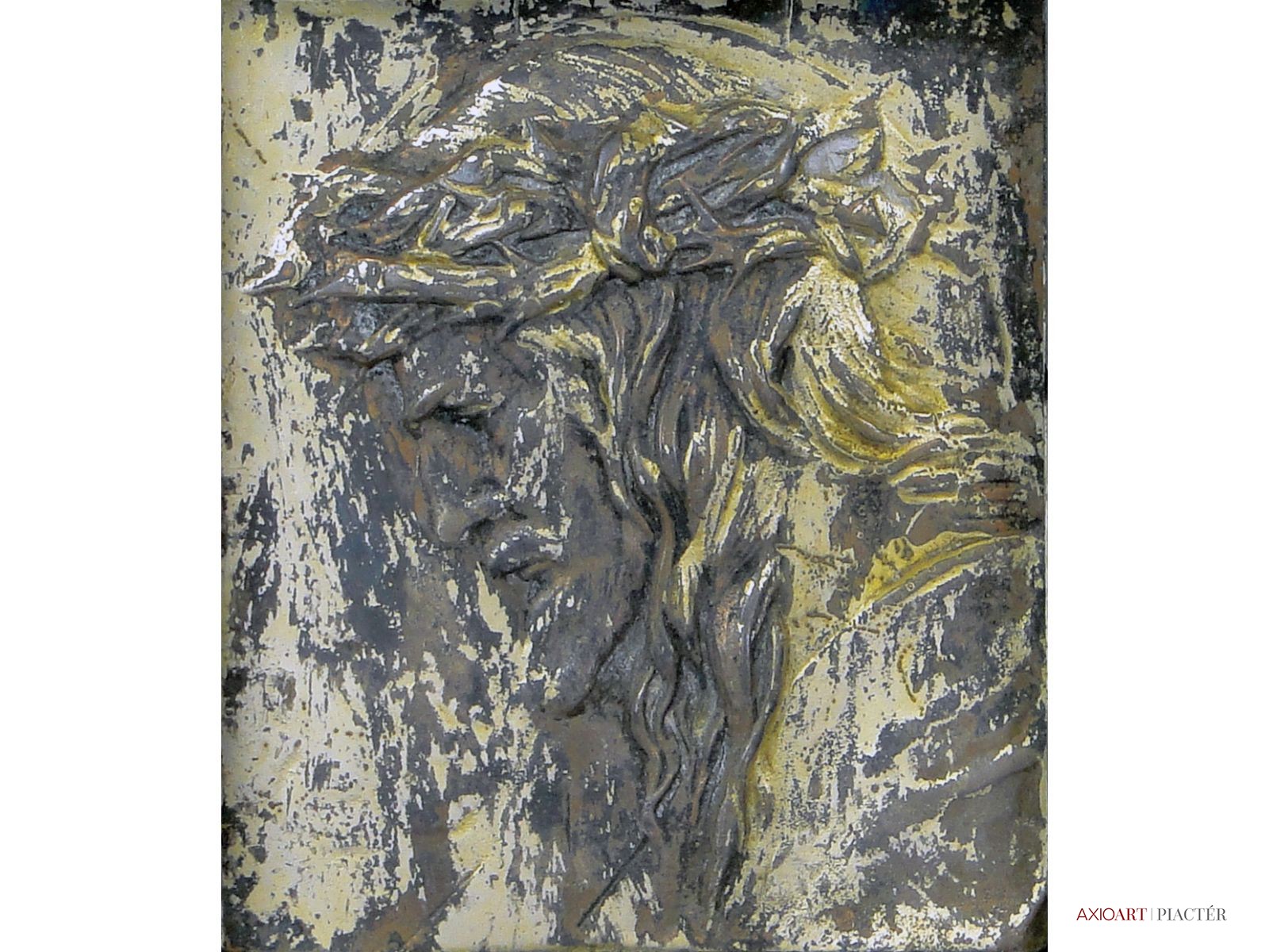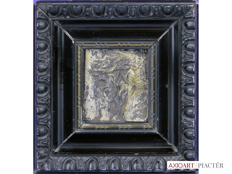 [0F141/X016/4] Szép állapotú, antik, ökörszemes keretben található töviskoszorús ezüstözött bronz Jézus plakett. Magasság: 14.5 cm Szélesség: 13.5 cm Súly: 0.313 kg