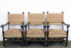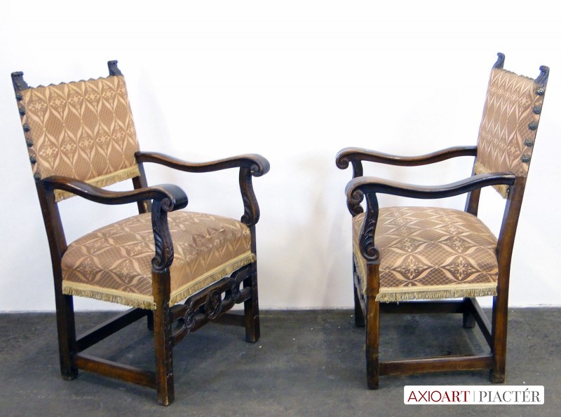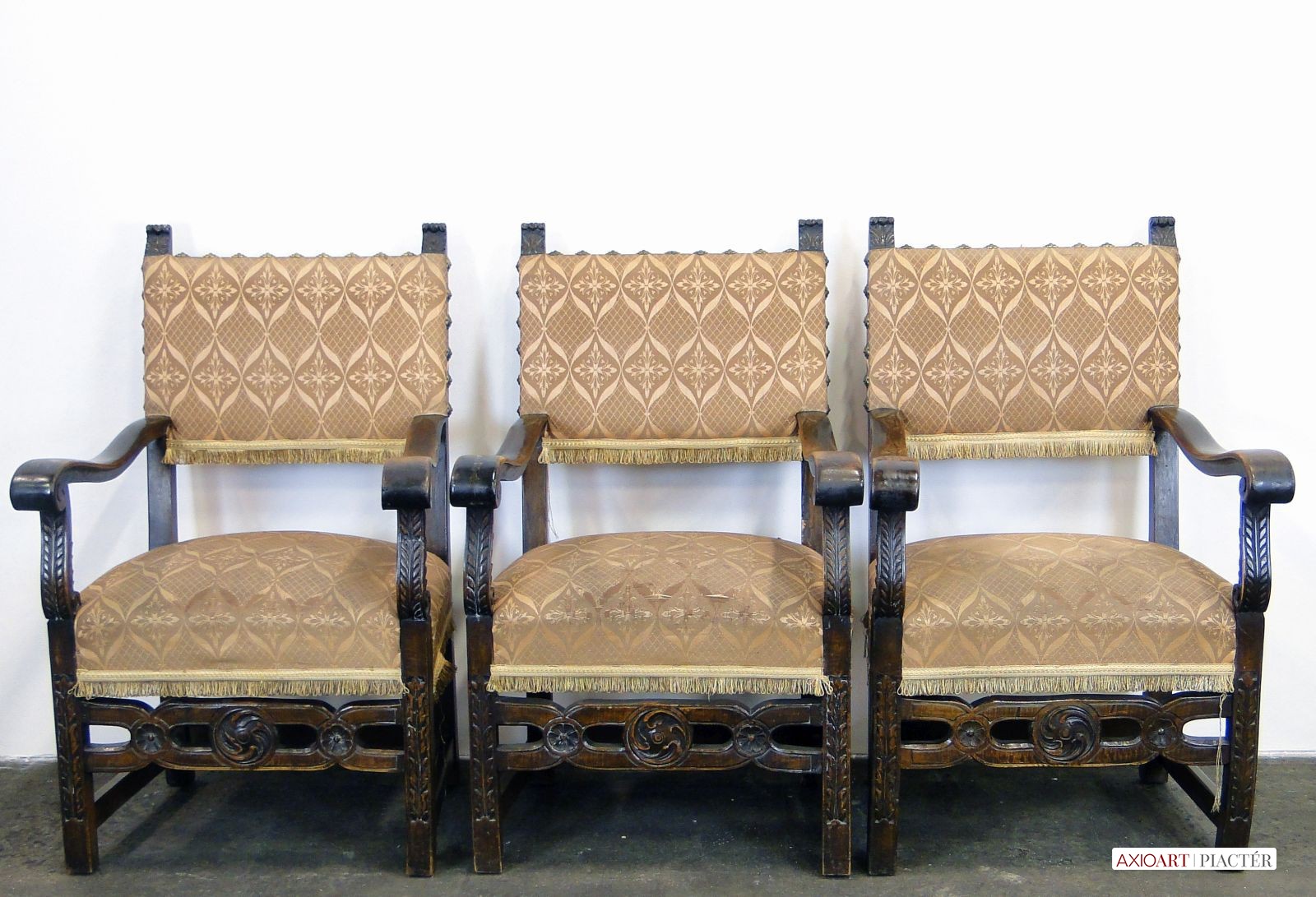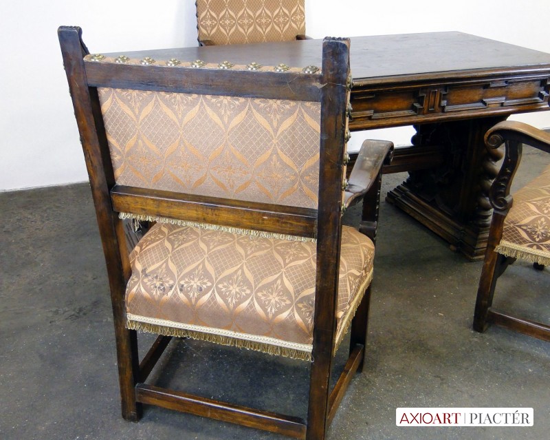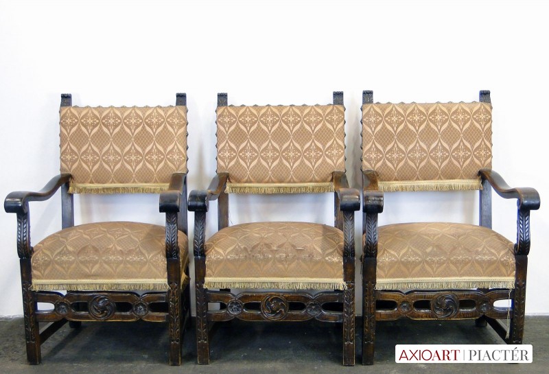 - Az íróasztalhoz 3 darab karfás, faragott díszes fotel tartozik. 1 darab az íróasztal elé, 2 db az " ügyfél " oldalon. A fotelek kárpitozása egységes, ülőfelületük epeda rugós, kényelmes. A kárpit körben nagyméretű, réz veretekkel díszített, az egyik szék tetején ehy ilyen szegecs hiányzik . Karfája ívelt, hajlított. A székek nagyméretűek, stabil szerkezetűek.