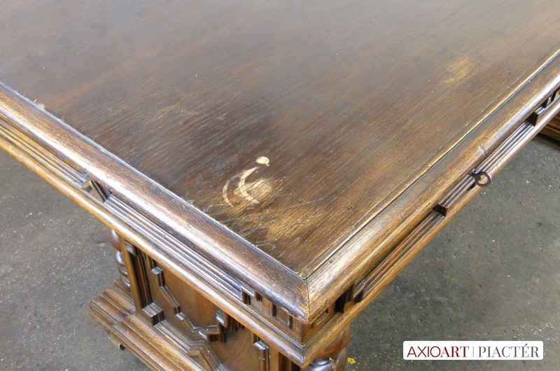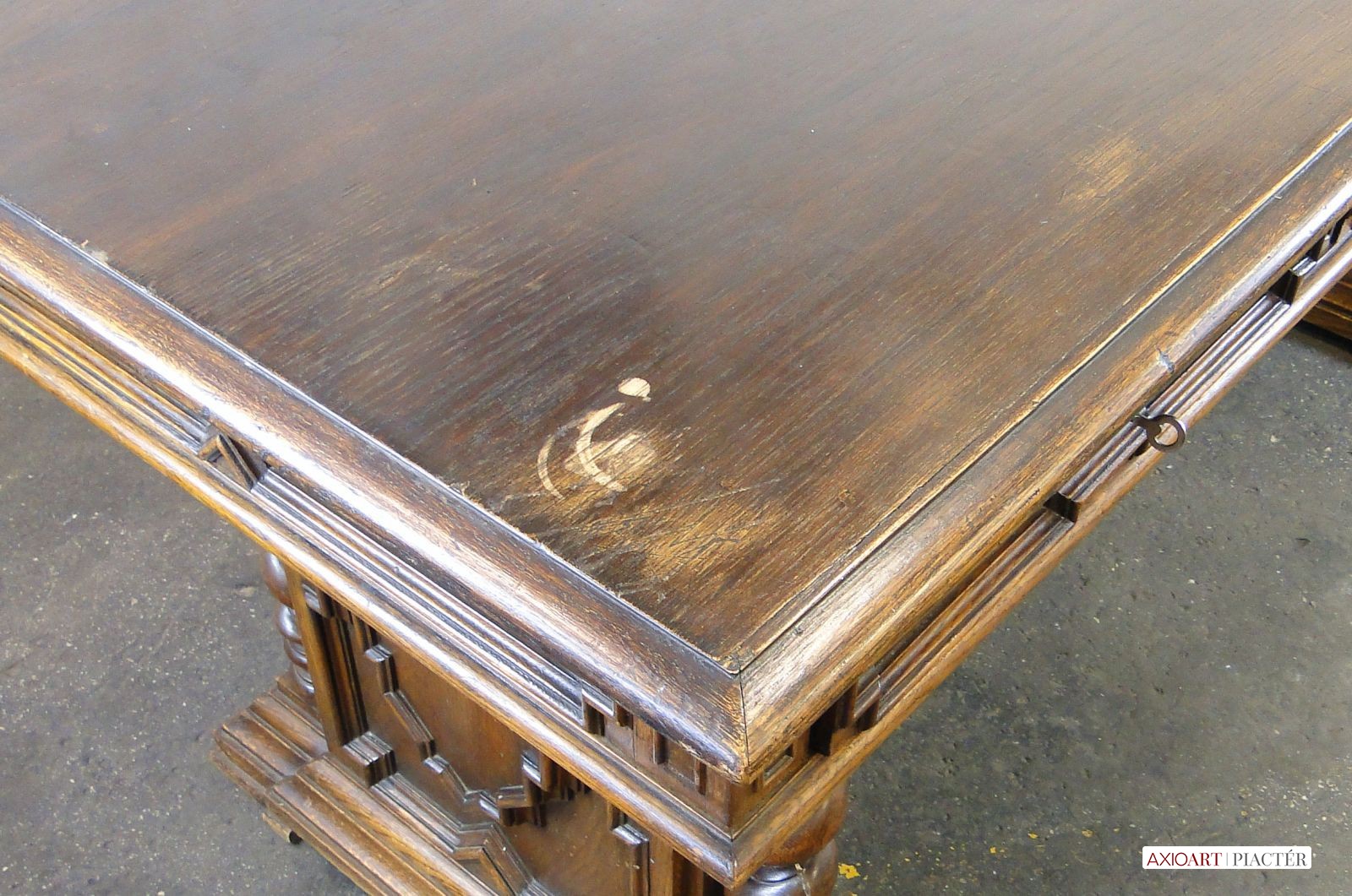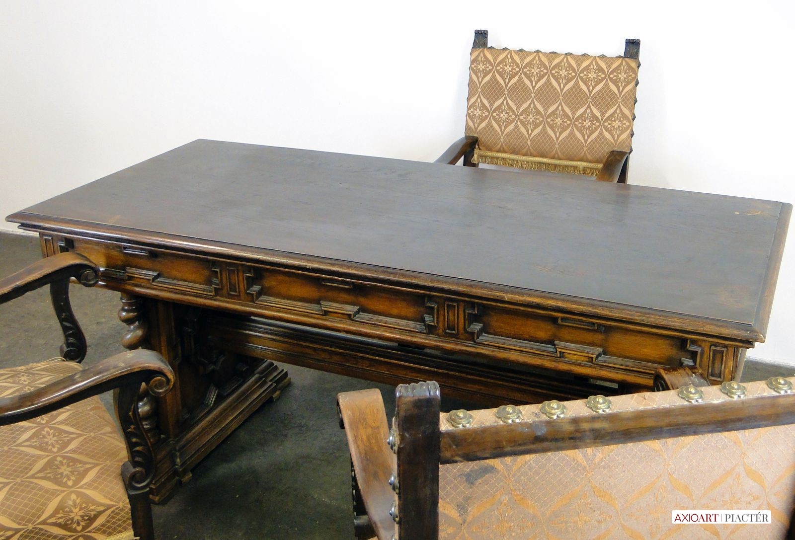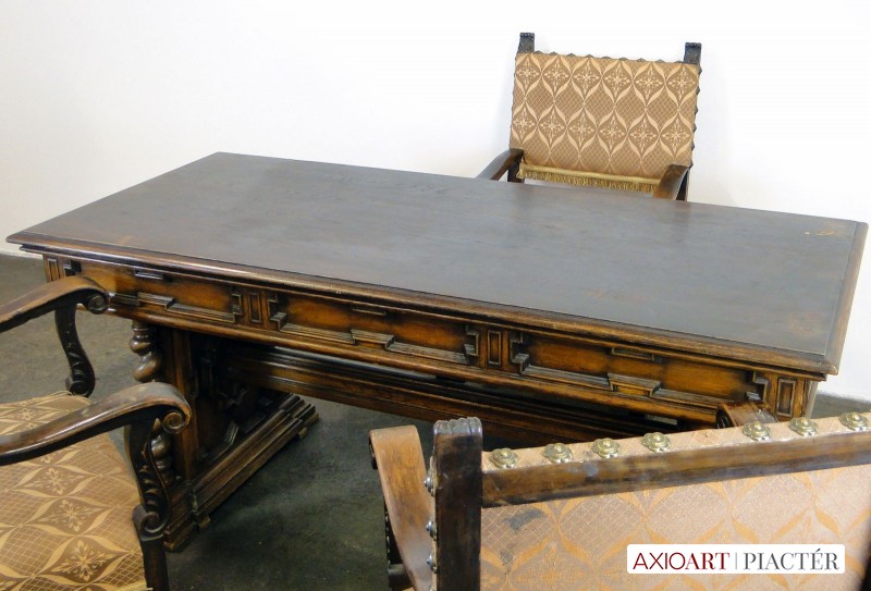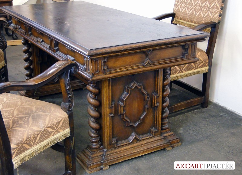 - 1 darab térbe helyezhető csavart oszlopos, faragványokkal gazdagon díszített kazettás, három fiókos masszív, nagyméretű íróasztal. A fiókok zárral rendelkeznek ( 2 db ) ( magassága: 80 cm, szélessége: 181 cm, mélysége: 80,5 cm. )