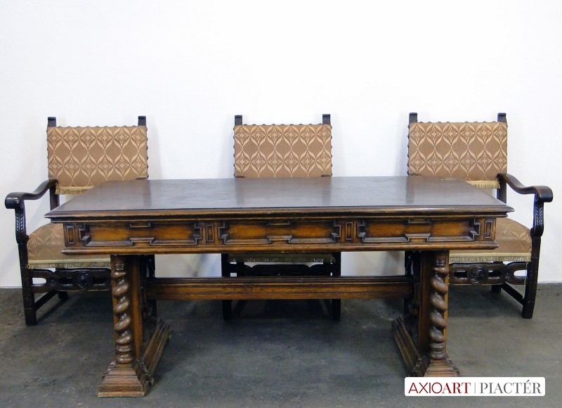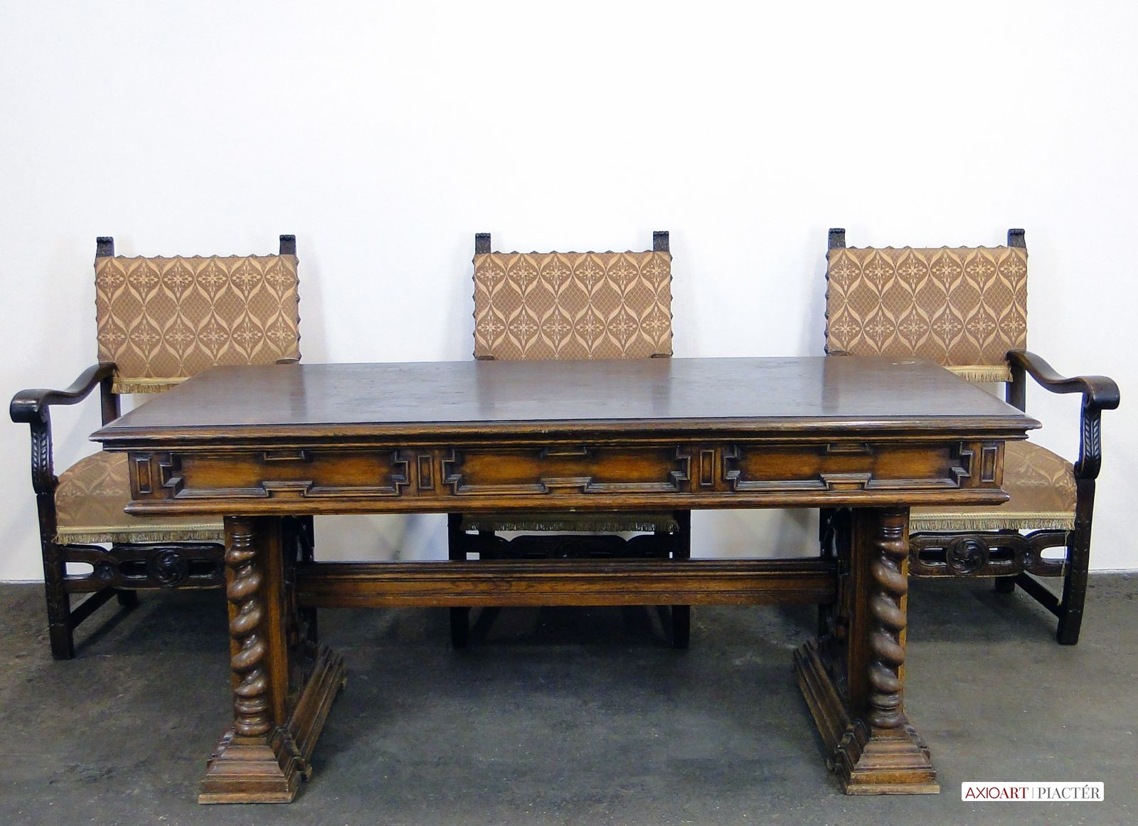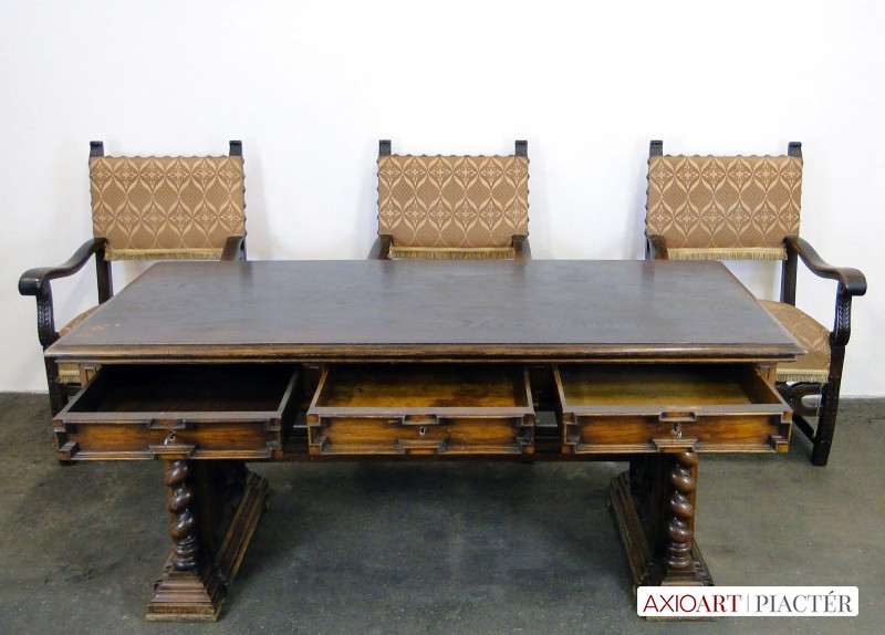 [0E196/KCS] Gyönyörű, ónémet négydarabos iroda, dolgozó szobai bútor garnitúra eredeti, felújítatlan állapotban. Garnitúra darabjai: - 1 darab térbe helyezhető csavart oszlopos, faragványokkal gazdagon díszített kazettás, három fiókos masszív, nagyméretű íróasztal. A fiókok zárral rendelkeznek ( 2 db ) ( magassága: 80 cm, szélessége: 181 cm, mélysége: 80,5 cm. ) - Az íróasztalhoz 3 darab karfás, faragott díszes fotel tartozik. 1 darab az íróasztal elé, 2 db az " ügyfél " oldalon. A fotelek kárpitozása egységes, ülőfelületük epeda rugós, kényelmes. A kárpit körben nagyméretű, réz veretekkel díszített, az egyik szék tetején ehy ilyen szegecs hiányzik . Karfája ívelt, hajlított. A székek nagyméretűek, stabil szerkezetűek. ( teljes magassága: 108 cm, szélessége: 66 cm, mélysége: 60 cm, ülőfelület magassága: 52 cm, ülőfelület mélysége: 49 cm, ülőfelület szélessége: 55 cm, támla magassága az ülőfelülettől mérve: 53 cm )