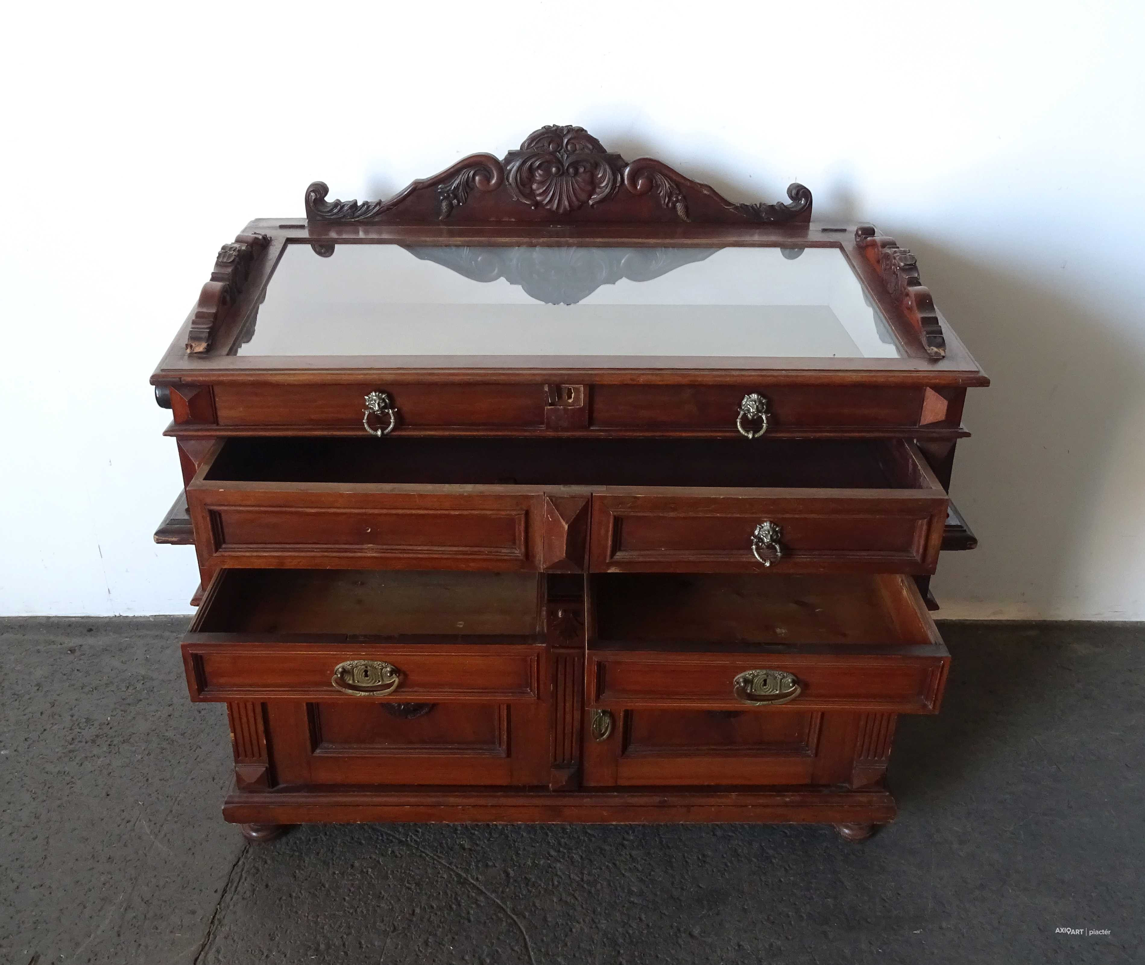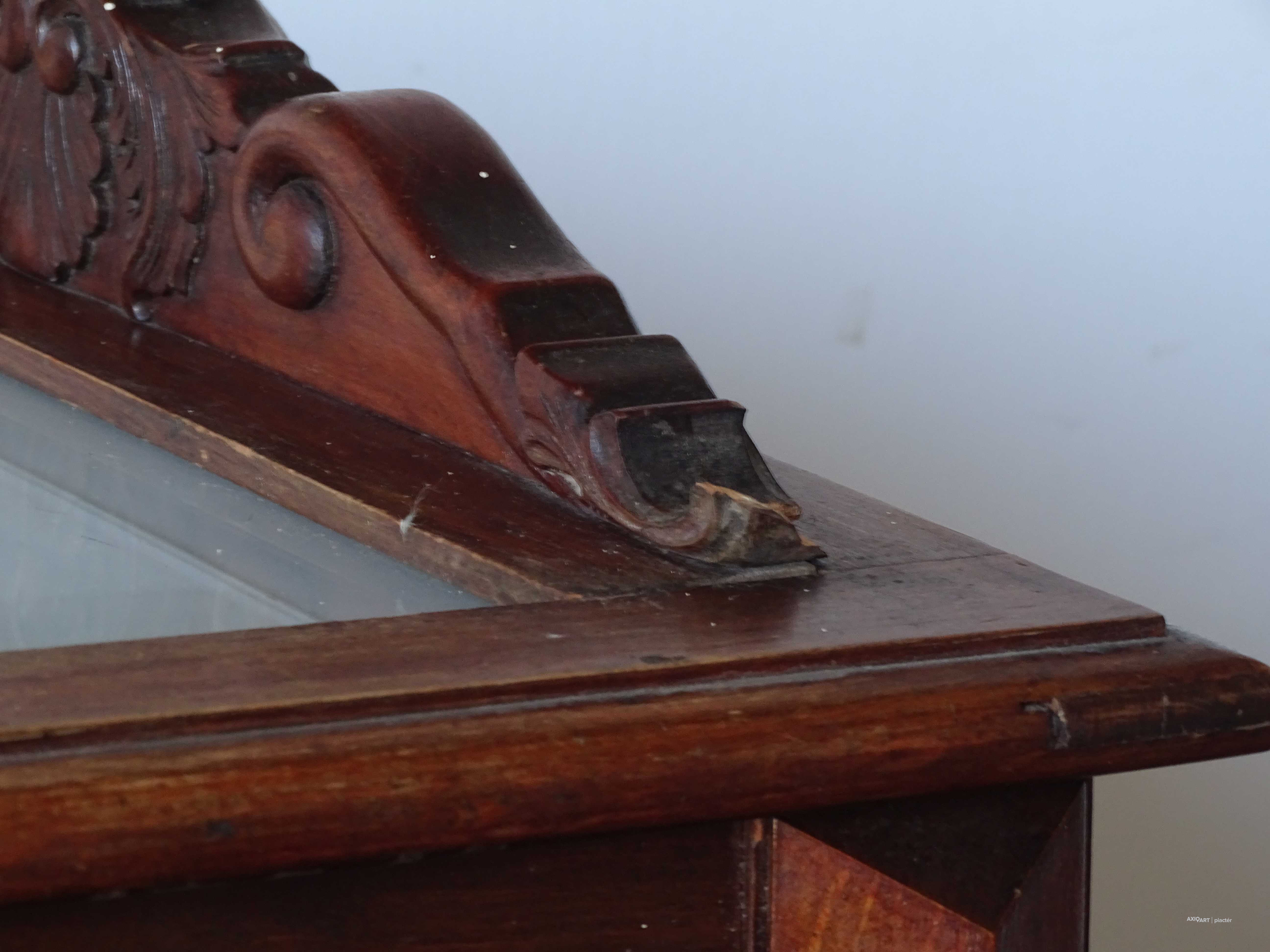 Rendkívül RITKA bútor fajta. Gyűjteményes szekrény felnyitható üvegezett bemutató felülettel. Antik ónémet vitrines komód szép állapotban. Háta osztott, gyalult deszkás. A vitrin felújítatlan, állapotban van, az eredeti vitrinvilágítás van még benne, ezért az elektromos része biztosan korszerűsítésre szorul. Az alsó kétajtós rész zárja működik, a kulcs megvan. A felső vitrines rész zárja és a zárcíme megvan, de sajnos kulcs nincs hozzá. A díszeken kisebb sérülések, hiányok láthatóak. Lásd a fotókon.