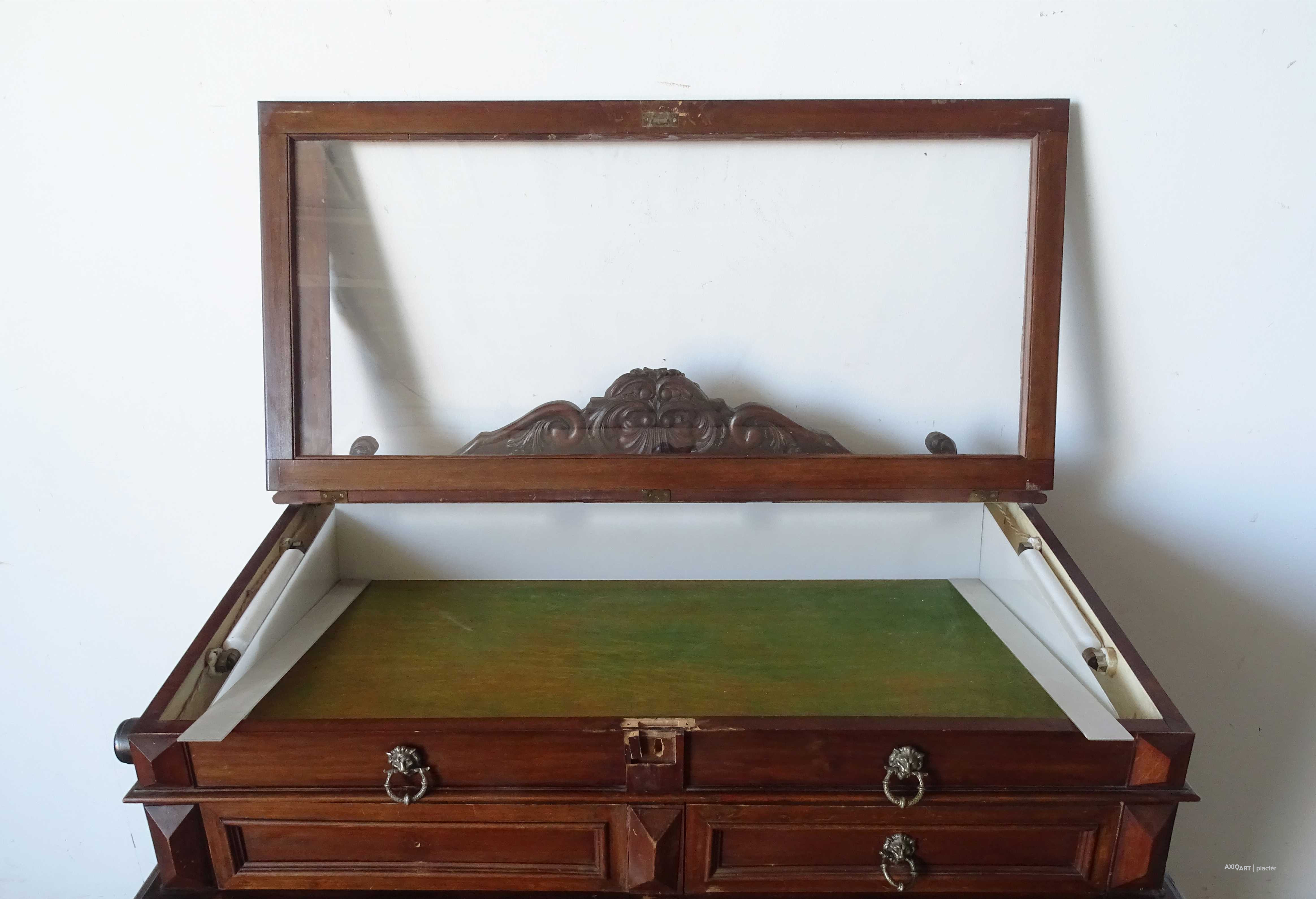 [1U598/UZ-N] Rendkívül RITKA bútor fajta. Gyűjteményes szekrény felnyitható üvegezett bemutató felülettel. Antik ónémet vitrines komód szép állapotban. Háta osztott, gyalult deszkás. A vitrin felújítatlan, állapotban van, az eredeti vitrinvilágítás van még benne, ezért az elektromos része biztosan korszerűsítésre szorul. Az alsó kétajtós rész zárja működik, a kulcs megvan. A felső vitrines rész zárja és a zárcíme megvan, de sajnos kulcs nincs hozzá. A díszeken kisebb sérülések, hiányok láthatóak. Lásd a fotókon. Magasság: 106 cm Szélesség: 68 cm Hosszúság: 133 cm