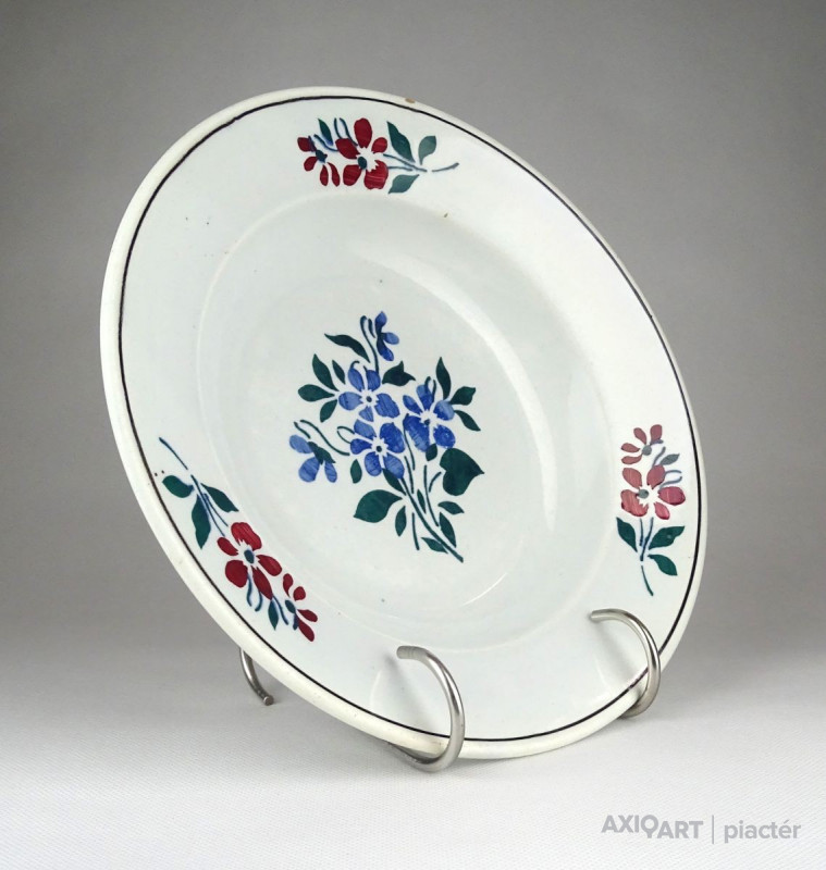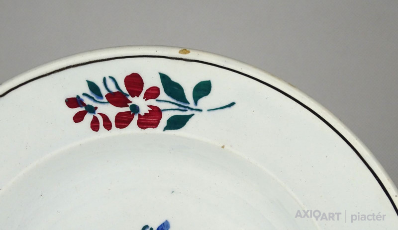 Régi, kézi festéssel díszített, virágdíszes, akasztási lehetőséggel rendelkező, porcelán falitányér az 1900-as évek első feléből. Alján hajszálrepedés található, festett felén nem látható.