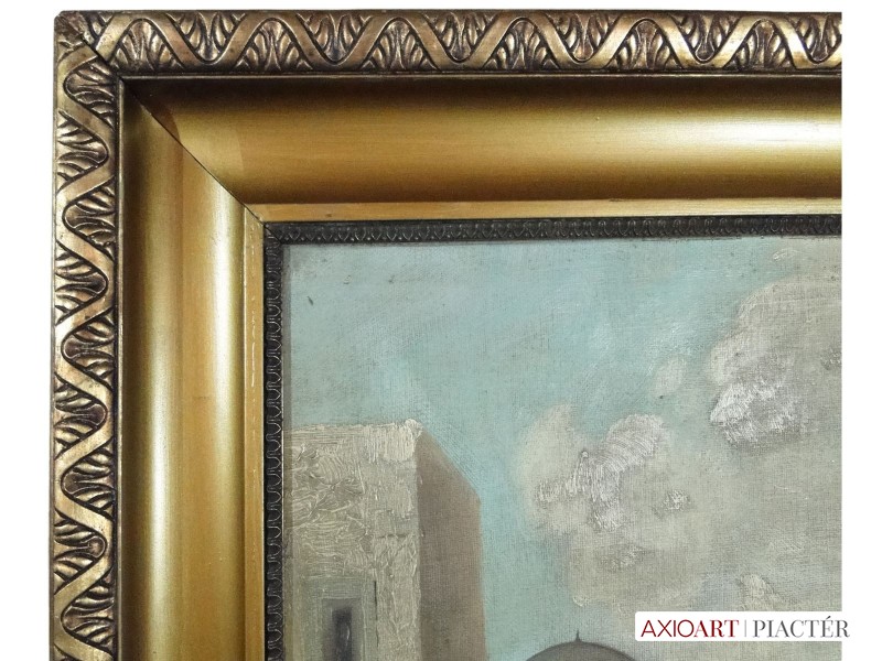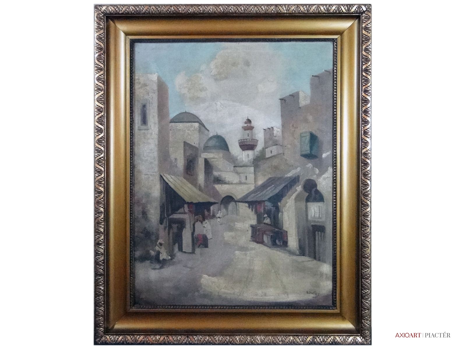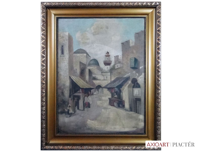 Nagyméretű jelzett olaj vászon festmény, arab utcarészlet.