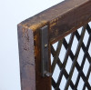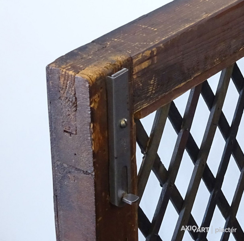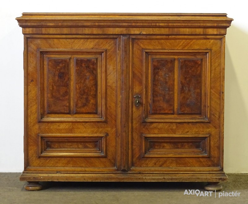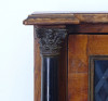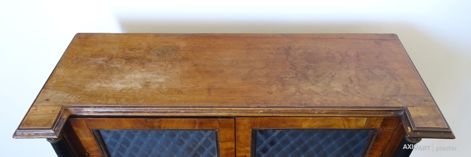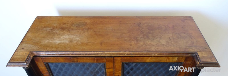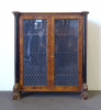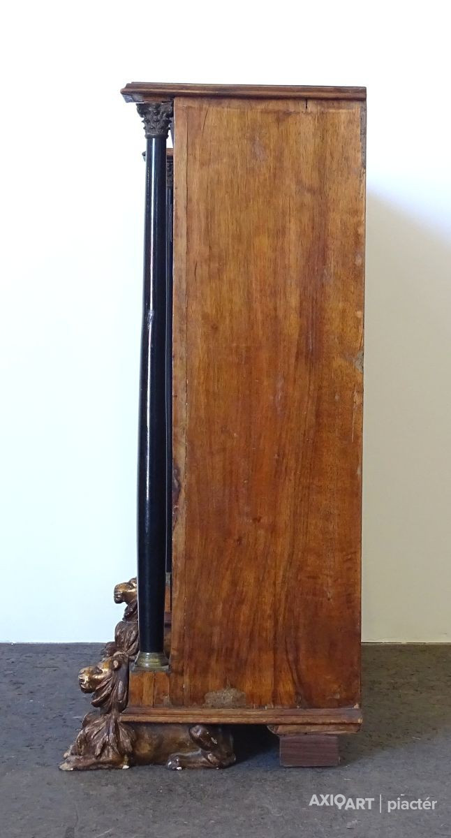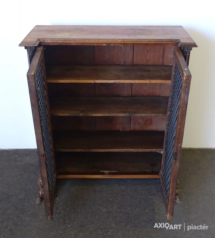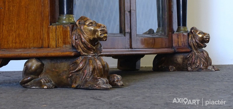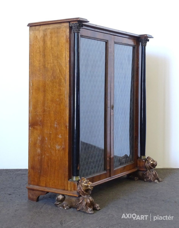 Gyönyörű, antik faragott aranyozott oroszlános lábakon álló, kétoszlopos, apácarácsos üveges, polcos vitrin. A fekete oszlopok korinthoszi bronz oszlopfőkben végződnek. Hátoldala eredeti osztott, csapolt, faragott deszkás.