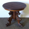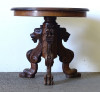 [1Q155/KCS] Antik szép állapotú szalonasztal, körasztal. Hatalmas egy-egy fából faragott szárnyas oroszlán lábon áll. Háromlábú szalonasztal. Keményfából készült asztallapja levehető, lejár. Magasság: 79 cm Szélesség: 85 cm