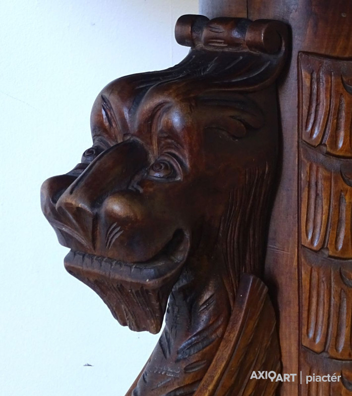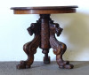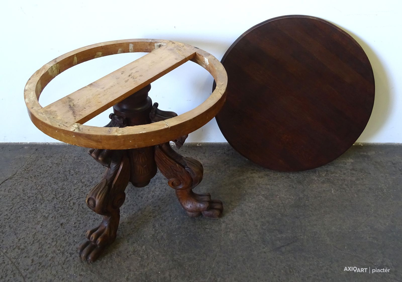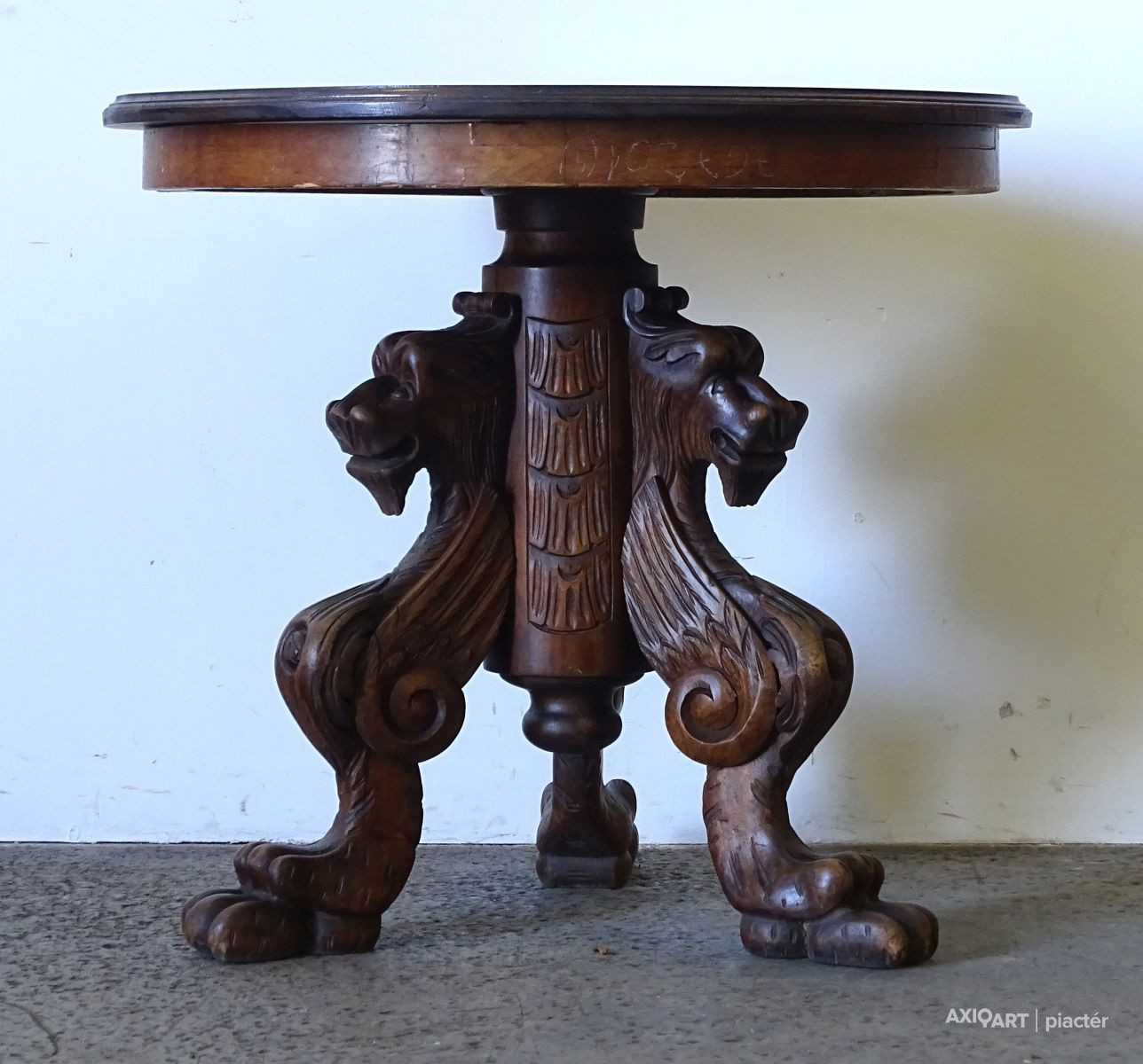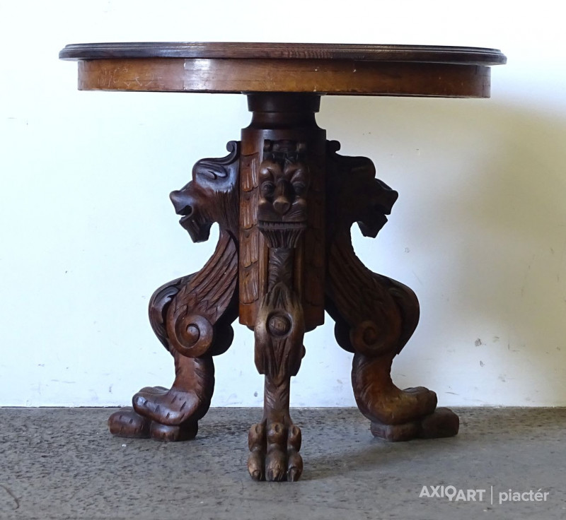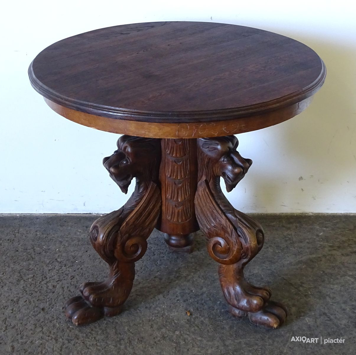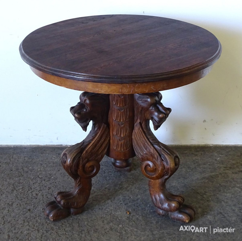 Antik szép állapotú szalonasztal, körasztal. Hatalmas egy-egy fából faragott szárnyas oroszlán lábon áll. Háromlábú szalonasztal. Keményfából készült asztallapja levehető, lejár.
