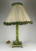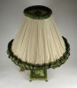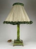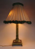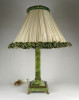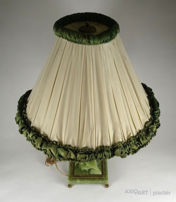 [1L269/UZ-K] Gyönyörű antik zöld márványtalpas asztali lámpa, éjjeli lámpa, fodros burával. Zöld márvány test, réz veretekkel díszítve, réz oroszlánlábakon. Kettő darab kapcsolós réz izzófoglalattal rendelkezik. Működőképes állapotban van, kettő darab nagy méretű (E27) izzó való bele. Magasság: 60 cm Szélesség: 43 cm Súly: 4.445 kg