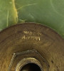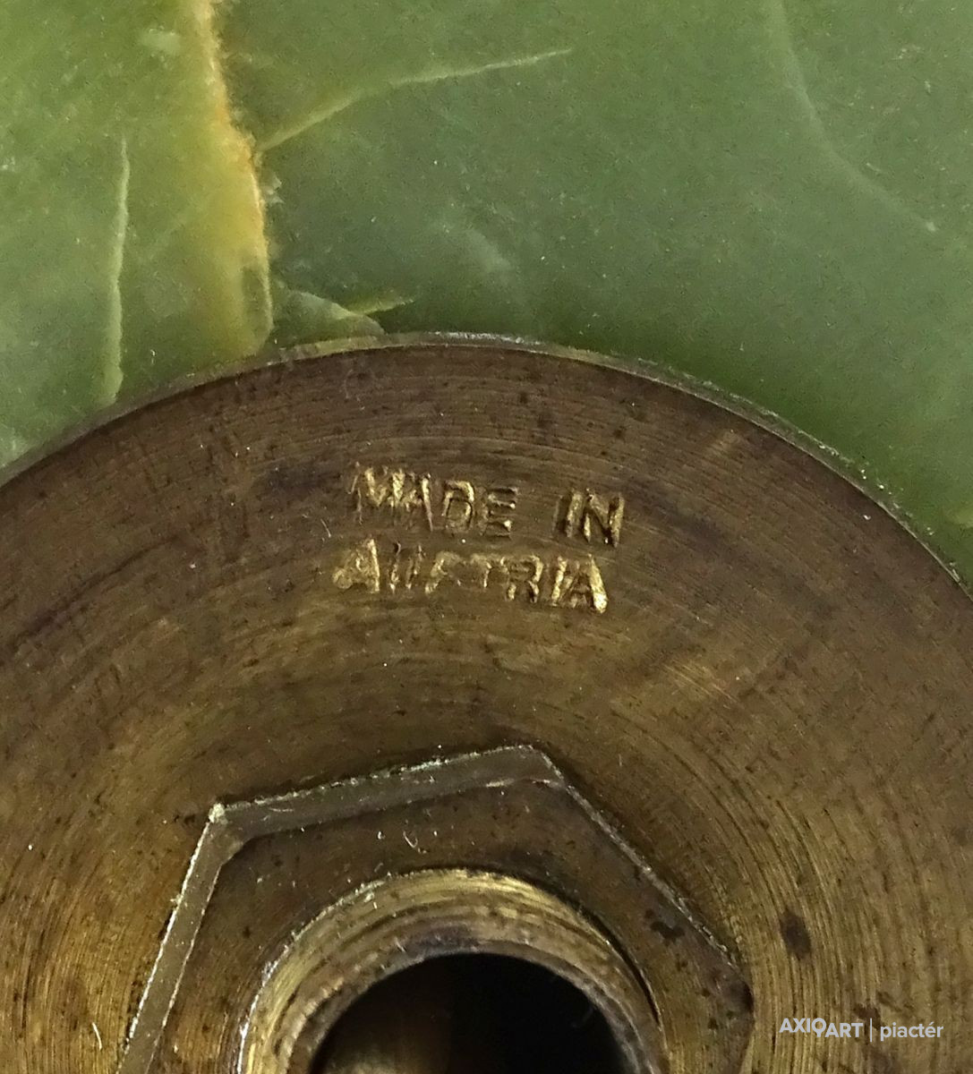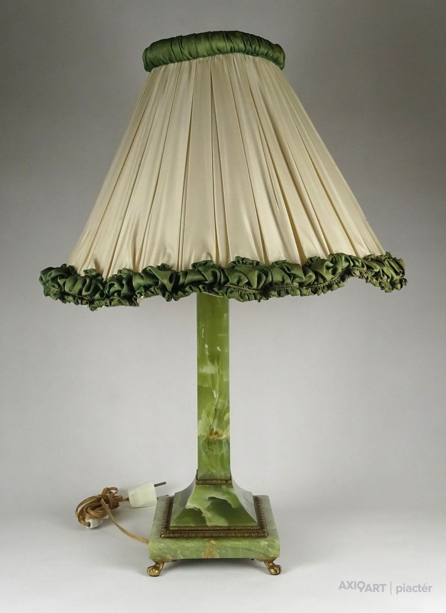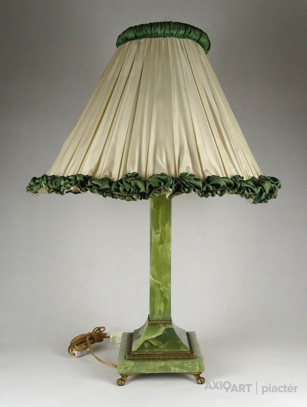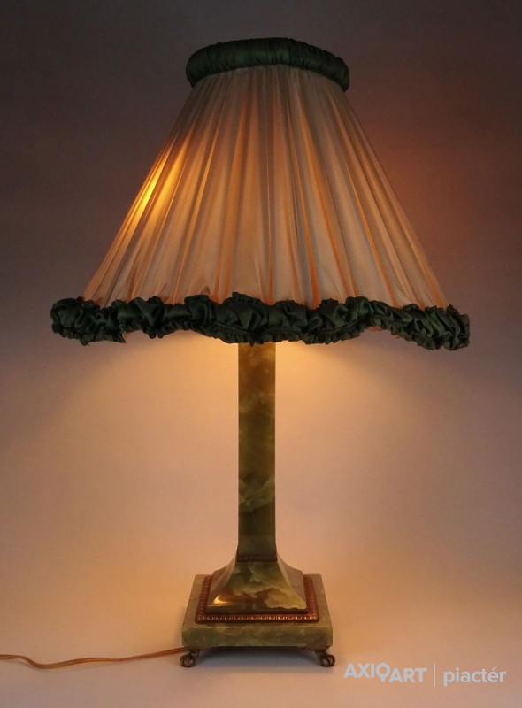 Gyönyörű antik zöld márványtalpas asztali lámpa, éjjeli lámpa, fodros burával. Zöld márvány test, réz veretekkel díszítve, réz oroszlánlábakon. Kettő darab kapcsolós réz izzófoglalattal rendelkezik. Működőképes állapotban van, kettő darab nagy méretű (E27) izzó való bele.