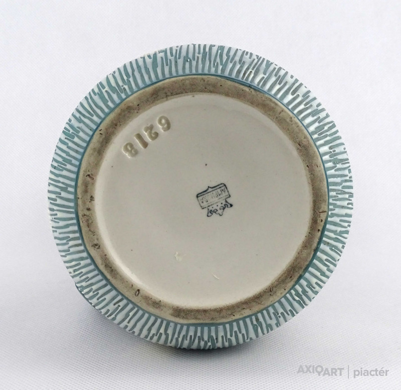 [1X540/X085] 25% ÁRENGEDMÉNY MINDEN TERMÉKÜNKRE Dec. 14-ig Hibátlan állapotú, nagyméretű, kék színű, jelzett osztrák AMPHORA art deco kerámia váza, kancsó. Alján festett kék koronás jelzés: AMPHORA Formaszám: 6213 Magasság: 21.8 cm Szélesség: 14.5 cm Hosszúság: 16 cm Súly: 0.85 kg