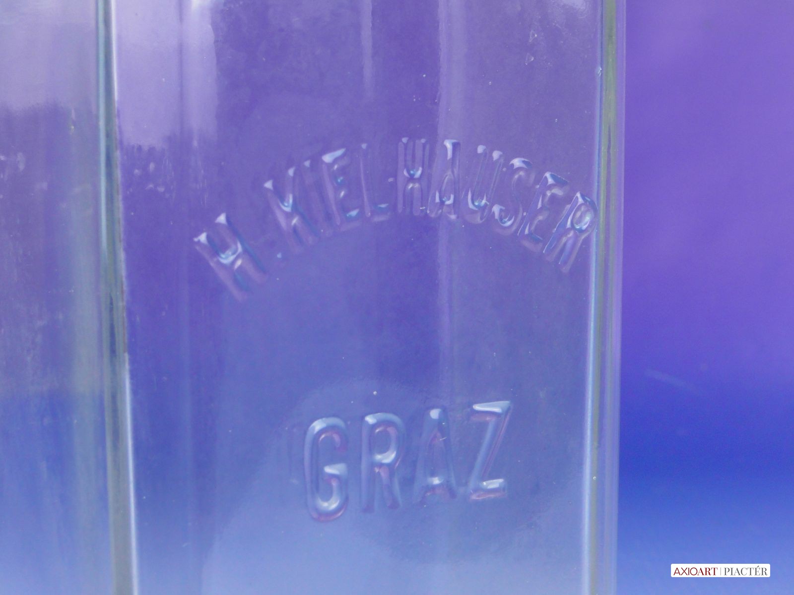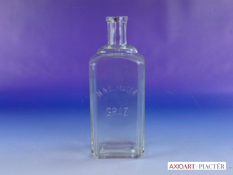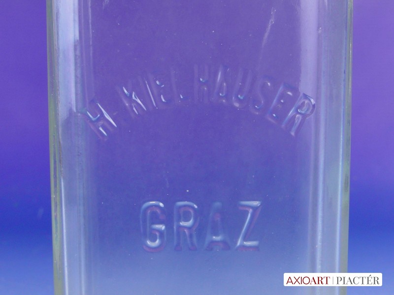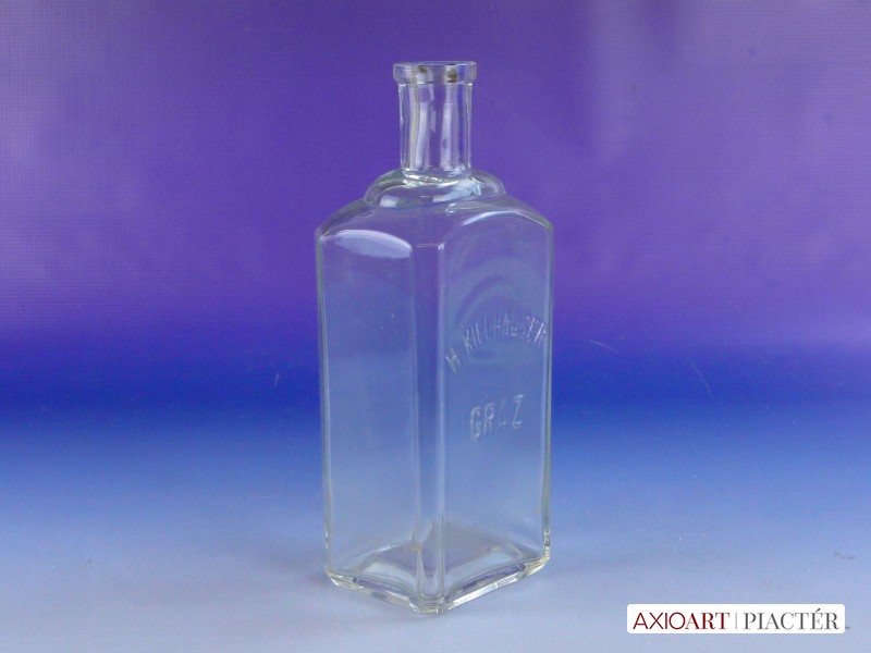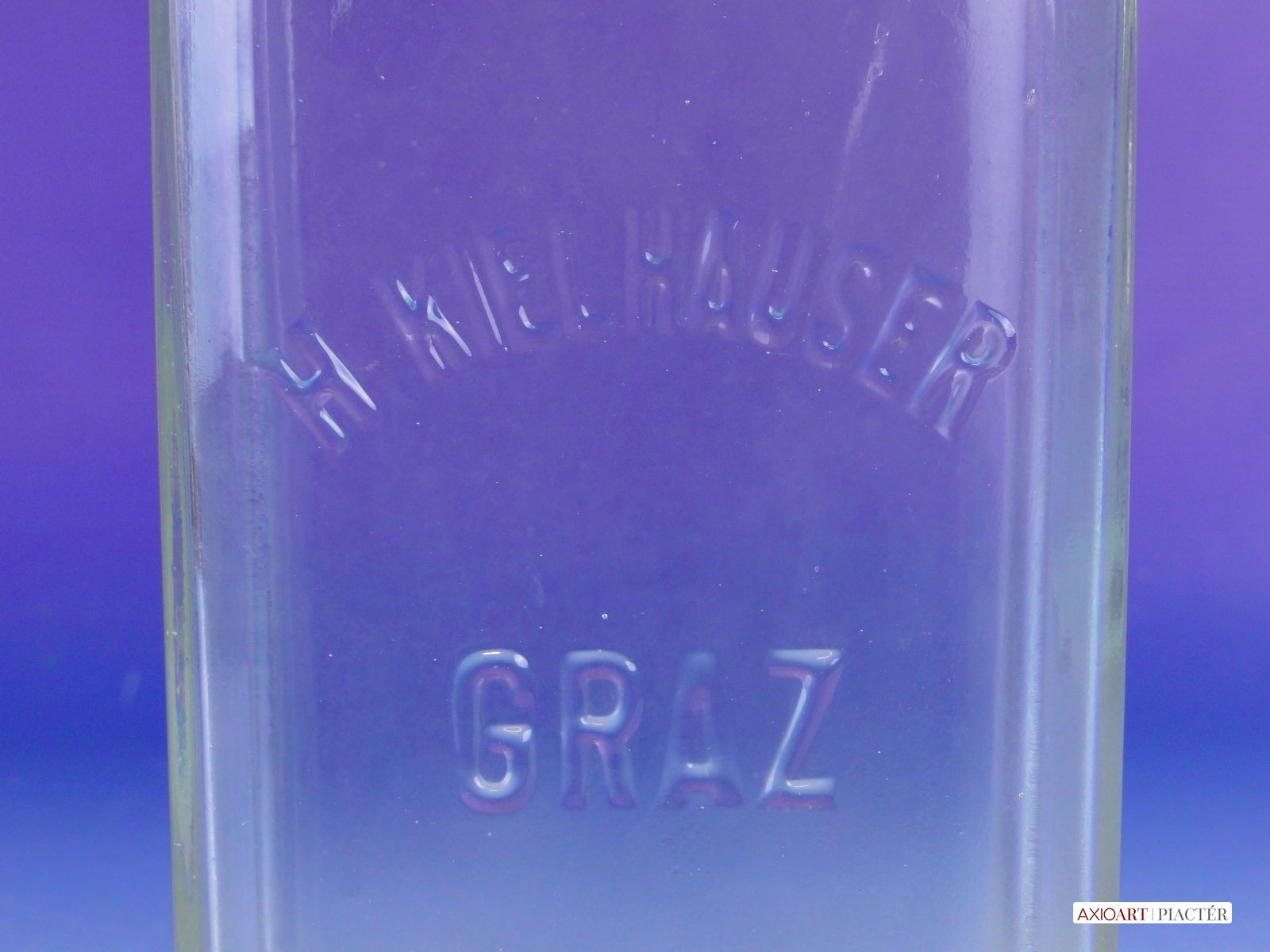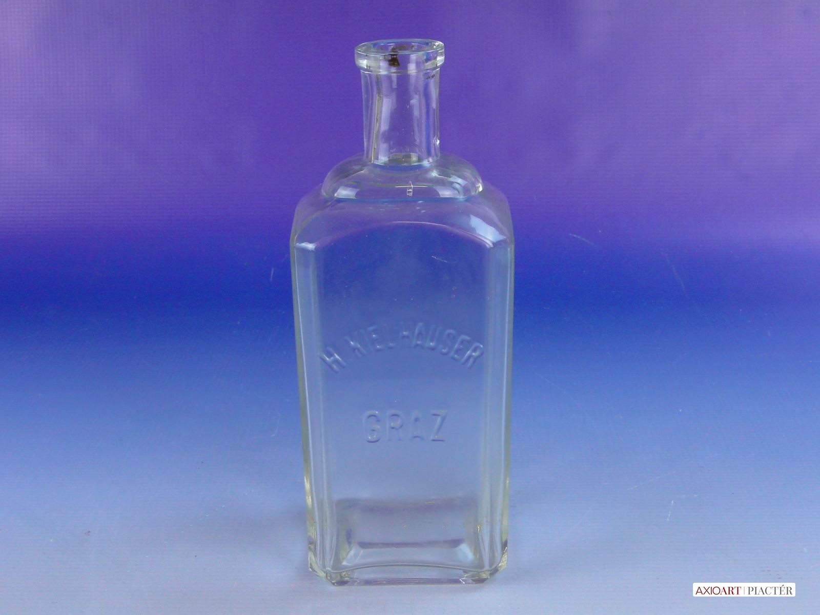 [0F437/UZ-N] Régi, hibátlan állapotú, nagyméretű gyógyszertári üveg, szögletes alakú osztrák patikaüveg. Oldalán domború felirat: H. KIELHAUSER GRAZ Magasság: 21 cm Szélesség: 8 cm Súly: 0.58 kg   Magassága 19 cm, átmérője 7 cm. Súlya 437 g.