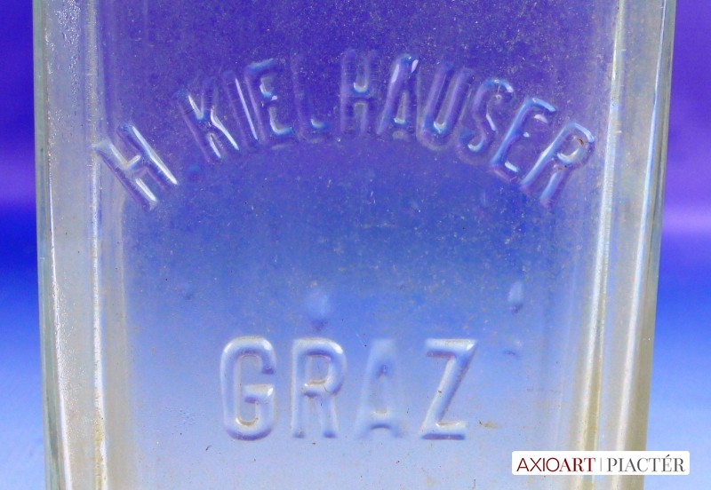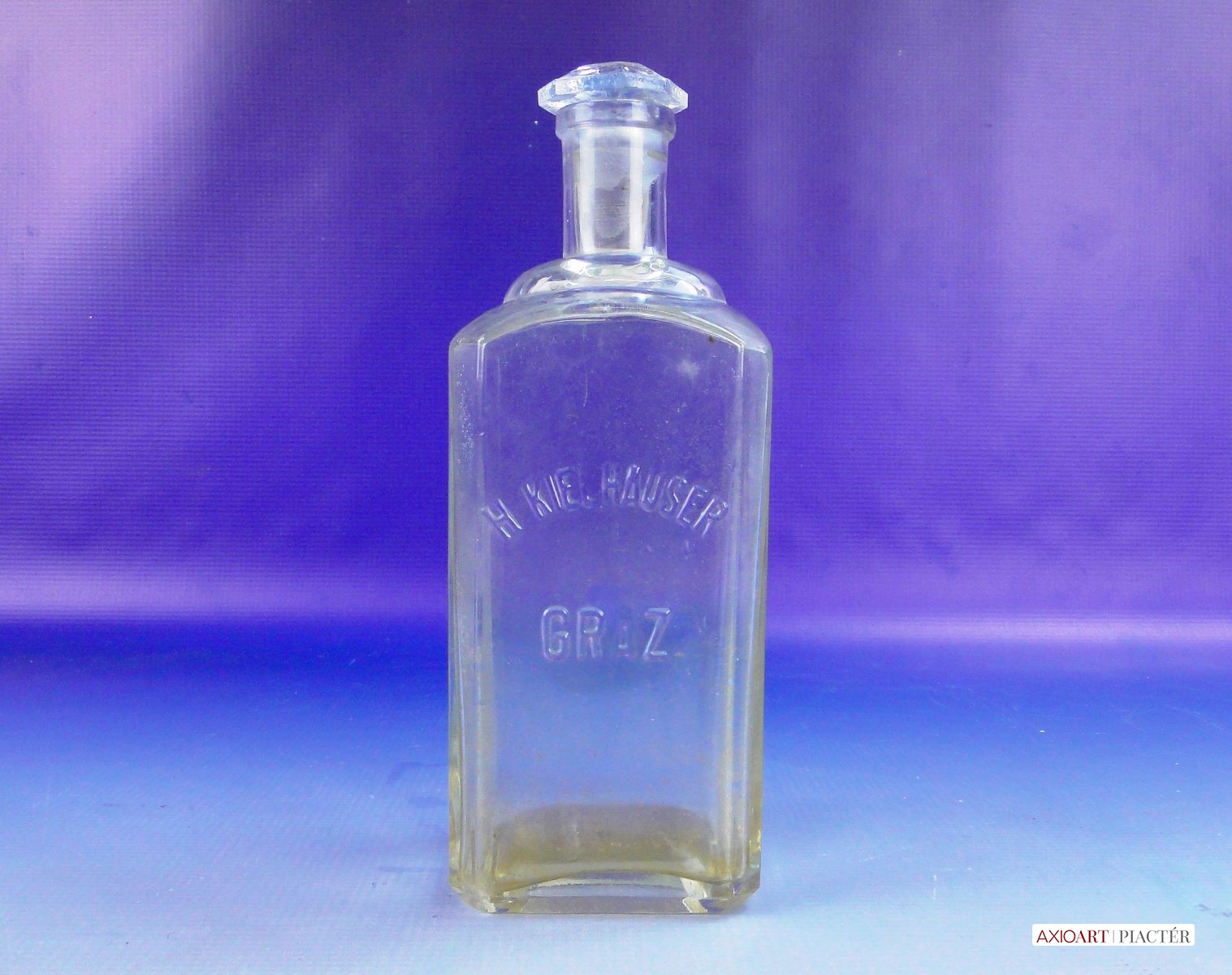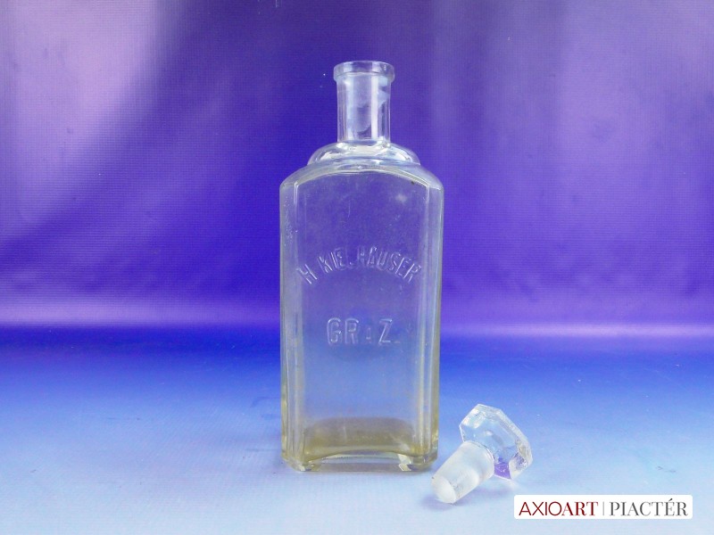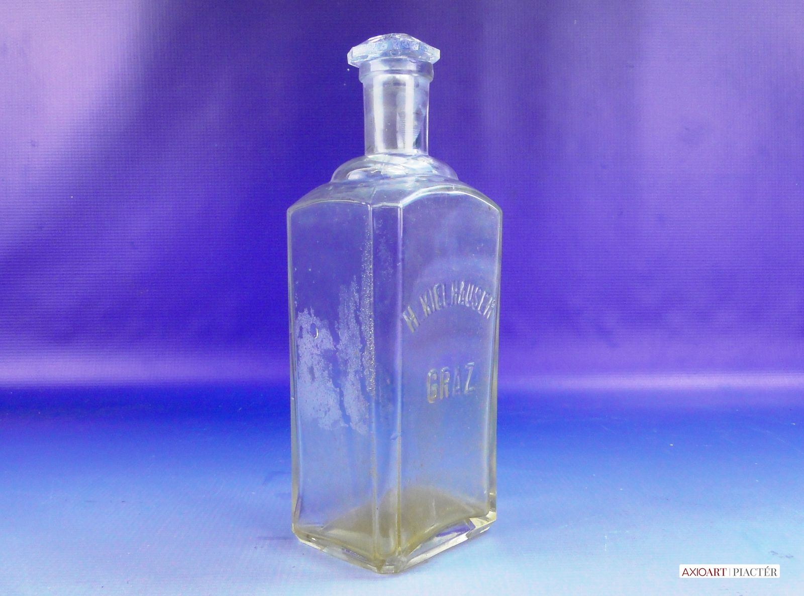 [0F663/X123] Régi, hibátlan állapotú, nagyméretű, gyógyszertári üveg, szögletes alakú osztrák patikaüveg. Oldalán domború felirat: H. KIELHAUSER GRAZ Magasság: 22 cm Szélesség: 8 cm Súly: 0.631 kg   Magassága 19 cm, átmérője 7 cm. Súlya 437 g.
