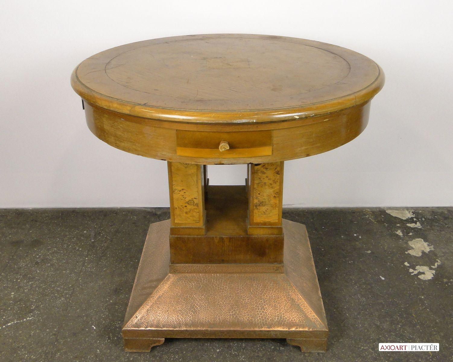 [0F004/KCS] 25% ÁRENGEDMÉNY MINDEN TERMÉKÜNKRE Dec. 14-ig 1880 körüli, kör alakú, oldalán 4 fiókos kártyaasztal, játékasztal. Alján vörösréz kézzel kalapált koptatóval. Jelenleg eredeti állapotú, felújítás mentes darab. Rendkívül masszív, nehéz darab. Magasság: 68 cm