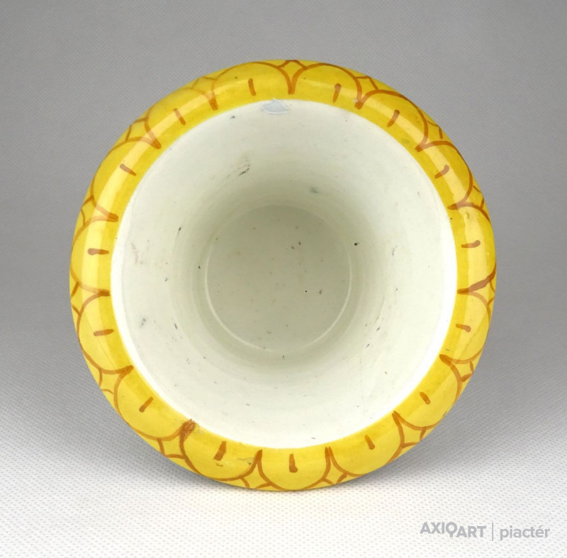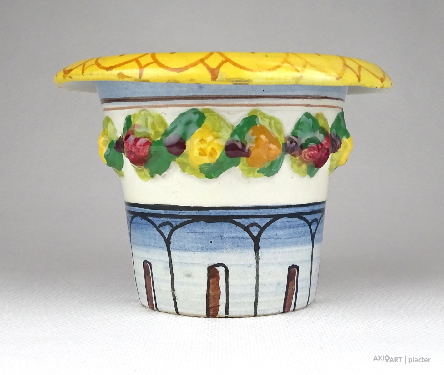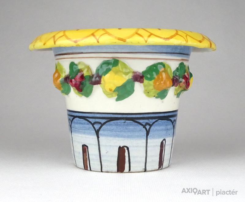 Szép állapotú, kézzel festett színes mázas majolika pohár. Oldalán plasztikus gyümölcs díszítések láthatóak.