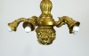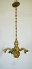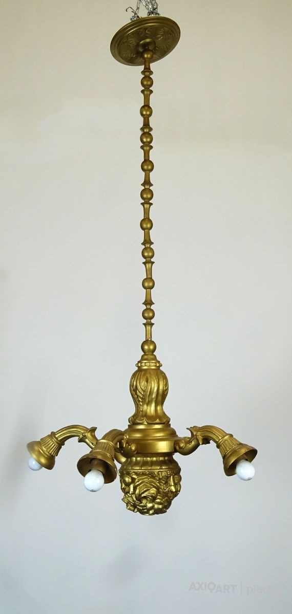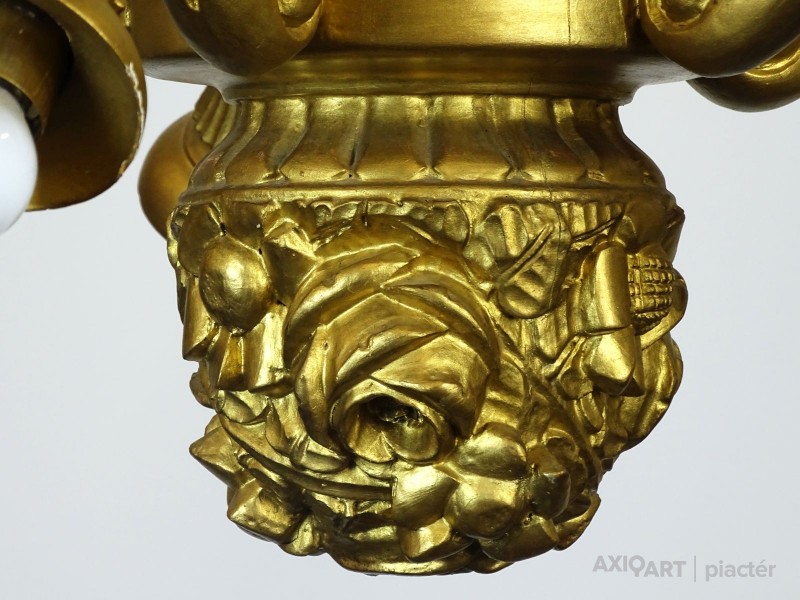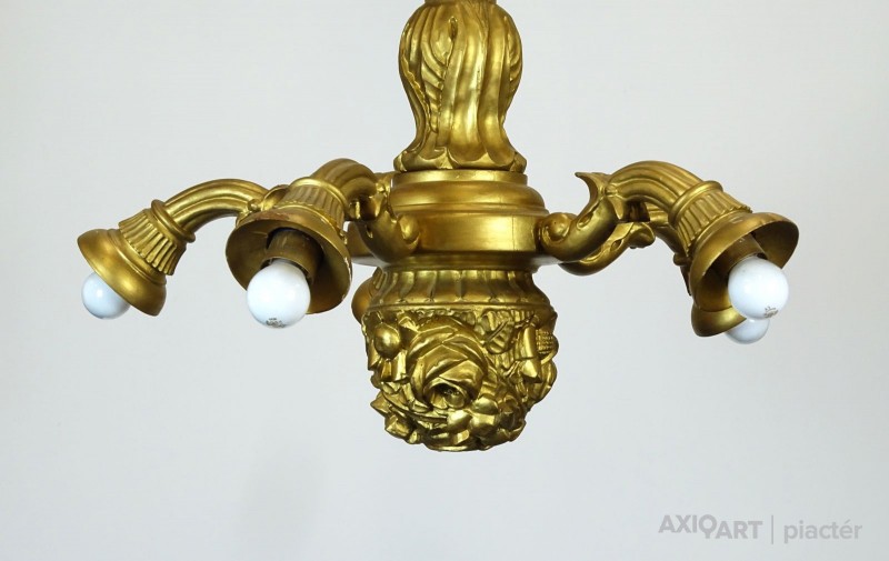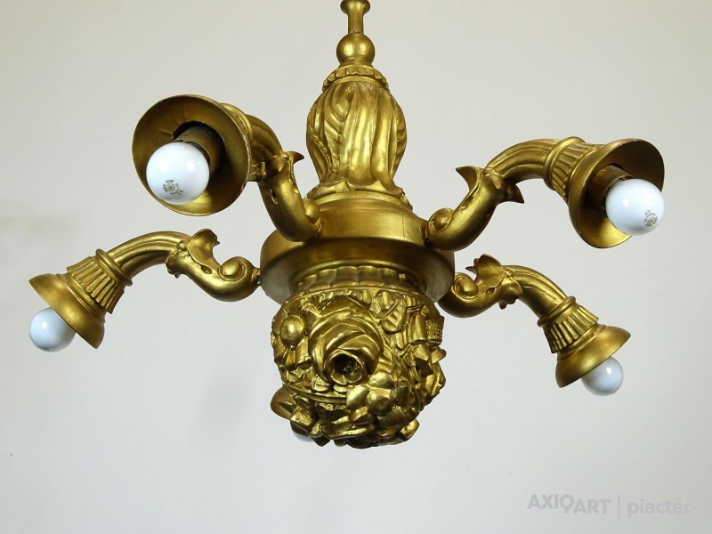 Antik, szép állapotú, hosszú faragott fa soron függő, ötkarú mennyezeti lámpa, csillár. Középen alul egy dúsan faragott virágdíszes végződés található. Eredeti fa porvédő mennyezeti kupakja is megvan. A csillár fa faragásai, szerkezete teljesen hibátlan, kisebb kopások találhatók rajta.