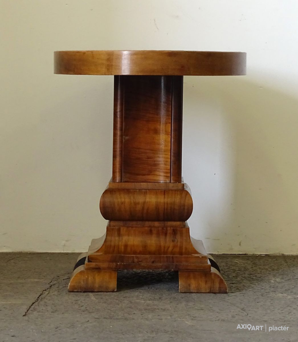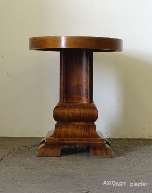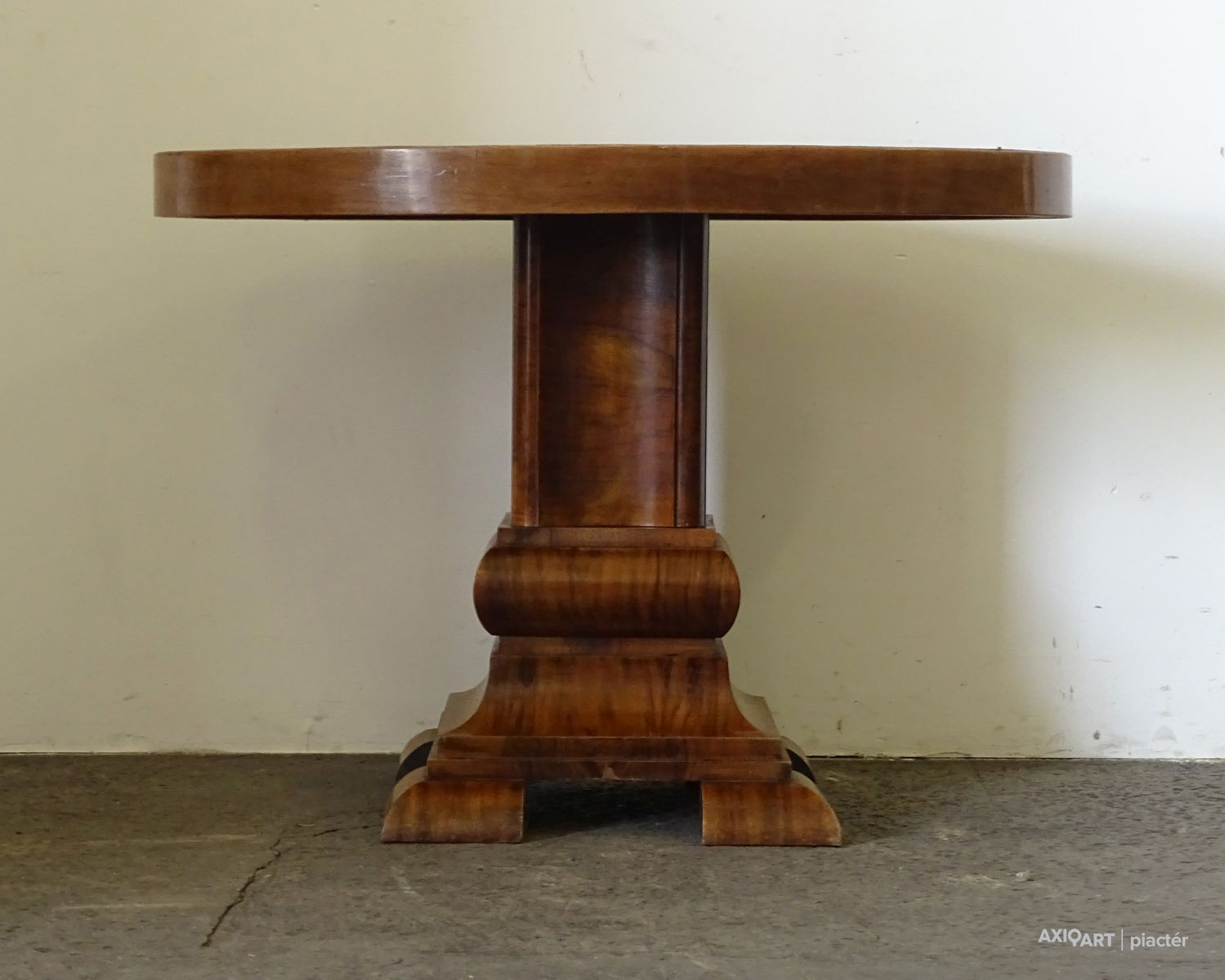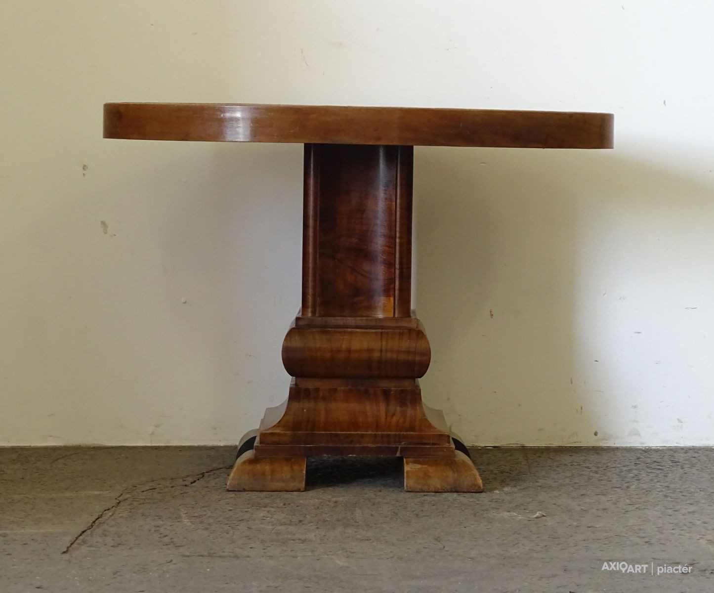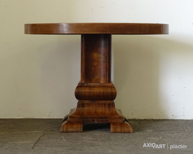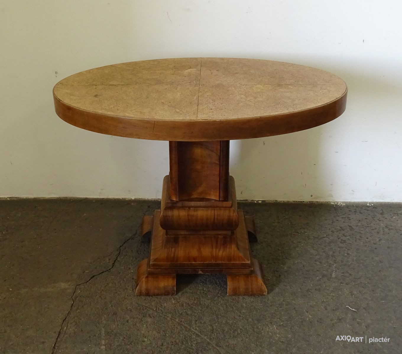 Antik art deco asztal, ovális alakú szalonasztal. Tetején parafaborítás található.