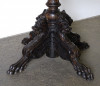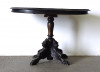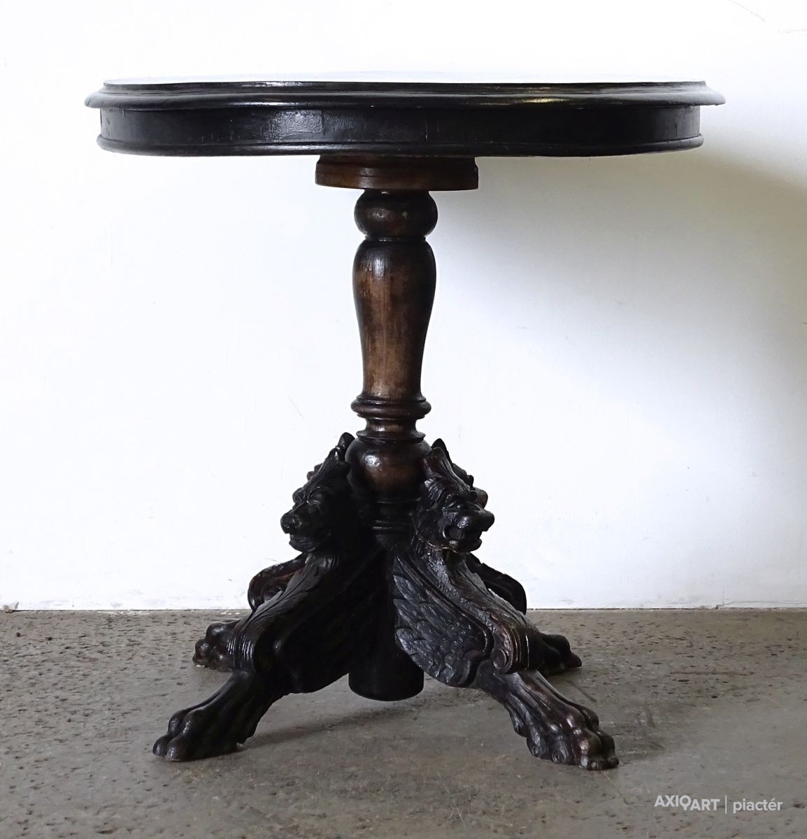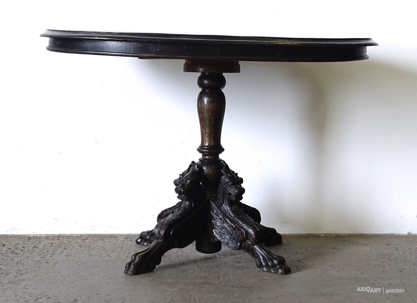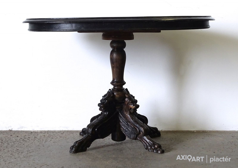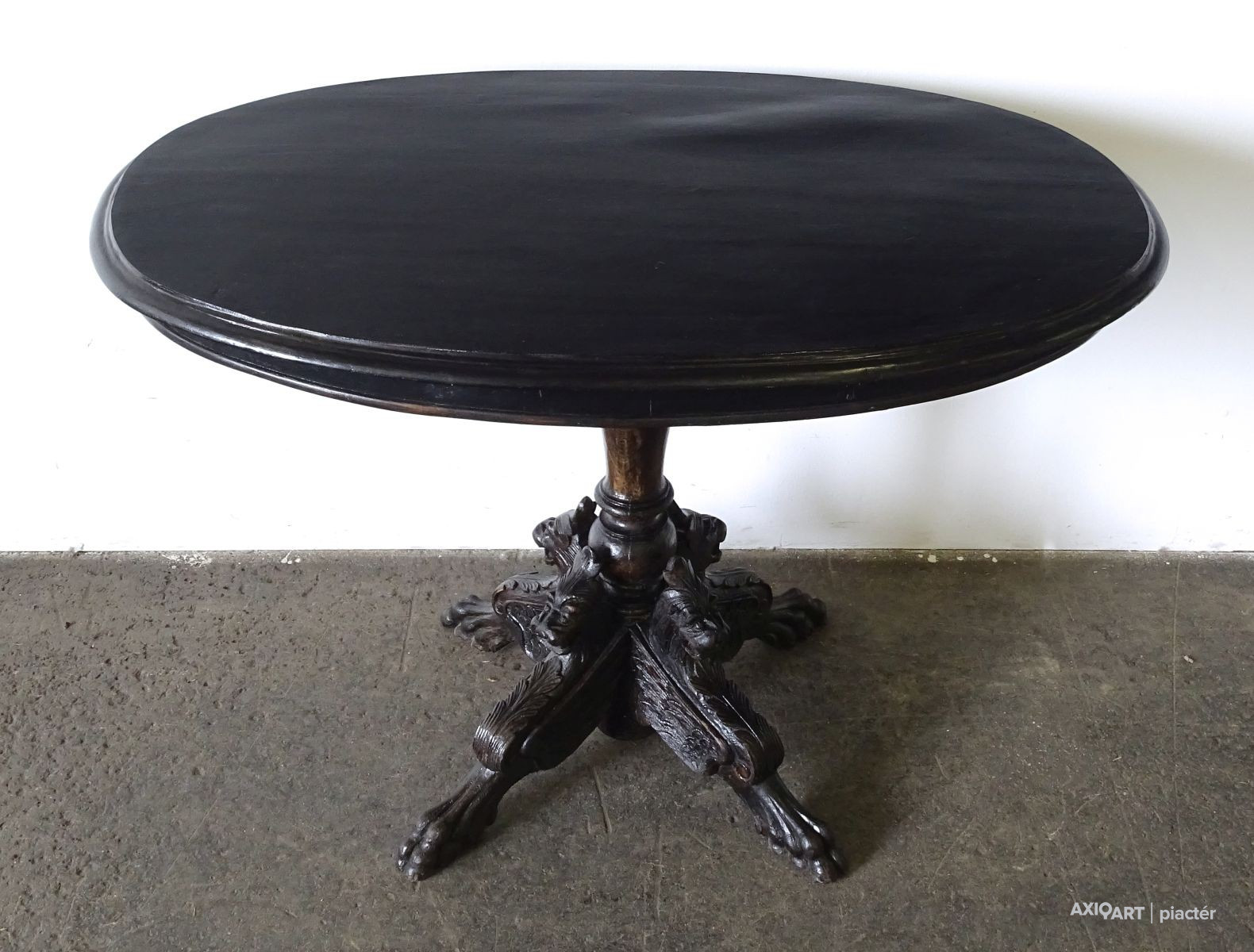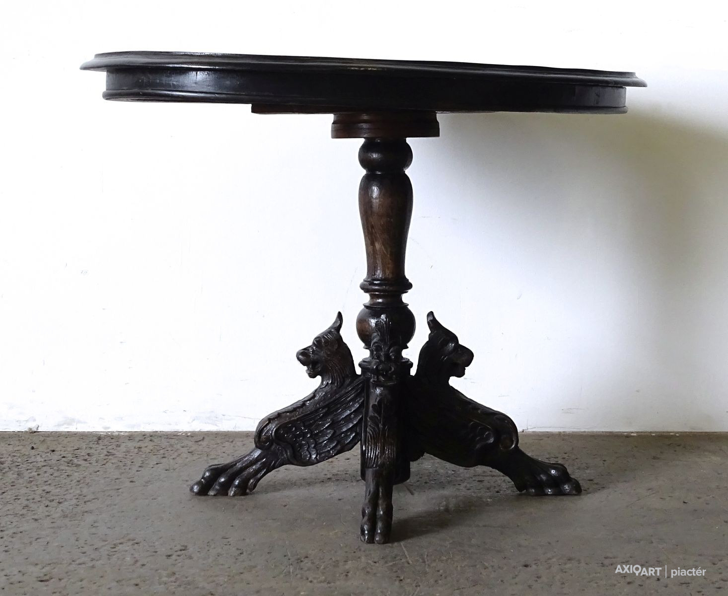 Antik ovális alakú, sötétbarna színű szalonasztal. Négy lábát faragott griffmadár díszíti.