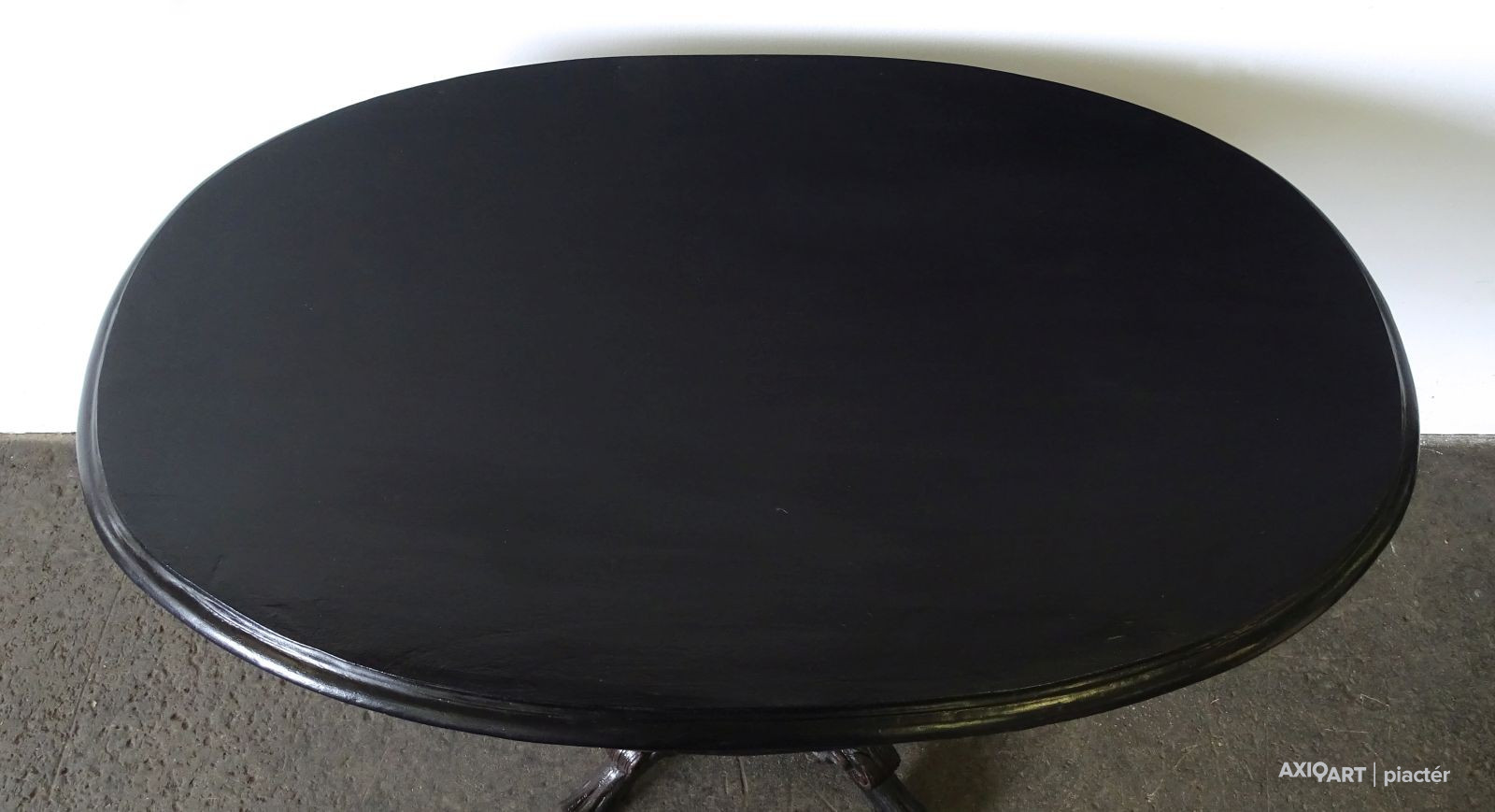 [1L030/KCS] Antik ovális alakú, sötétbarna színű szalonasztal. Négy lábát faragott griffmadár díszíti. Magasság: 75 cm Szélesség: 71 cm Hosszúság: 110 cm