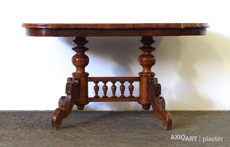 Antik, dúsan faragott, ovális alakú ónémet szalonasztal, ónémet asztal, az 1800-as évek végéről. Felületén több furnérhiba található. Szerkezetileg nagyon stabil. Lábain, tőkéin régi szú nyomok láthatóak.
