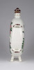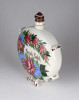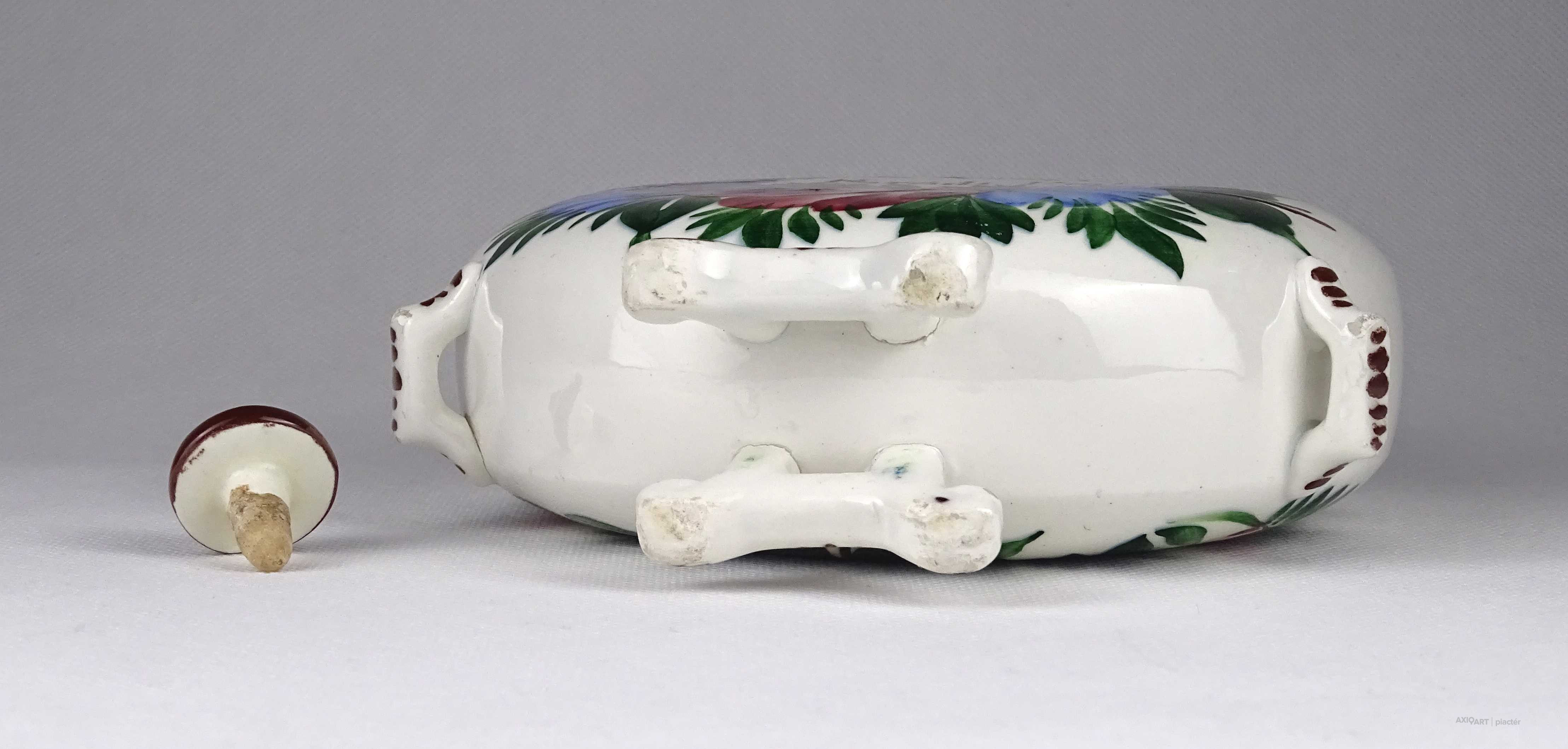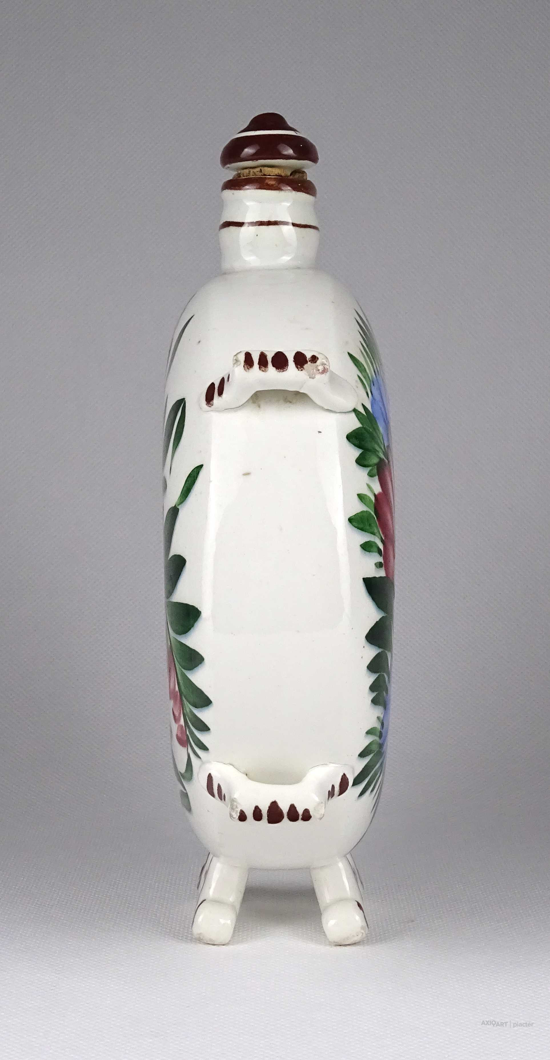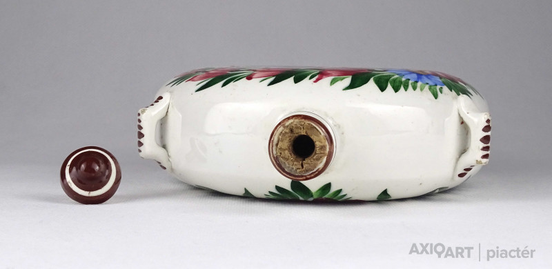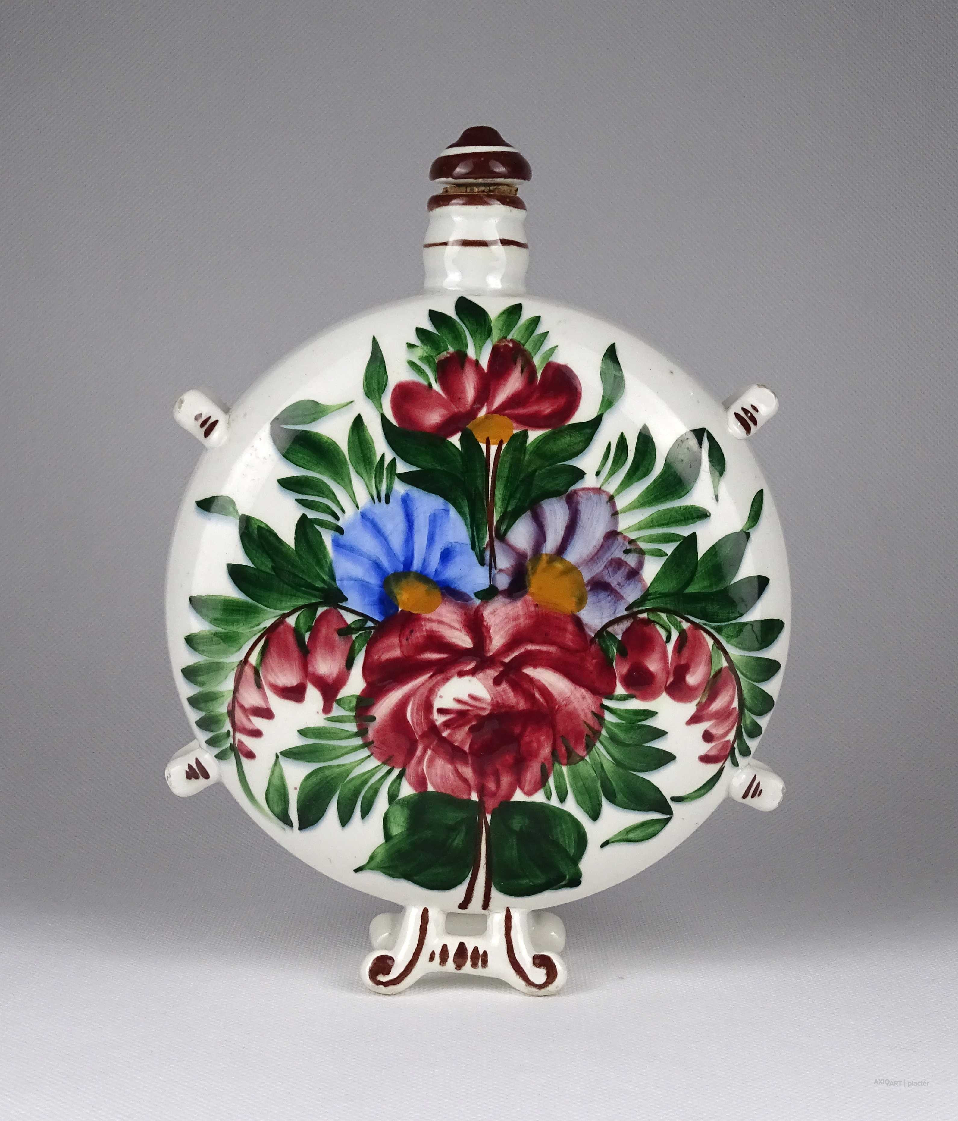 Antik, szép állapotú, jelzetlen, kézzel festett, népi motívumokkal díszített, ritkán előforduló nagy méretű Hollóházi kerámia kulacs, butella eredeti dugójával. Talpán és a zsinór bújtatóinak peremén néhány kisebb lepattanás található.