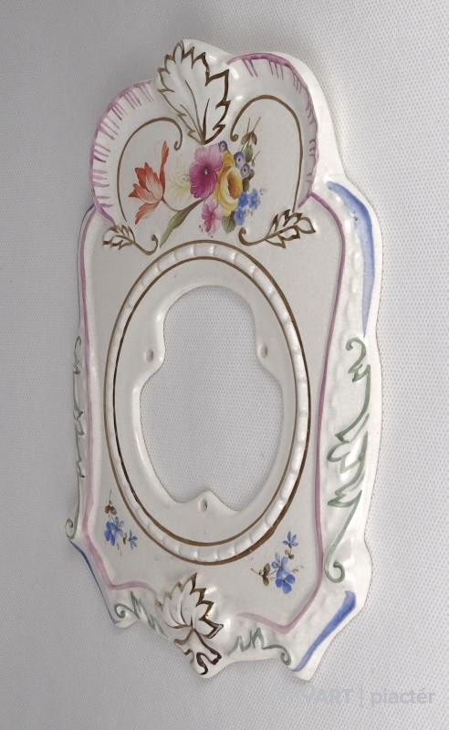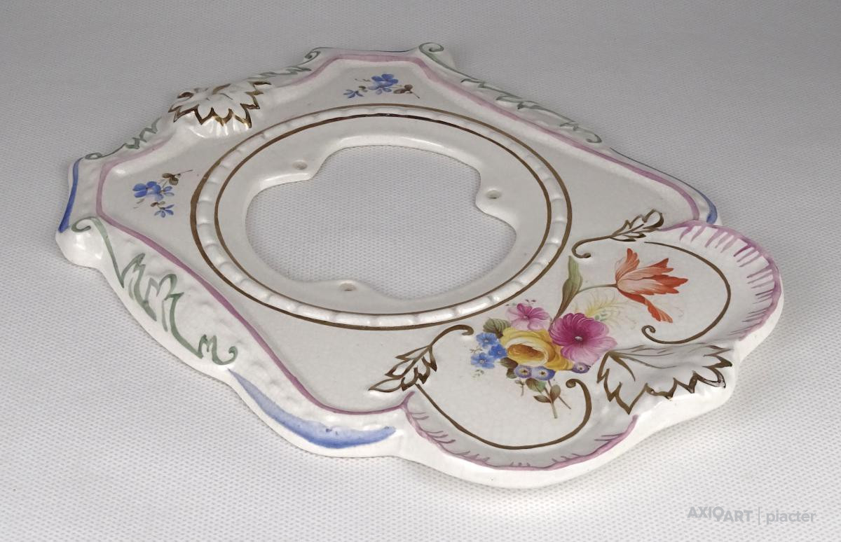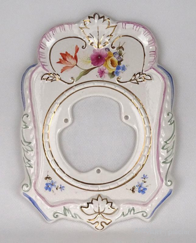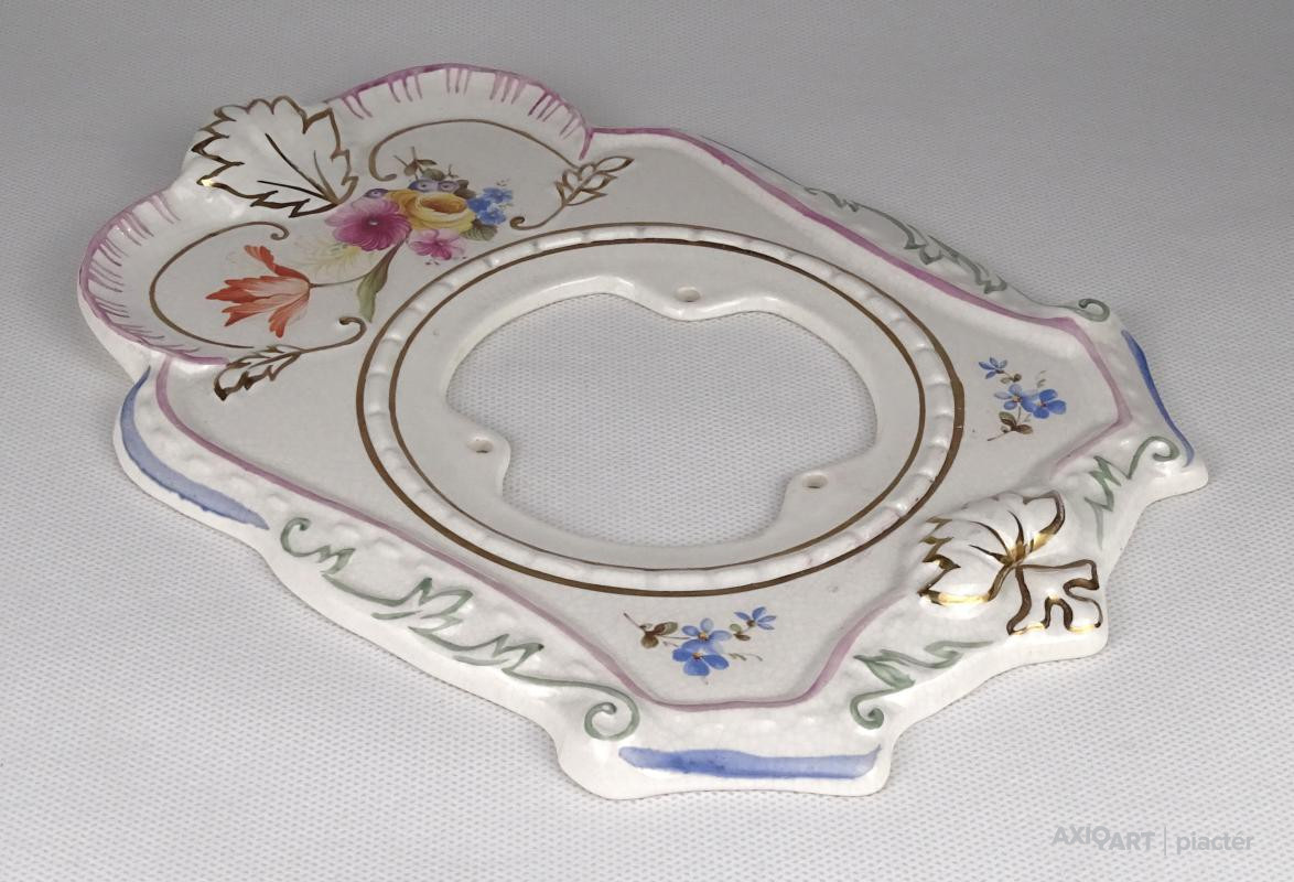 [1K902/X050] Hibátlan állapotú aranyozott, virágdíszes porcelán előlap. Hátoldalon mélynyomott jelzés: "M" Magasság: 23 cm Szélesség: 16 cm Súly: 0.345 kg