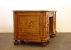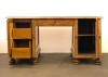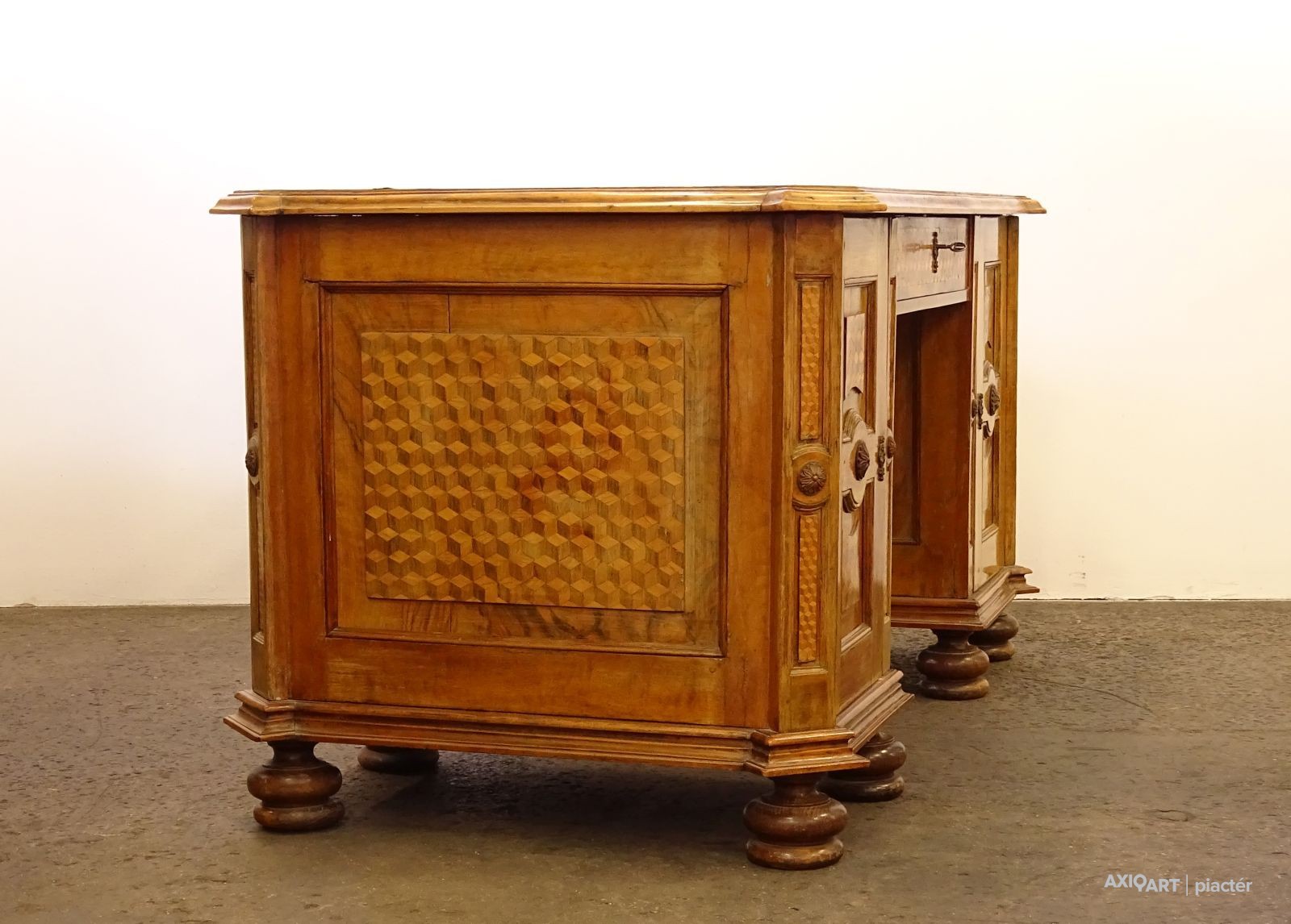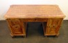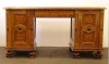[0J846/UZ-K] Rendkívül dekoratív, 1800-as évek elejéről származó, copf jellegű intarziával díszített íróasztal, eredeti zárakkal, kulccsal. Térbe helyezhető darab. Az intarziák és faragások az egész asztalt beborítják. Magasság: 77 cm Szélesség: 83 cm Hosszúság: 175 cm