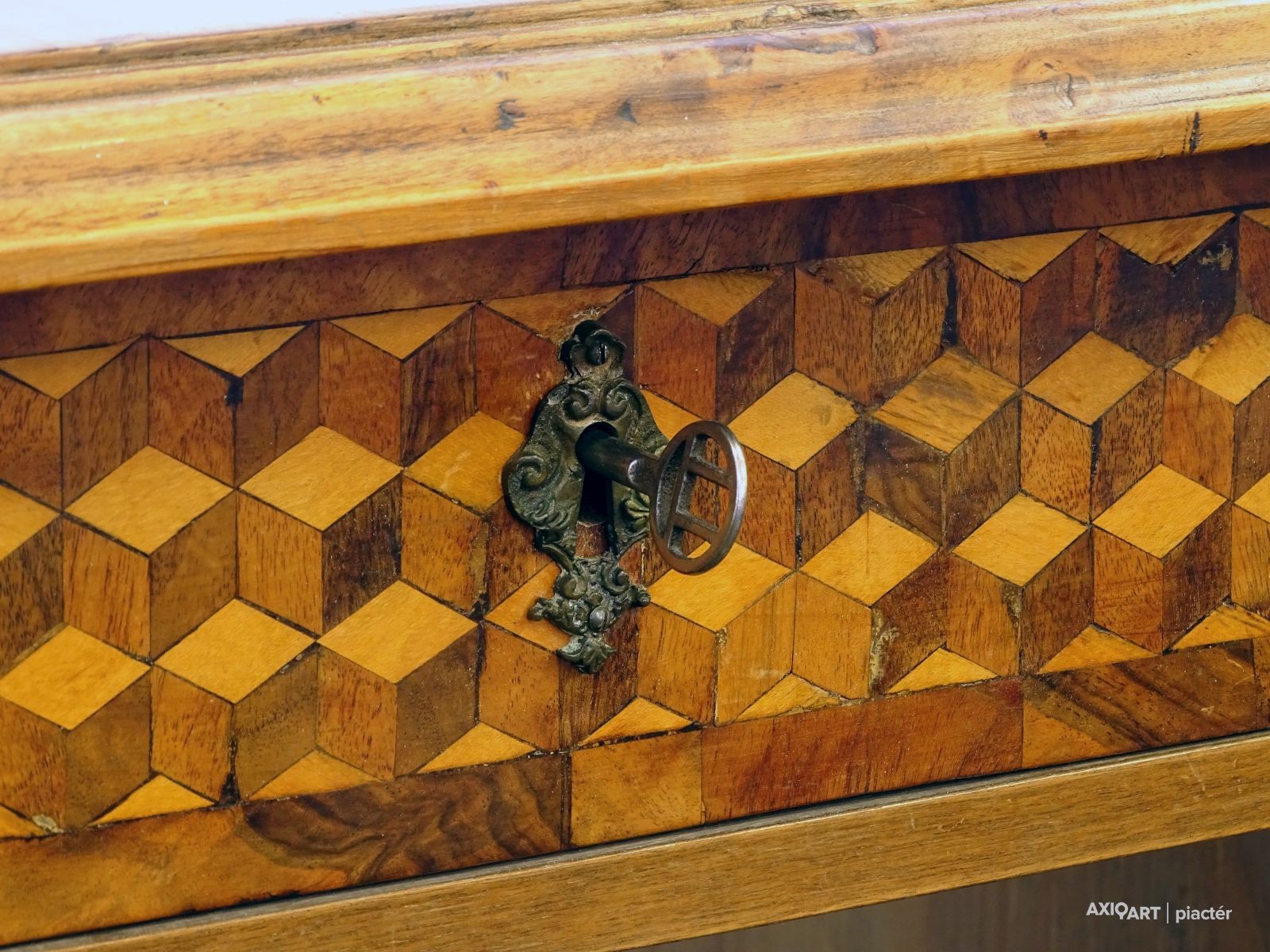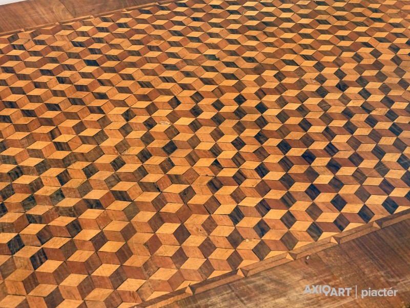 Az intarziák és faragások az egész asztalt beborítják.