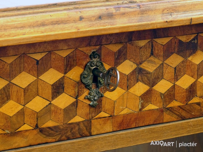 Rendkívül dekoratív, 1800-as évek elejéről származó, copf jellegű intarziával díszített íróasztal, eredeti zárakkal, kulccsal.
