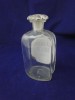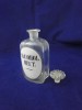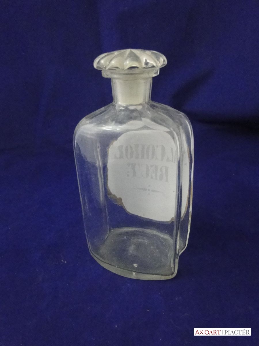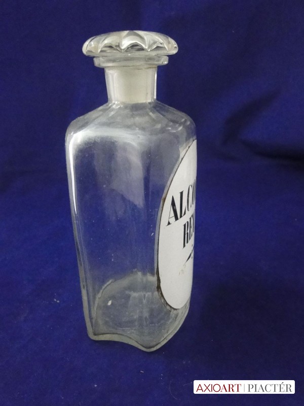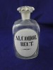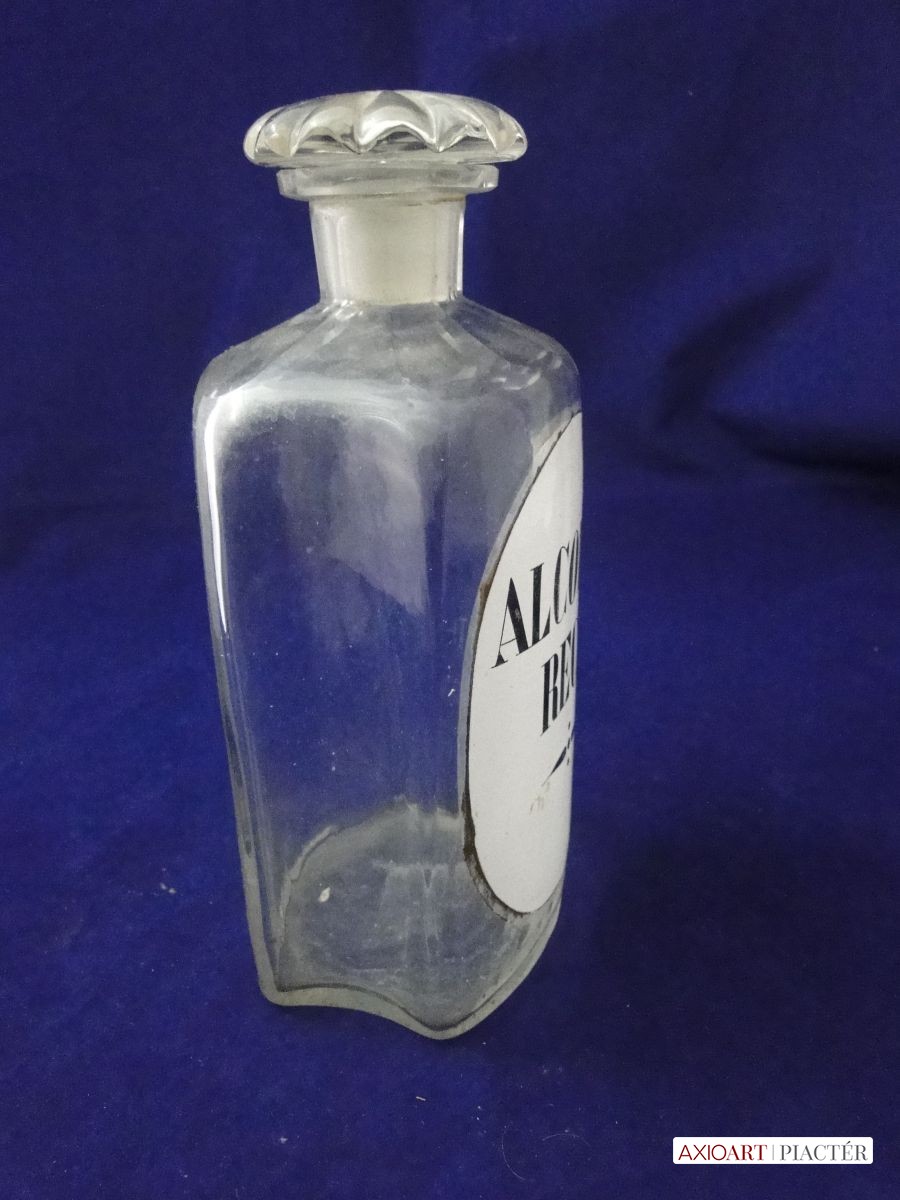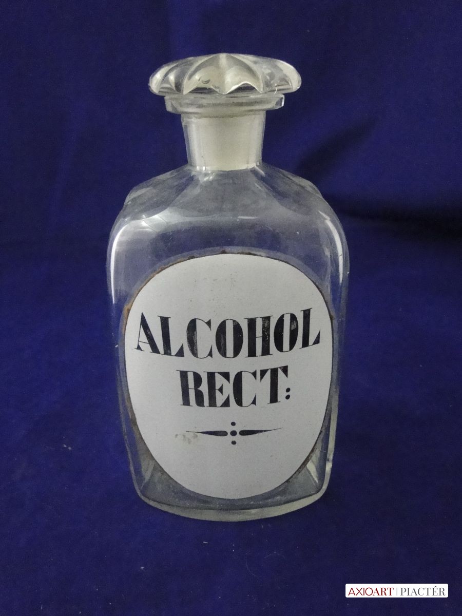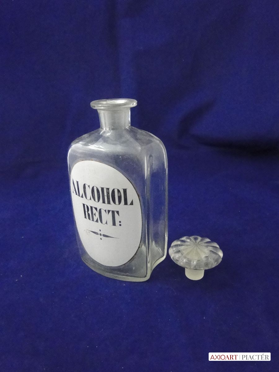 [8626/UZ-N] Hibátlan állapotú, dugós extra nagyméretű antik patika edény, üveg, gyógyszertári tégely. Oldalán felirat: ALCOHOL RECT Másik oldalán TA. 60 Magasság: 23 cm Súly: 0.927 kg   Magassága 16 cm. Talpának mérete 6 x 7,6 cm.