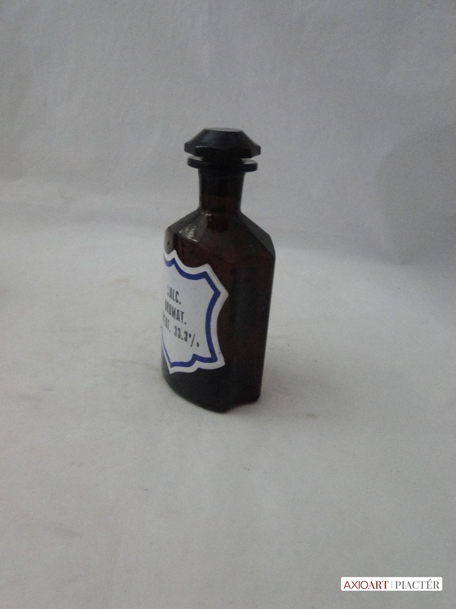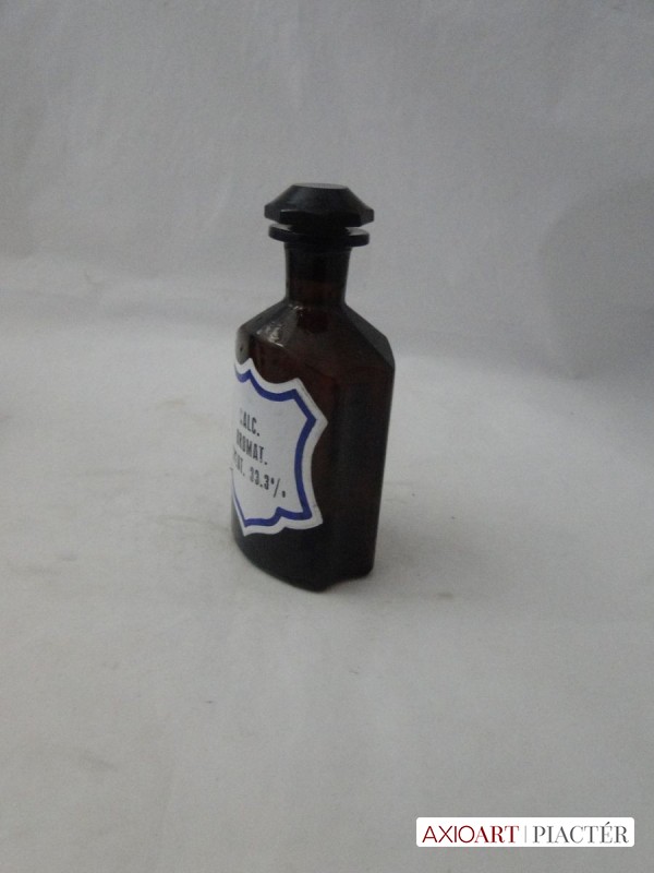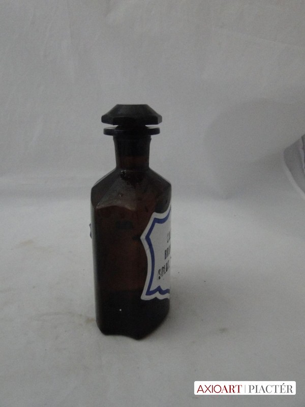 [8609/UZ-N] Hibátlan állapotú, dugós antik patika edény, üveg, gyógyszertári tégely, színezett barna üveg. Oldalán felirat: CALC BROMAT SOLUT 33,3% Másik oldalán TA. 267 A palack nyakán és a dugó tetején gravírozott felirat. G007 Magasság: 16.5 cm Súly: 0.632 kg   Magassága 16 cm. Talpának mérete 6 x 7,6 cm.