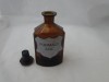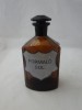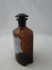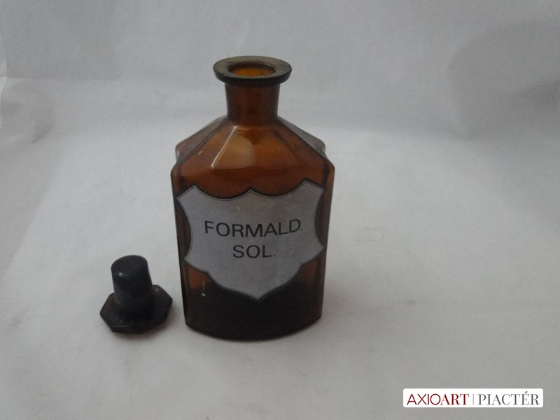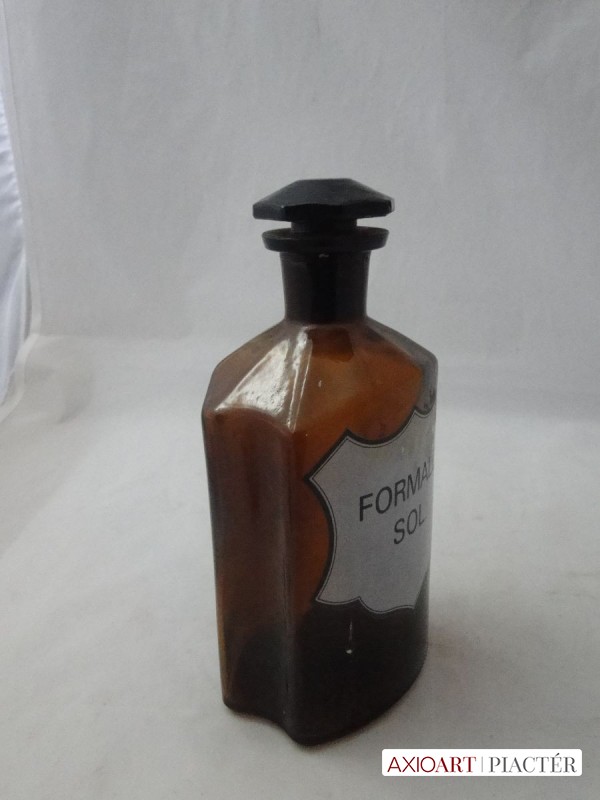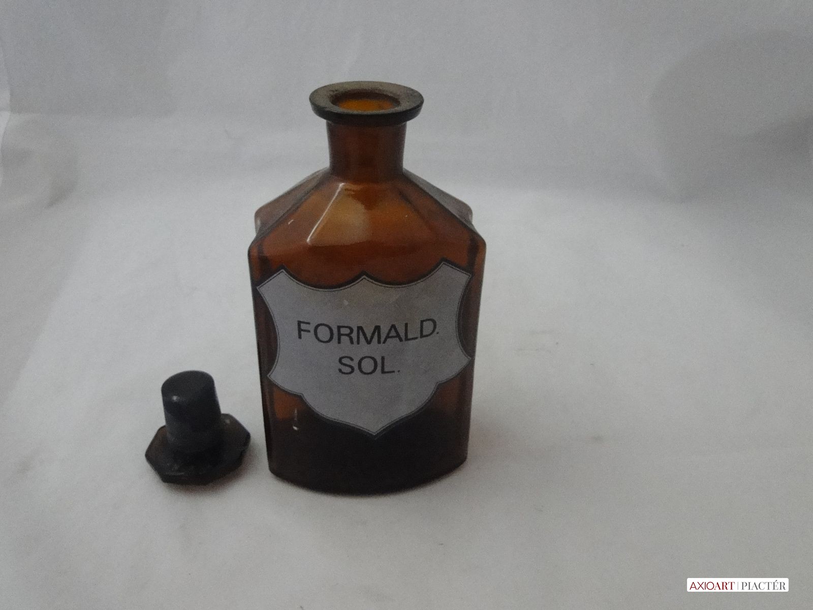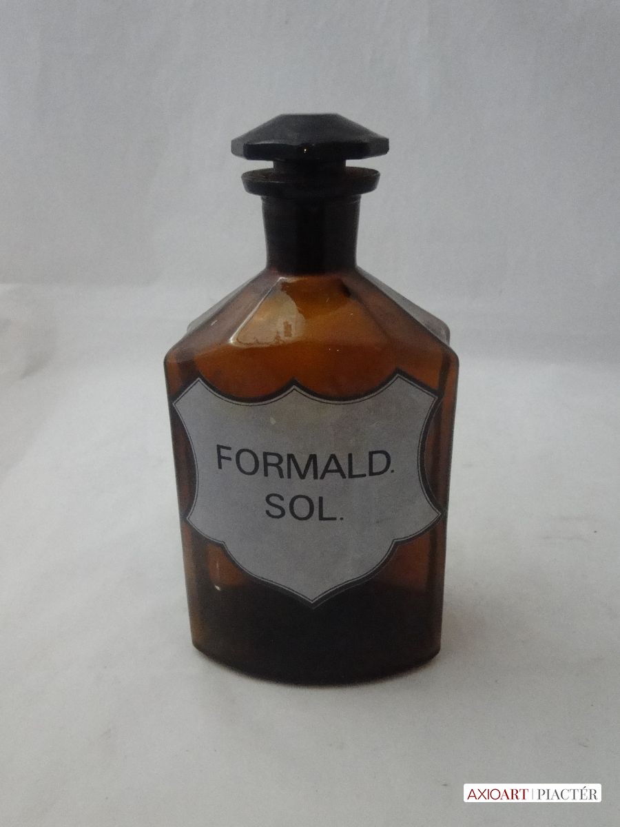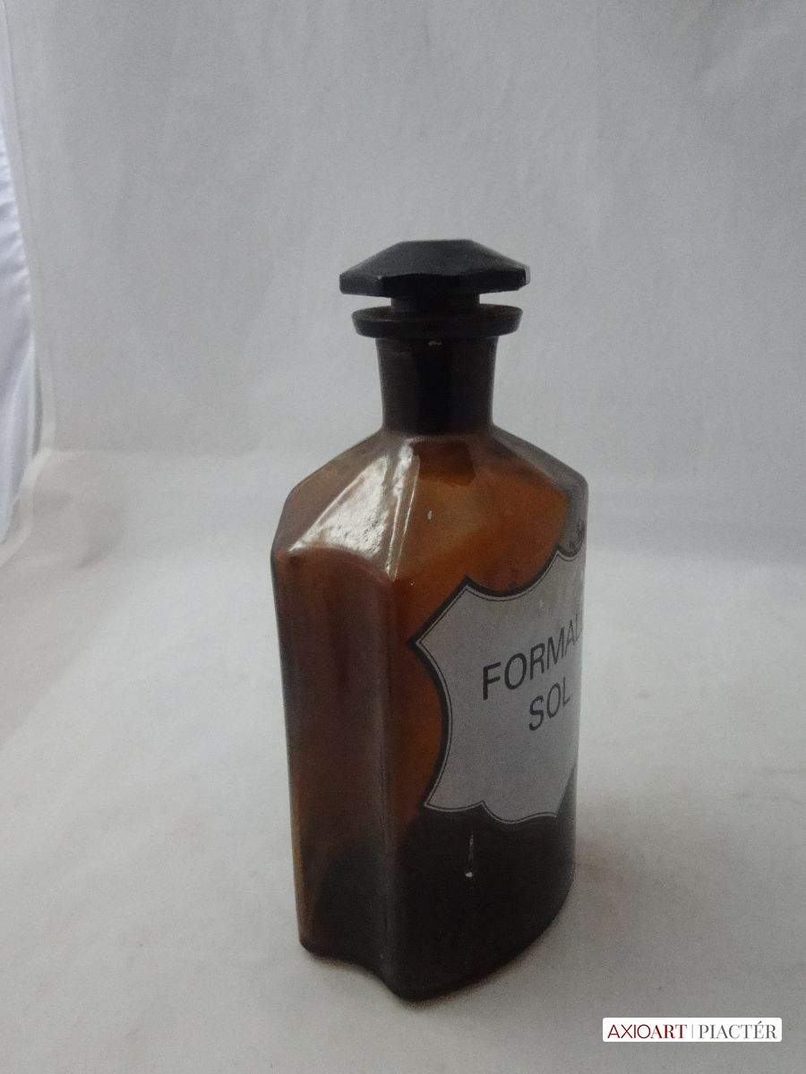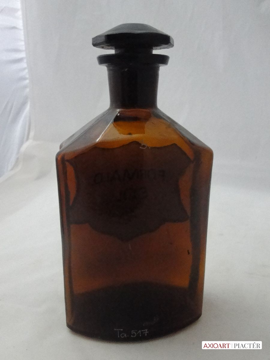 [8608/UZ-N] Szép állapotú, dugós antik patika edény, üveg, gyógyszertári tégely, színezett barna üveg. Oldalán felirat: FORMALD SOL Másik oldalán TA. 517 Talpának peremén, hátul egy aprócska jelentéktelen lepattanás található. Magasság: 21 cm Súly: 0.622 kg   Magassága 16 cm. Talpának mérete 6 x 7,6 cm.