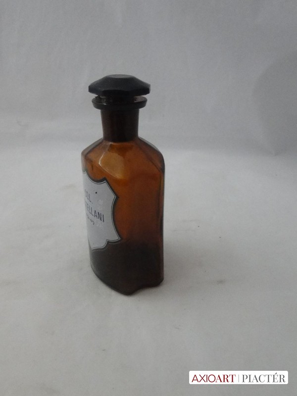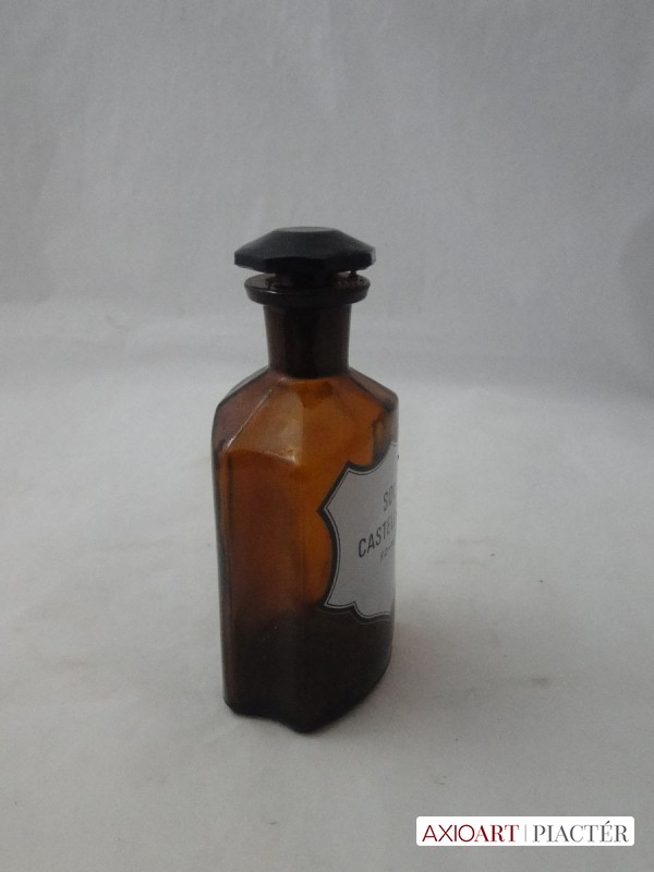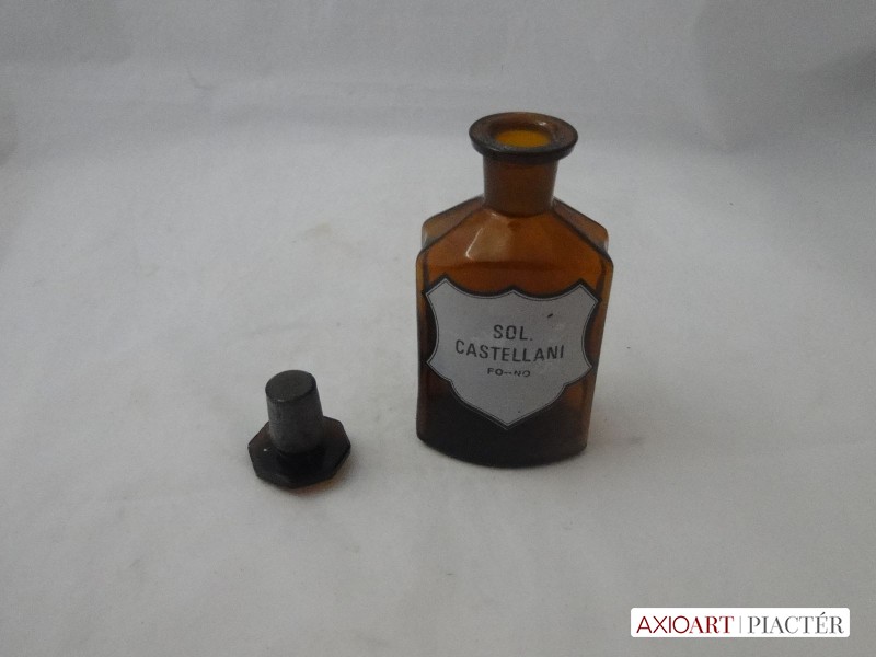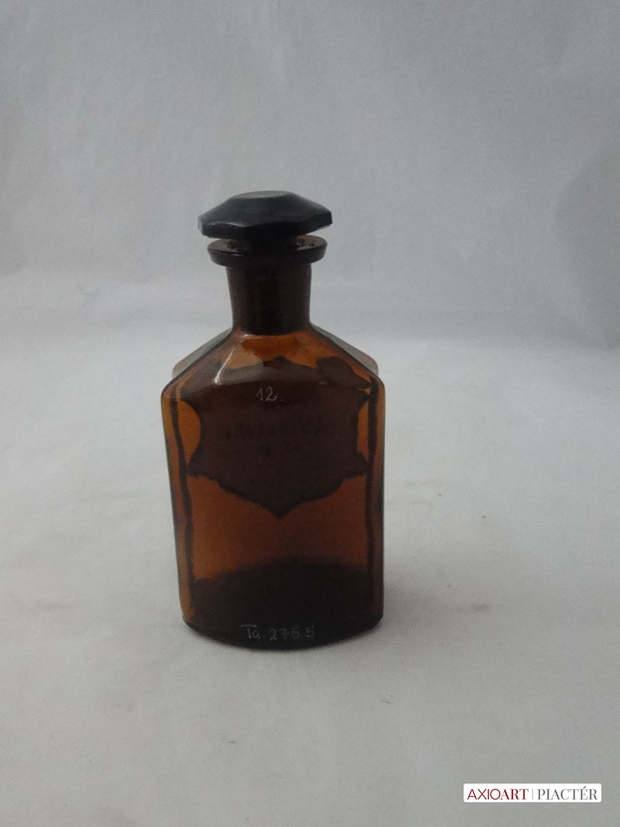 [8611/UZ-N] Hibátlan állapotú, dugós antik patika edény, üveg, gyógyszertári tégely, színezett barna üveg. Oldalán felirat: SOLCASTELLANI FO-NO Másik oldalán TA. 275.5 Magasság: 16.5 cm Súly: 0.341 kg   Magassága 16 cm. Talpának mérete 6 x 7,6 cm.