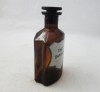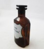 [8614/UZ-N] Hibátlan állapotú, dugós antik patika edény, üveg, gyógyszertári tégely, színezett barna üveg. Oldalán felirat: TINCT SAPONAR Másik oldalán TA. 152 Magasság: 13 cm Súly: 0.176 kg   Magassága 16 cm. Talpának mérete 6 x 7,6 cm.