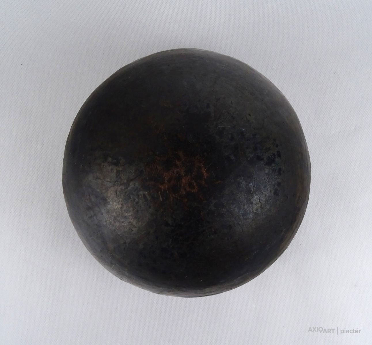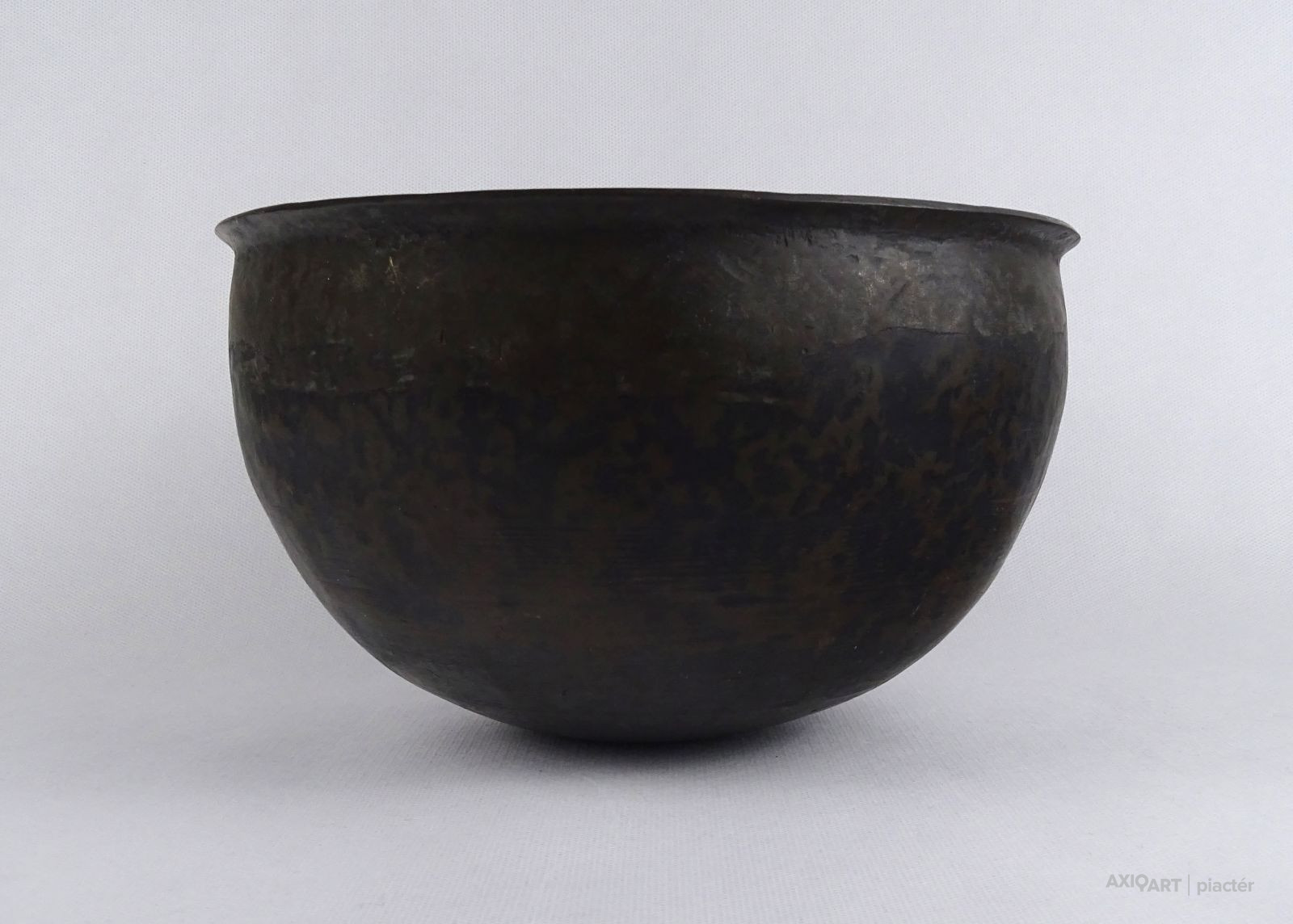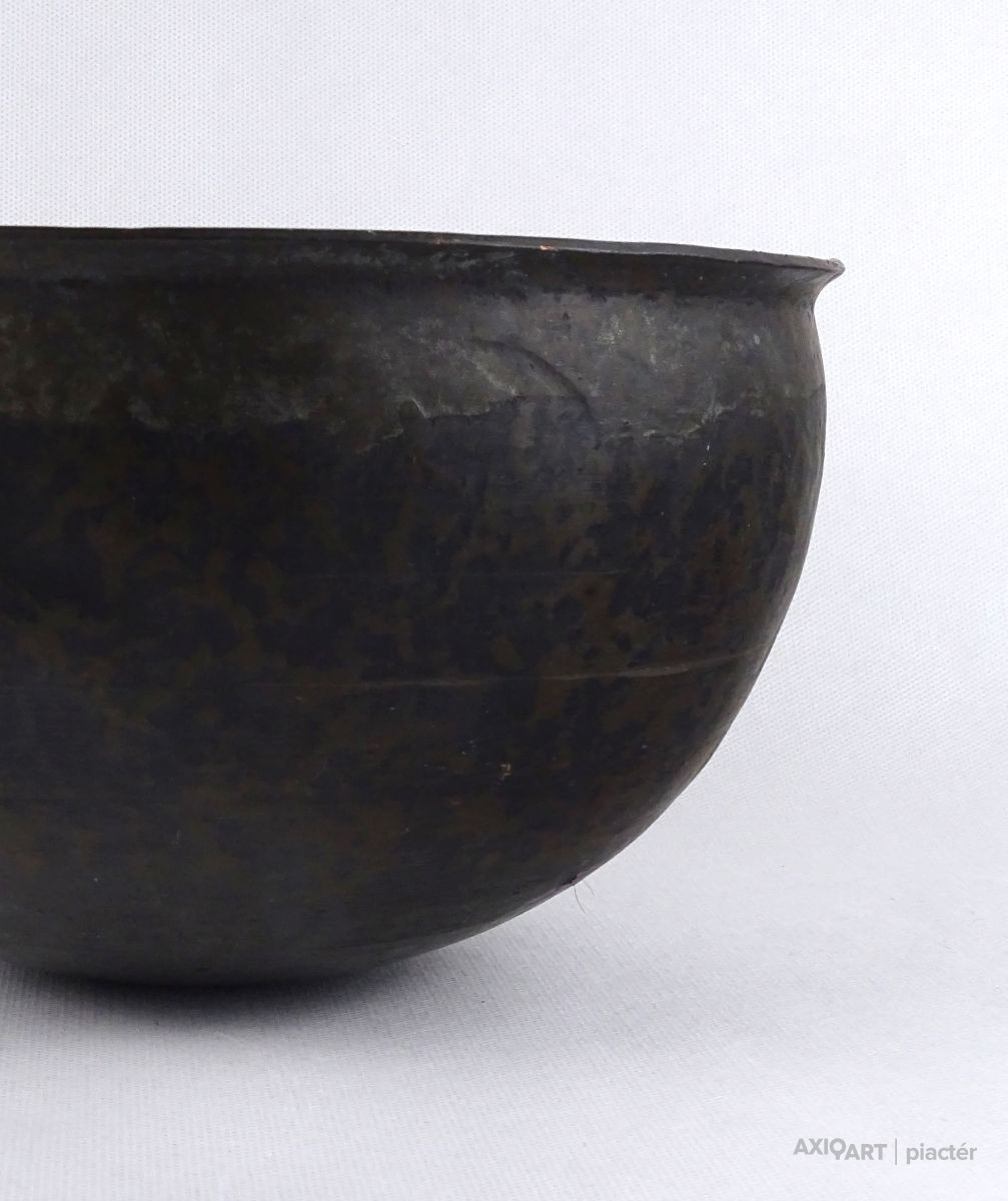 Szép állapotú, gyönyörű patinás felületű antik bronz edény, lábas, fazék. Alja domború, visszahajló perem résszel rendelkezik.
