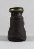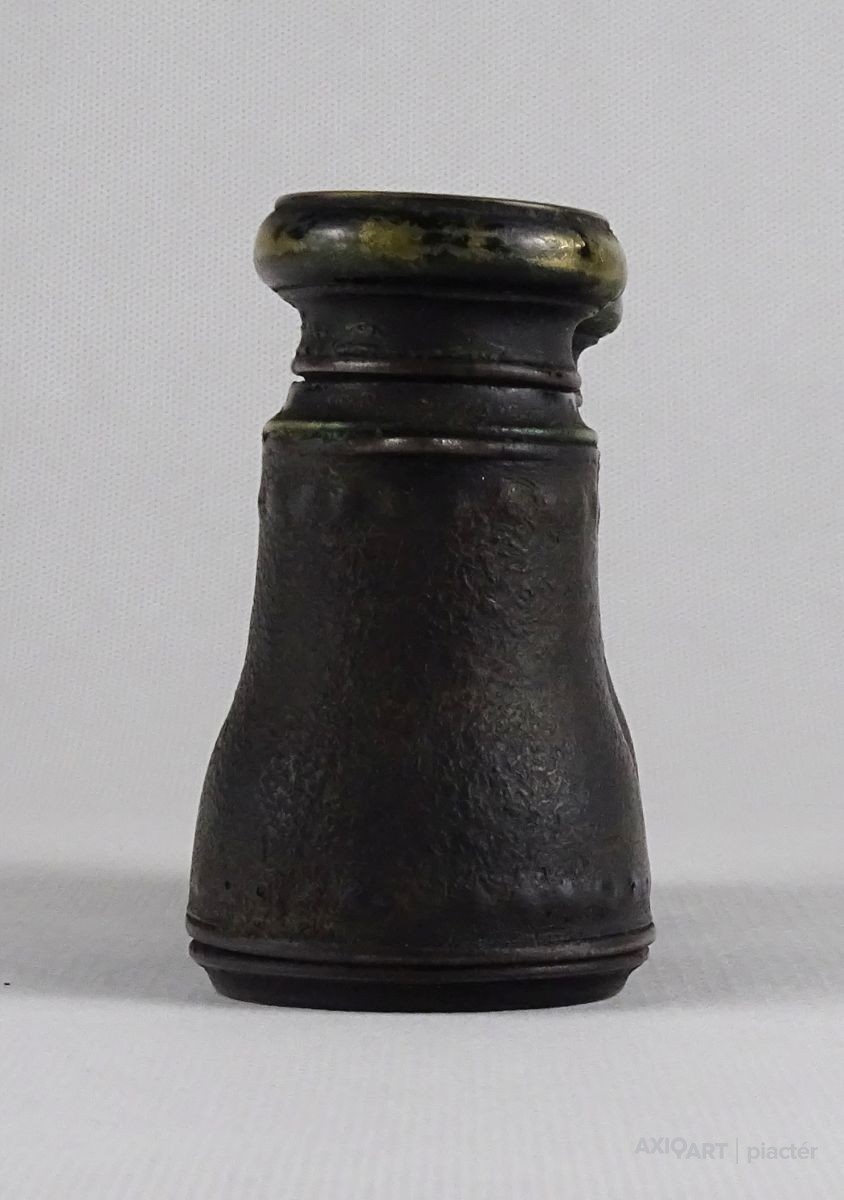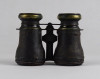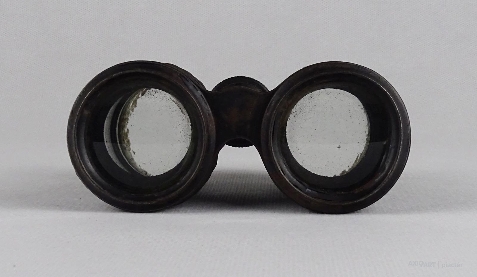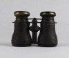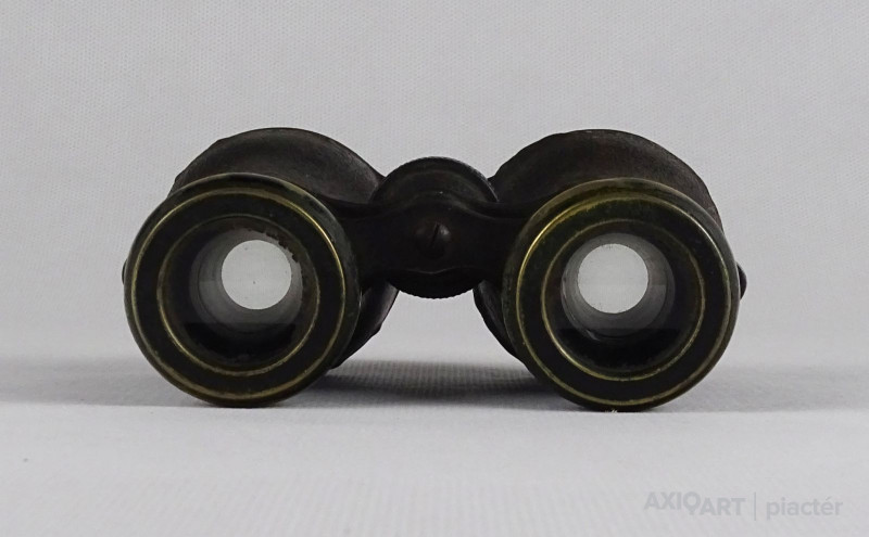 [1S879/Z034] Antik, fekete színű, bőrrel bevont réz testű távcső, látcső. Lencséi épek, felülete kopottas, patinás. Magasság: 5 cm Szélesség: 12 cm Hosszúság: 8.5 cm Súly: 0.315 kg   Méret: 10 x 4 cm. Súlya: 147 g.