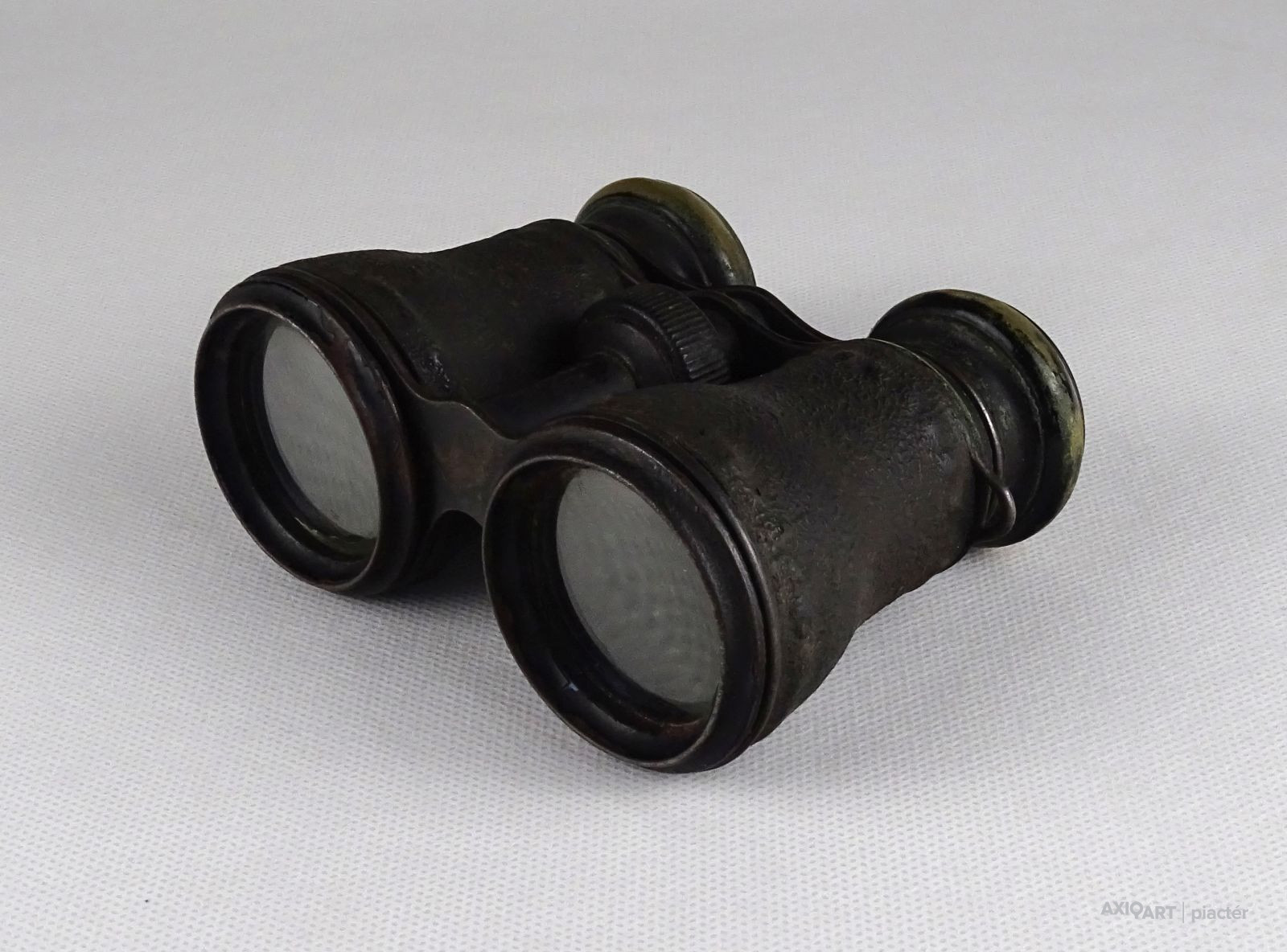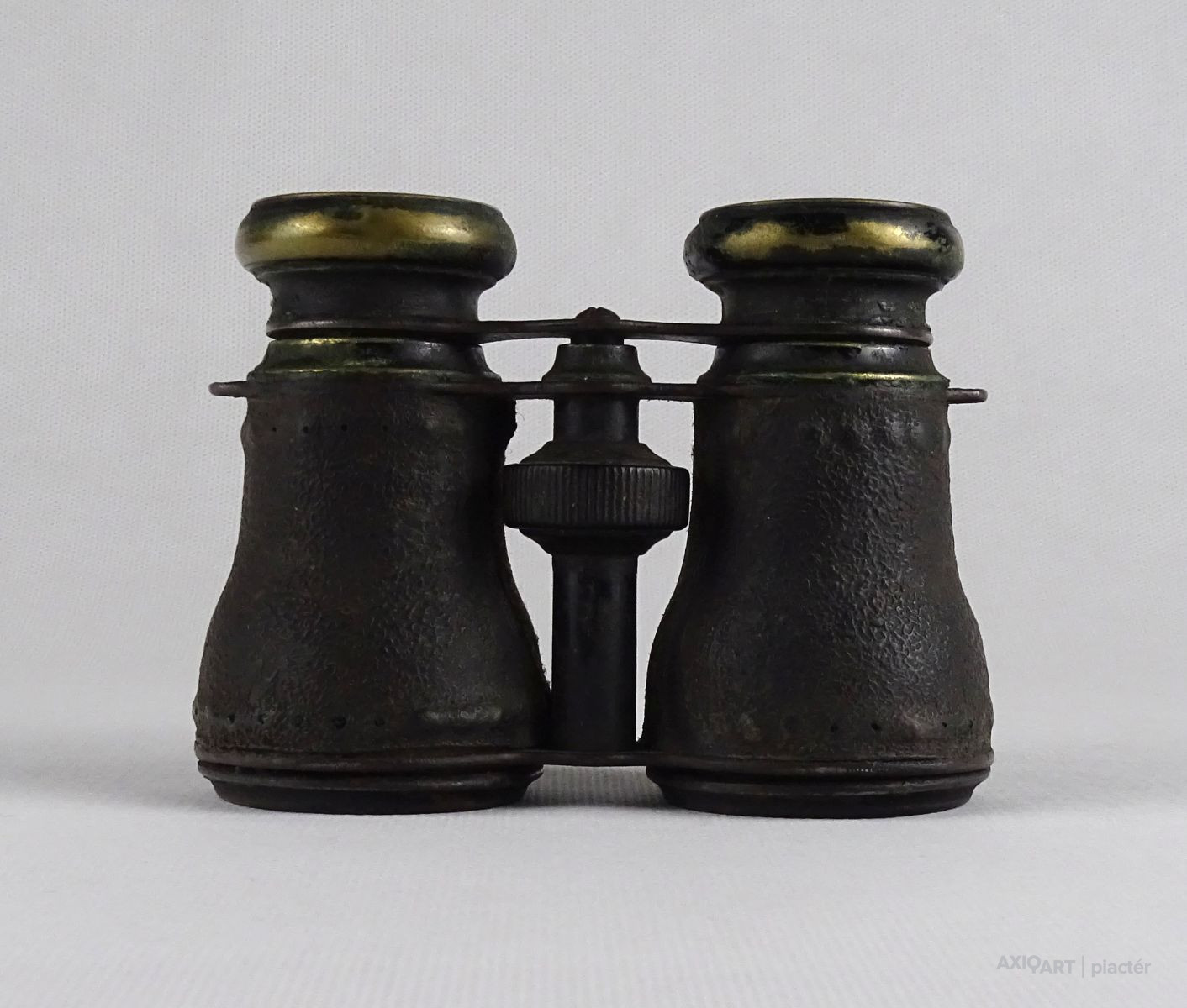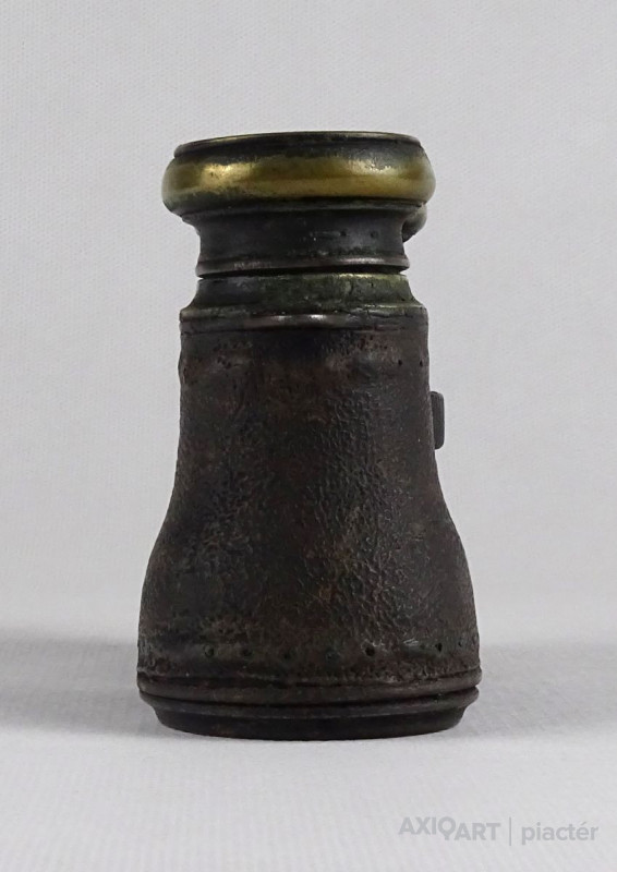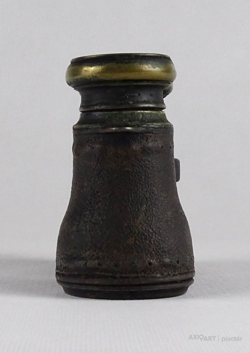 Antik, fekete színű, bőrrel bevont réz testű távcső, látcső. Lencséi épek, felülete kopottas, patinás.