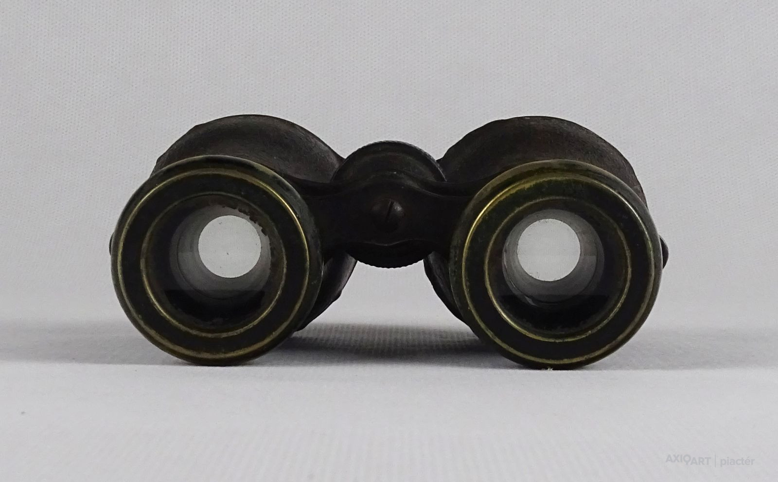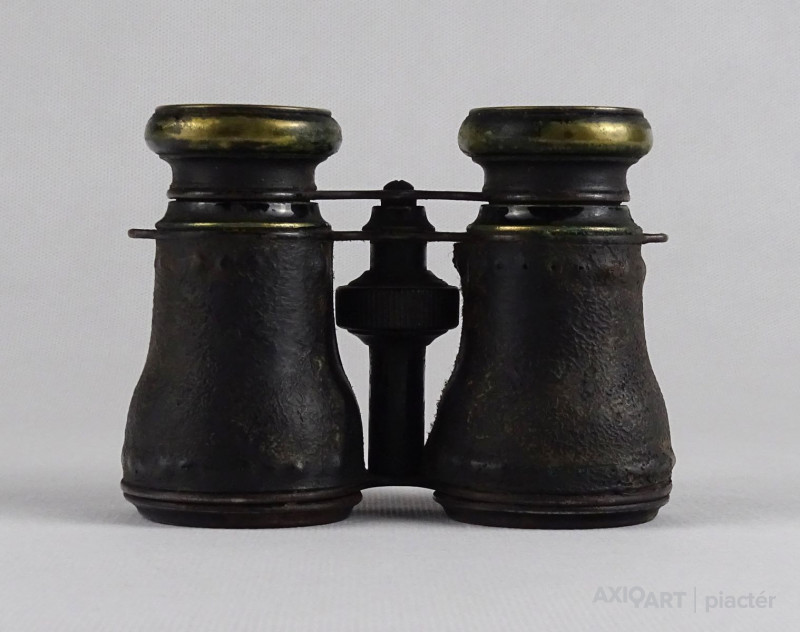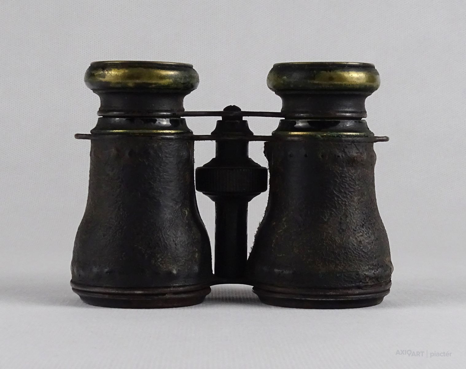 Antik, fekete színű, bőrrel bevont réz testű távcső, látcső. Lencséi épek, felülete kopottas, patinás.
