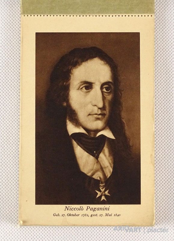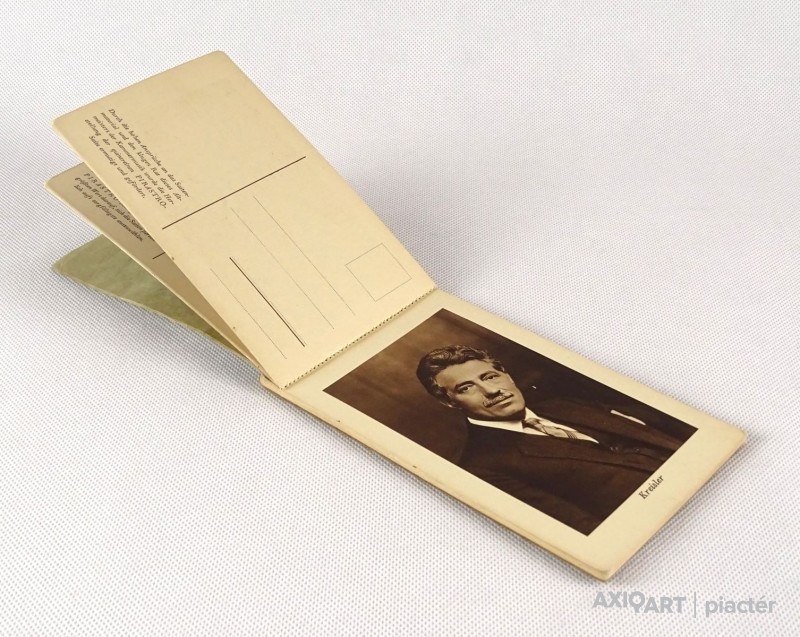 [1B178/X019] Antik, szép állapotú, tíz darabos képeslap füzet, tömb a XX. század első harmadából. Benne: - NICCOLÓ PAGANINI - JOSEF JOACHIM - KREISLER - PAU CASALS - MENGELBERG - CARL FLESCH - JOSEPH SZIGETTI - SEGOVIA - MISCHA ELMAN - EFREM ZIMBALIST Szélesség: 9 cm Hosszúság: 15.2 cm Súly: 0.06 kg