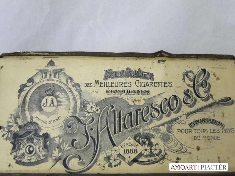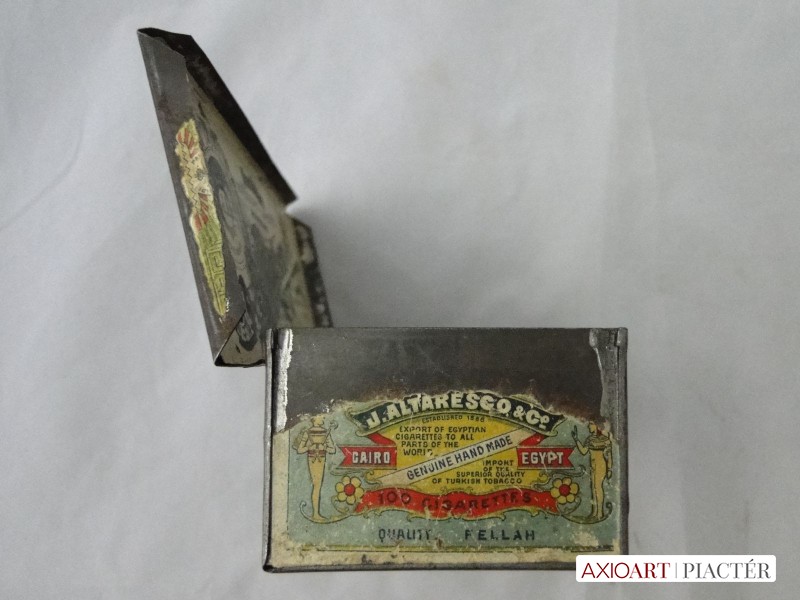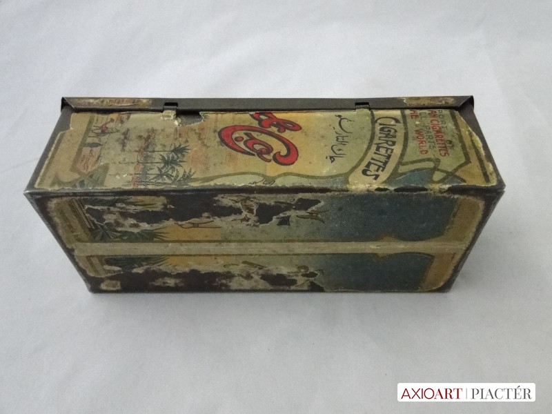 [6522/Y021/4] Régi 1910-es évekből származó antik egyiptomi fém cigarettás doboz, felhajtható tetővel. Rajta felirat TABACCO EGYPT WARESCO CAIRO EGYPT MOUSKY STREET Belsejében is egy antik papír egyiptomi cigaretta reklám látható. Súly: 0.097 kg