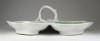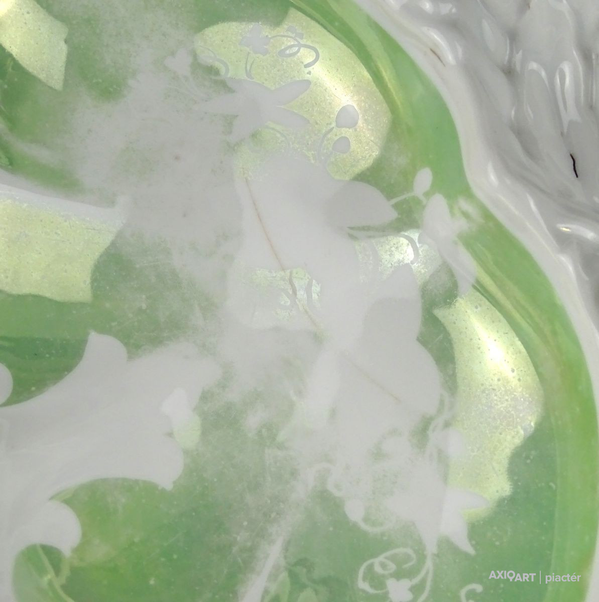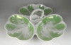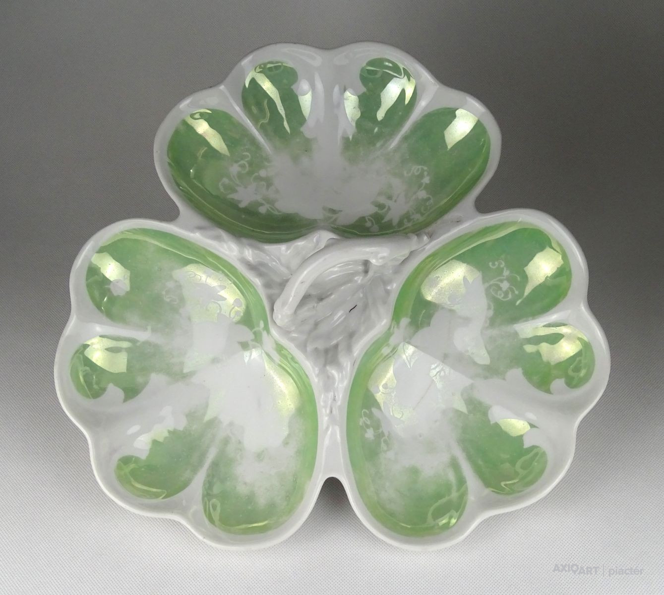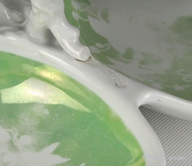 Antik vastag falú porcelán asztalközép kínáló tál a XIX. század végéről. Háromrészes, felülete zöld irizáló felület, indás, virágos, kopottas dekorációval. A tálon egy kisebb csillag alakú hajszálrepedés található, füle sérült, lásd fotó.