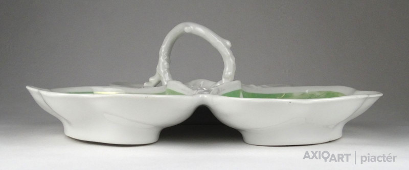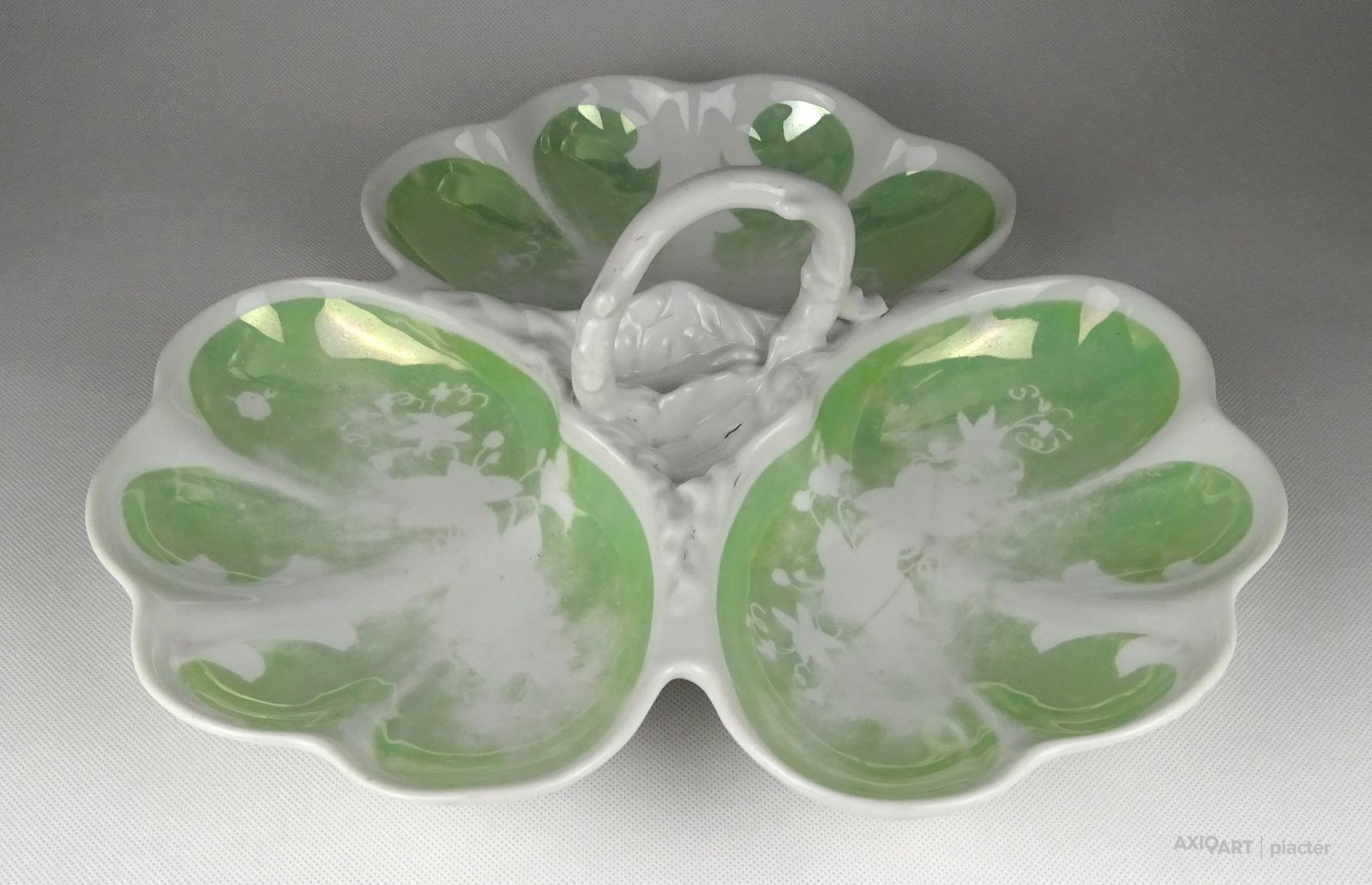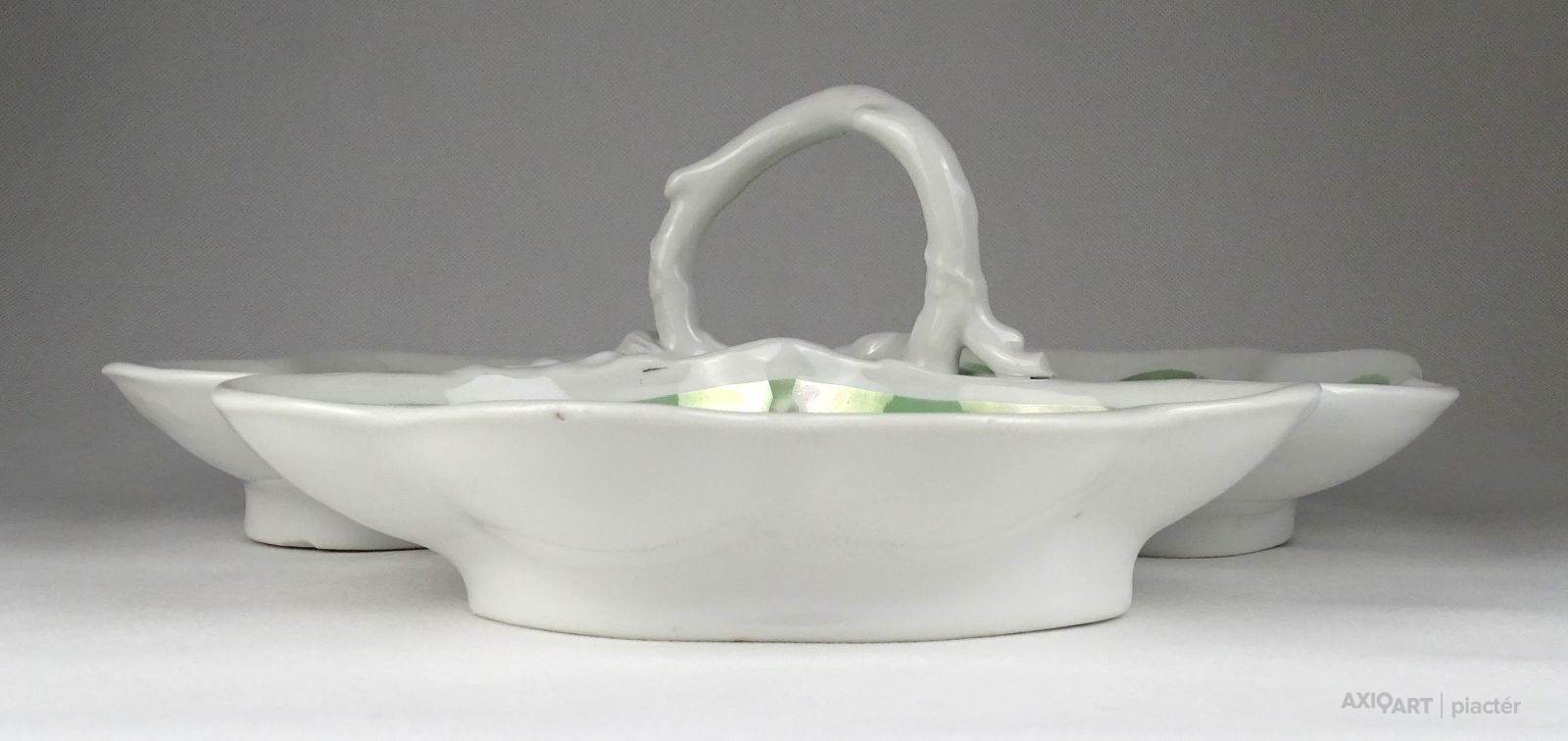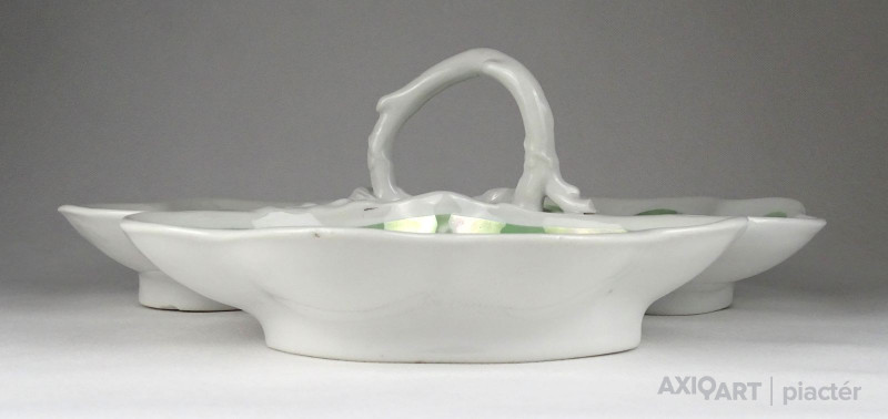 [1G972/X045] Antik vastag falú porcelán asztalközép kínáló tál a XIX. század végéről. Háromrészes, felülete zöld irizáló felület, indás, virágos, kopottas dekorációval. A tálon egy kisebb csillag alakú hajszálrepedés található, füle sérült, lásd fotó. Alján mélynyomással: 5A Magasság: 12 cm Szélesség: 34 cm Súly: 1.435 kg