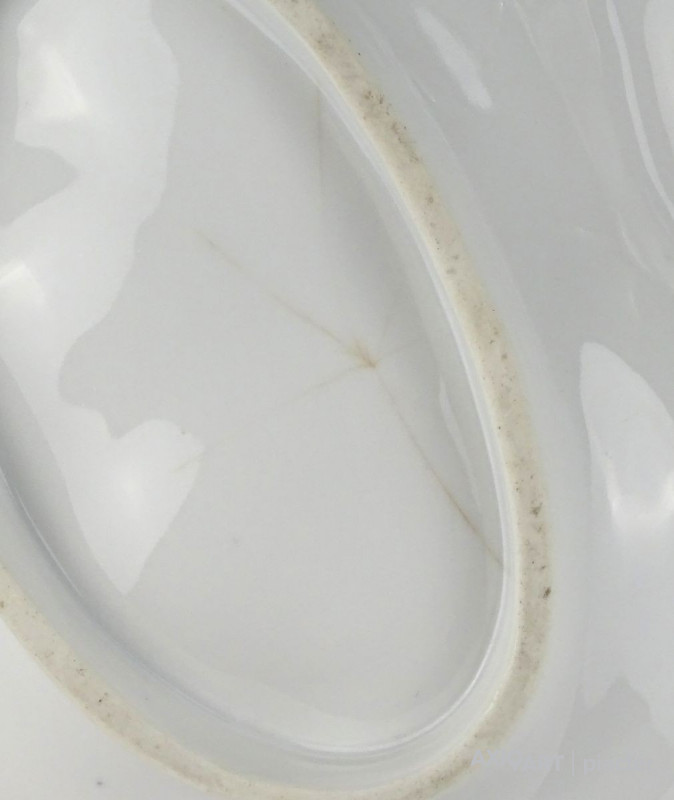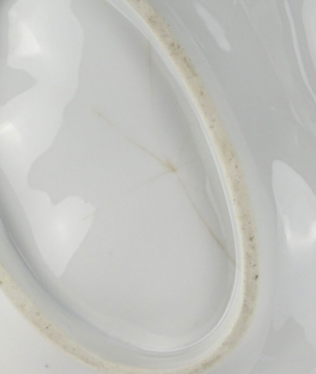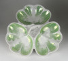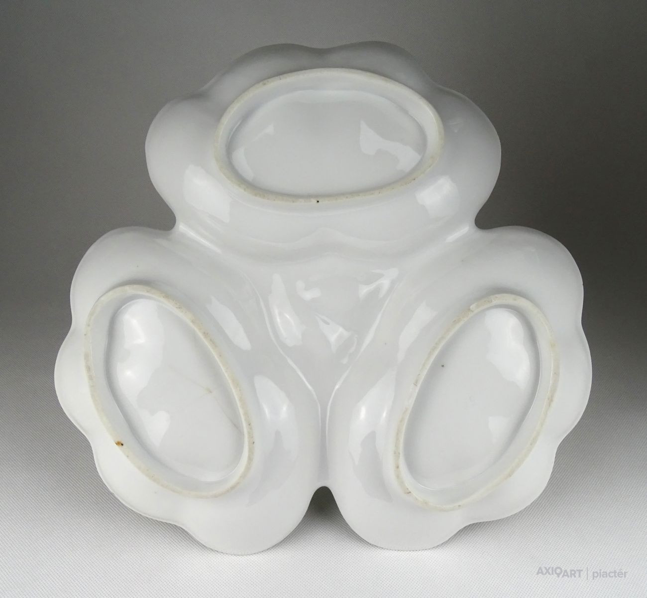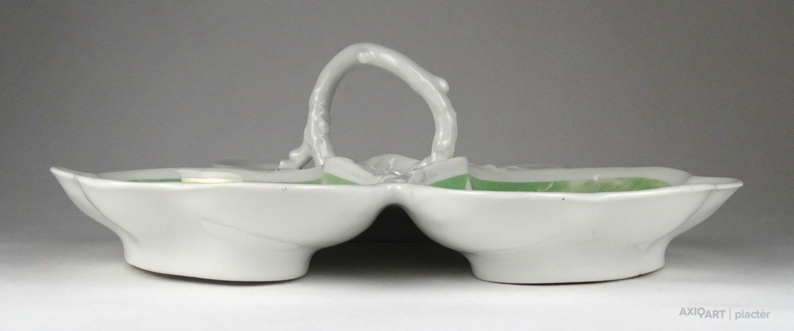 [1G972/X045] Antik vastag falú porcelán asztalközép kínáló tál a XIX. század végéről. Háromrészes, felülete zöld irizáló felület, indás, virágos, kopottas dekorációval. A tálon egy kisebb csillag alakú hajszálrepedés található, füle sérült, lásd fotó. Alján mélynyomással: 5A Magasság: 12 cm Szélesség: 34 cm Súly: 1.435 kg